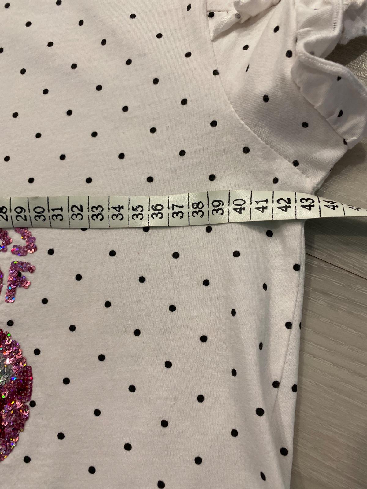 Predám toto tričko s menivými flitrami, veľkosť 164, miery 56,5 x 44 cm. Vpredu vpravo dole malý bledulinký fliačik, nejde to takmer vidieť., dokonca ani na fotke nie.