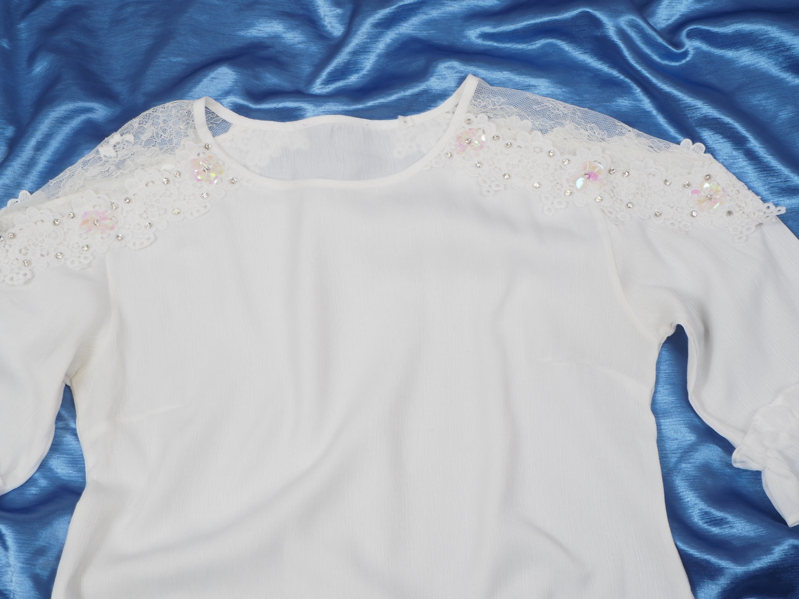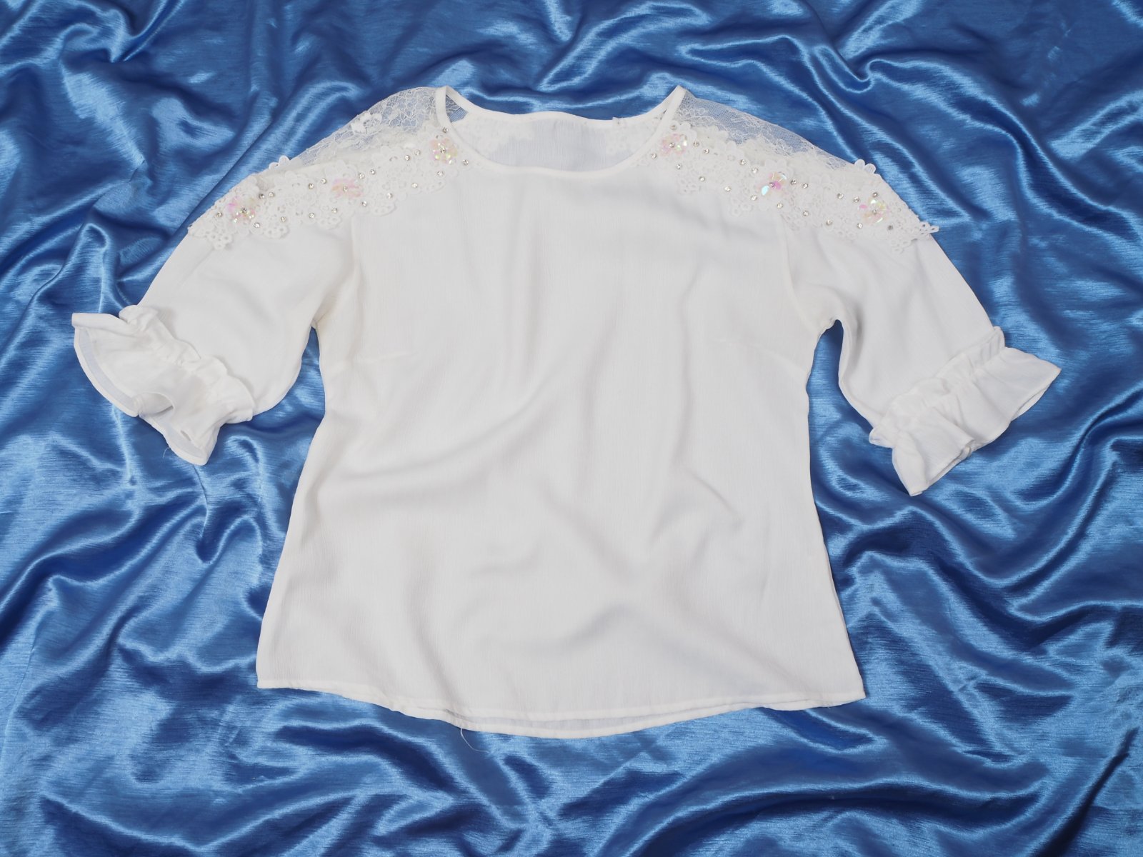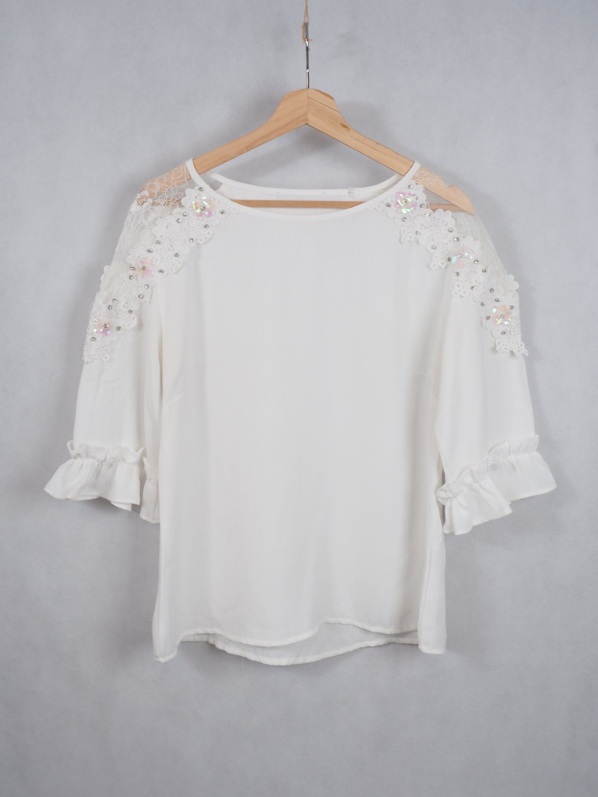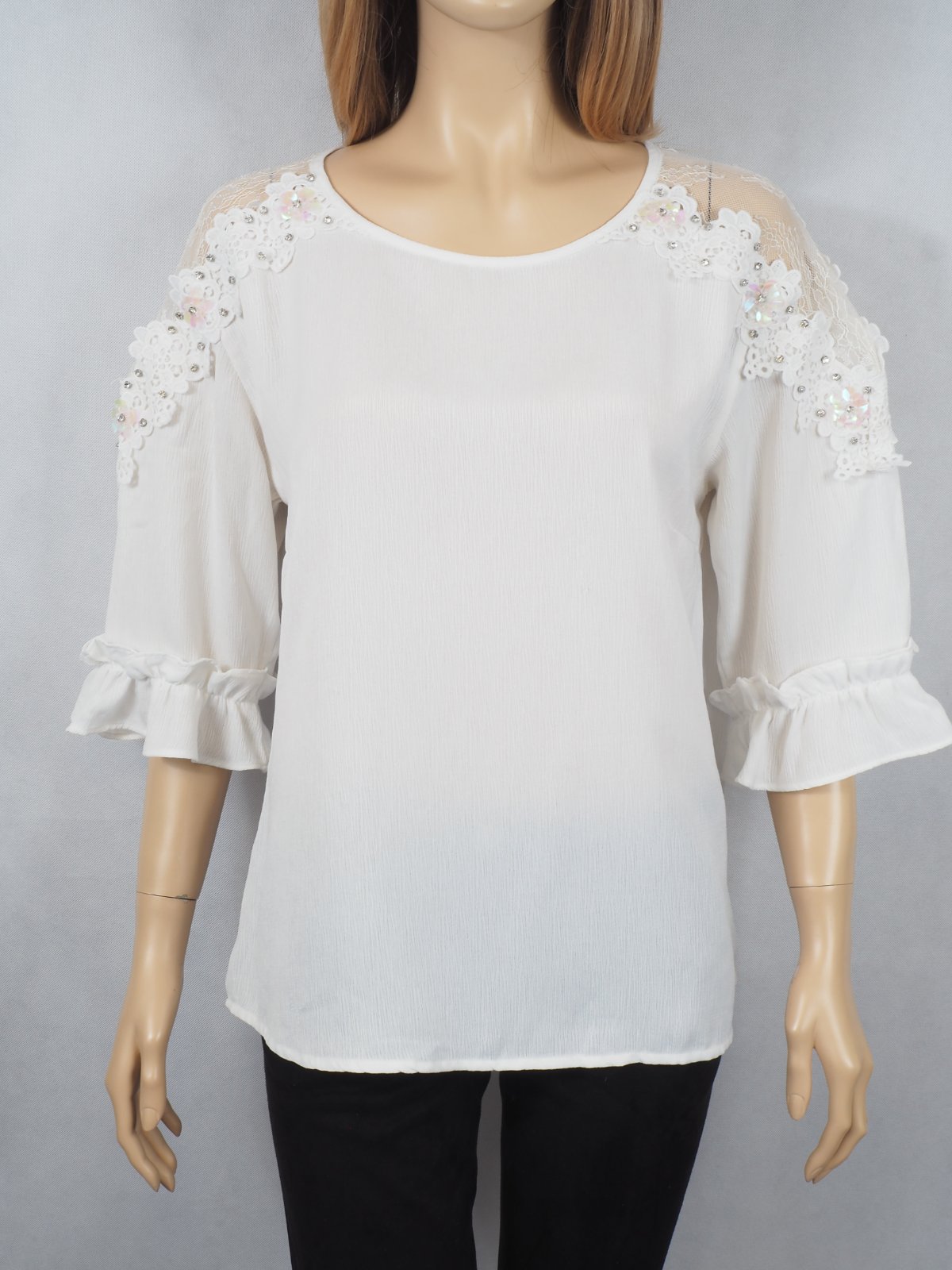 Kvalitný biela blúzka s čipkou, zdobená našitými kamienkami, materiál 100% polyester, volánový rukáv, super stav.