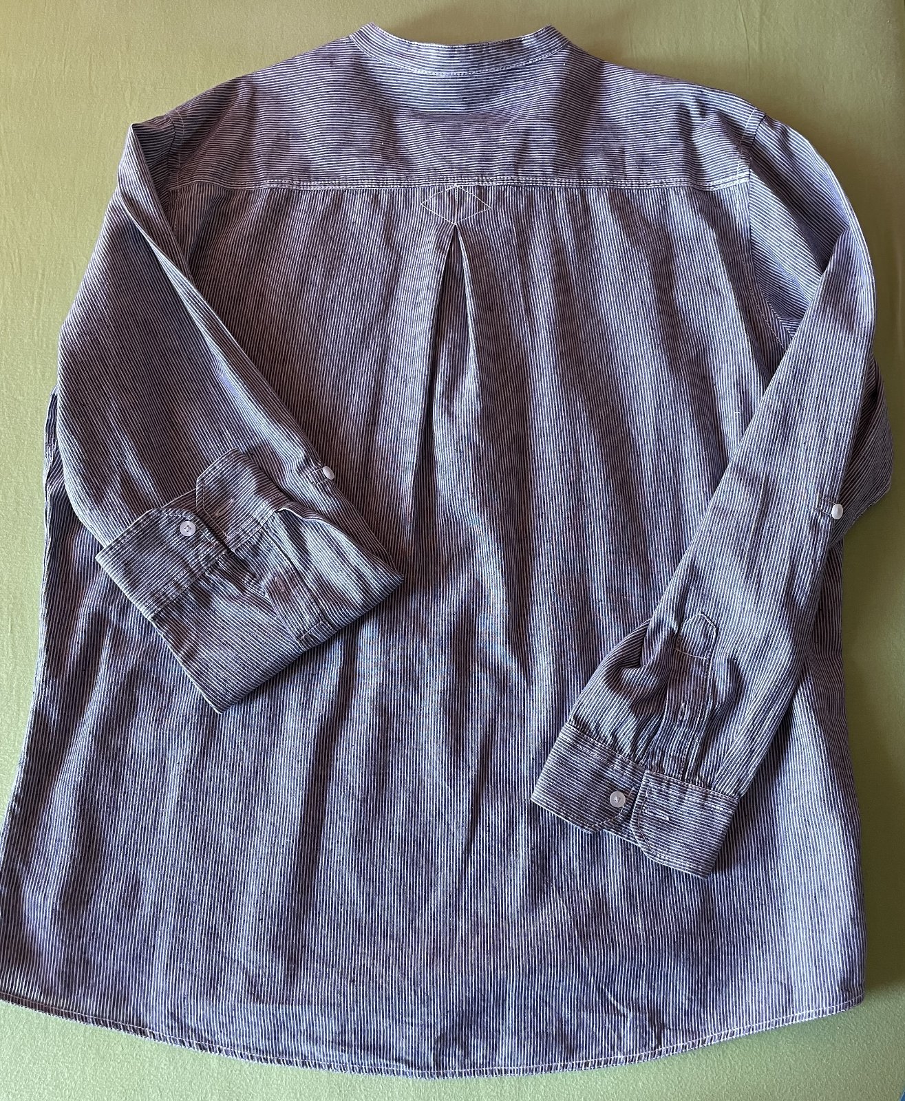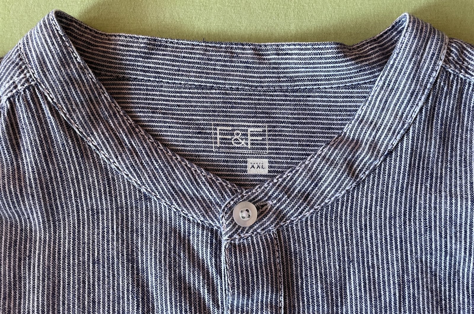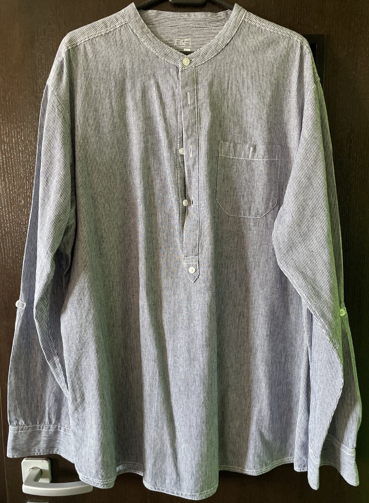 Pánska ležérna polokošeľa značky F&F s dlhým rukávom. Veľkosť XXL. Bledomodro-bila s drobnými pásikmi. Predný vačok, s nastaviteľnými rukávmi na 3/4. Rozmery: dĺžka 79 cm, šírka v podpazuší 2x68 cm, dĺžka rukáva od podpazušia 53 cm, od ramena 65 cm. Bez poškodenia, vo veľmi dobrom stave, málo nosená.