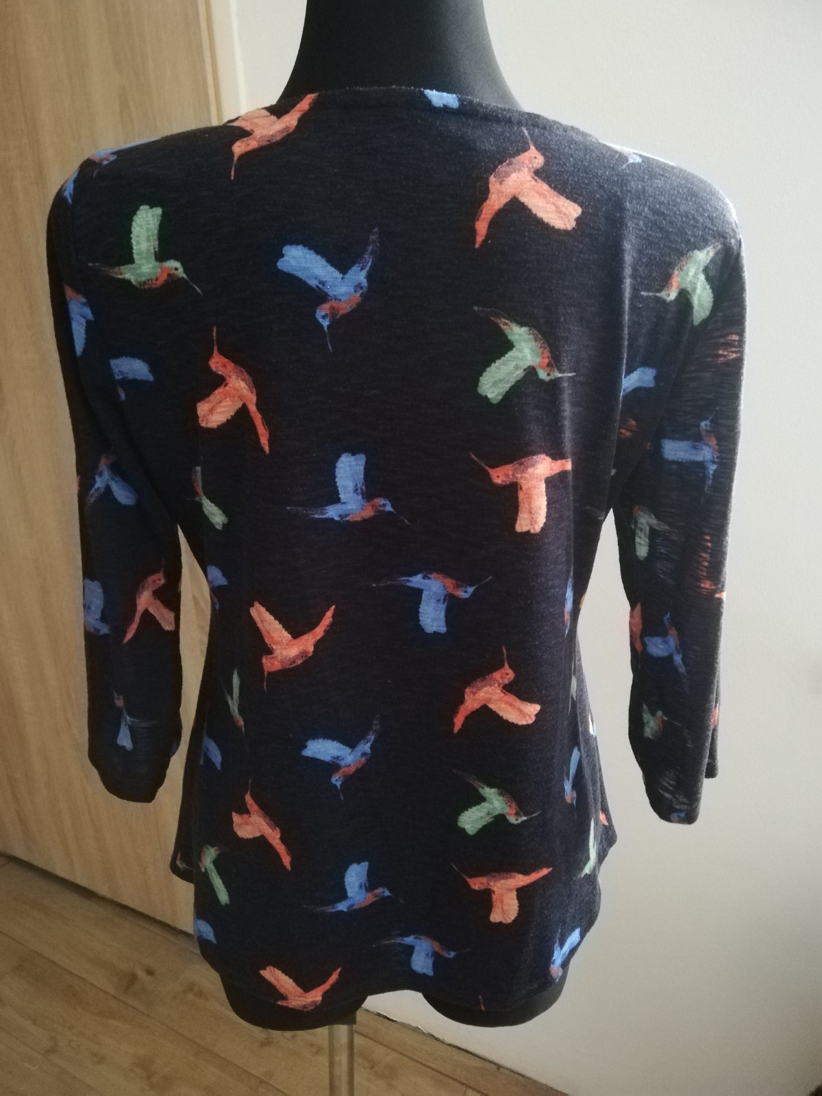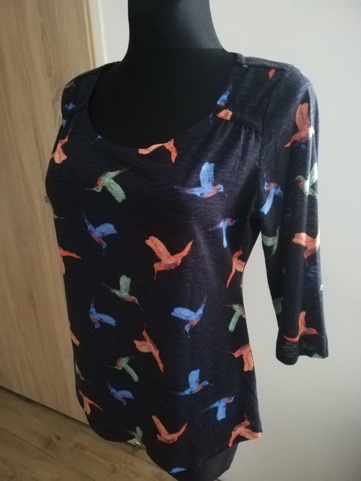 Predám pekné tenučké tričko, príp. blúzku v peknom stave. Je na nej anglická veľkosť 14. Farba je tmavomodrá. Vhodné skôr pre ženy s väčšími prsiami. Výstrih je troška hlbší. Rozmery: obvod cez prsia 104vm, natiahne sa cca do 110cm. Dlzka od pleca dole 65cm,rukav od pleca 43cm.