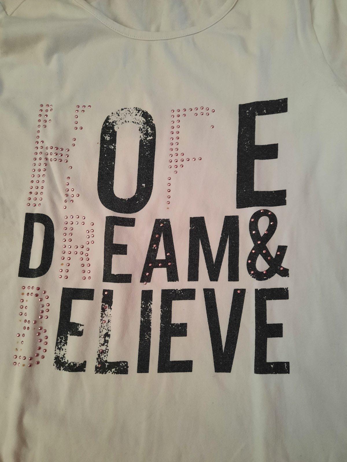 Bavlnené tričko s nápisom vpredu. Niektoré písmená sú už mierne ošúchané, nejaké kamienky olúpnuté. Z boku sú gumou nariasené.