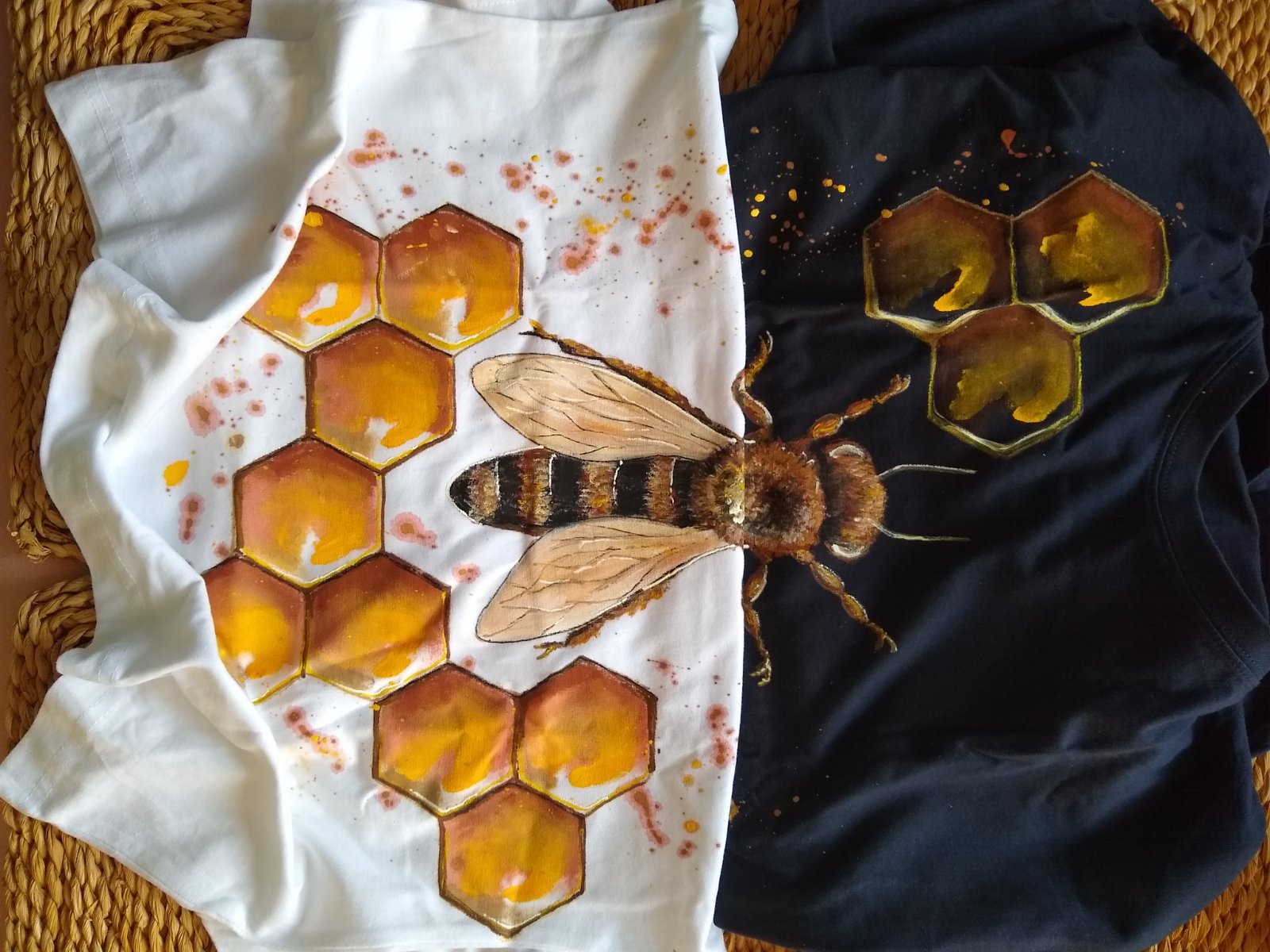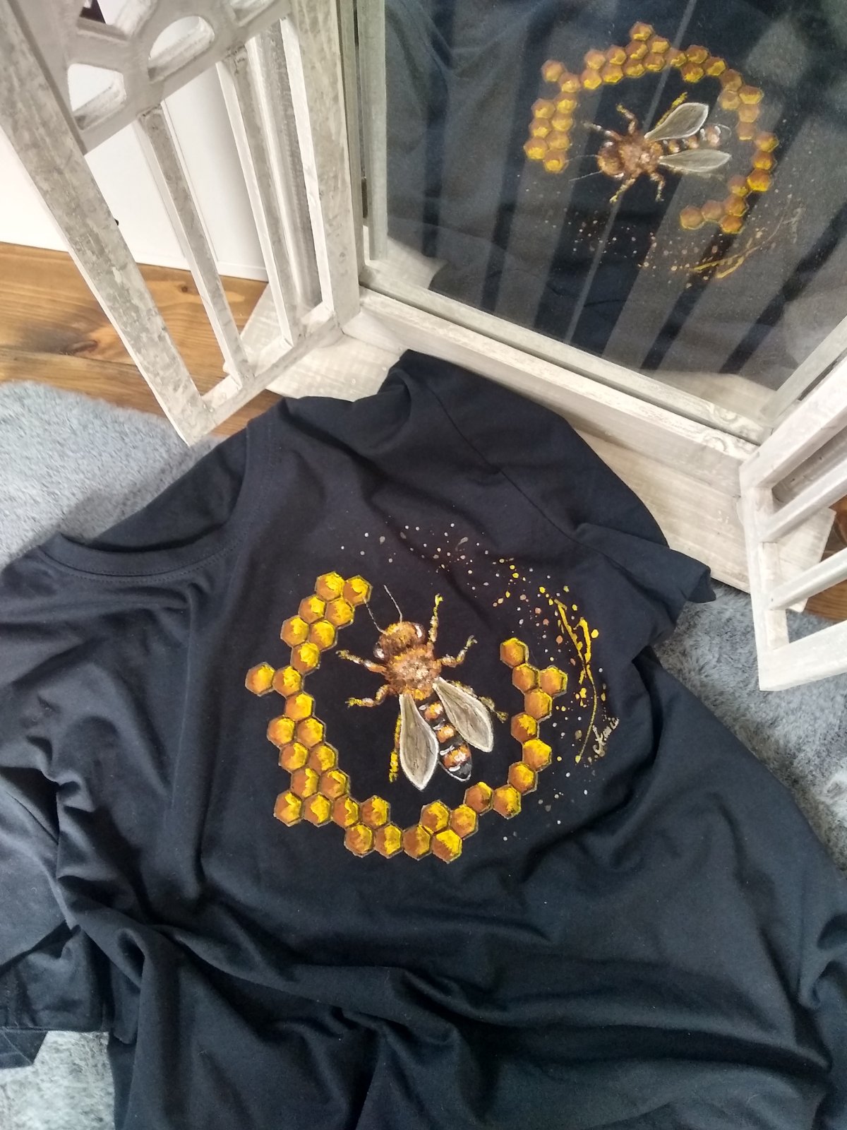 Príjemné bavlnené tričko zdobené včelárskou tematikou. Maľovala som farbami na textil. Prať je možné do 40°C alebo ručne a s láskou, s akou aj ja maľujem. Tričká sú vhodné aj ako darček, v tom prípade vám viem aj darčekovo zabaliť do papierovej škatulky s okienkom+2e. Tričká viem vytvoriť aj v detskej veľkosti /19e.) V ponuke aj vankúš a taška s včelou. (23e.) V ponuke aj motív decentná včela-menšie plásty, menšia včela umiestnená naboku-24e.