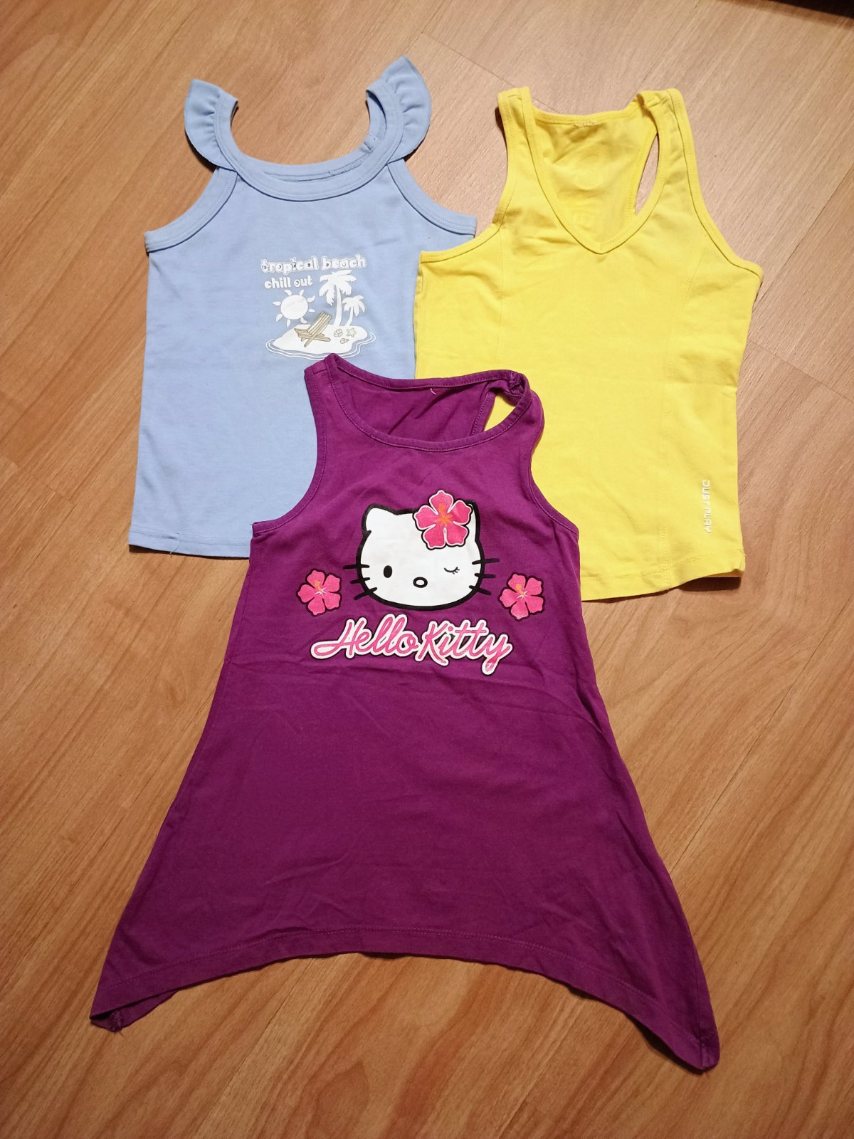 Tričká, šírka 2x30-31 cm. Žlté má vzadu nápis. Cena za kus.fialove hello Kitty 1,10 €.