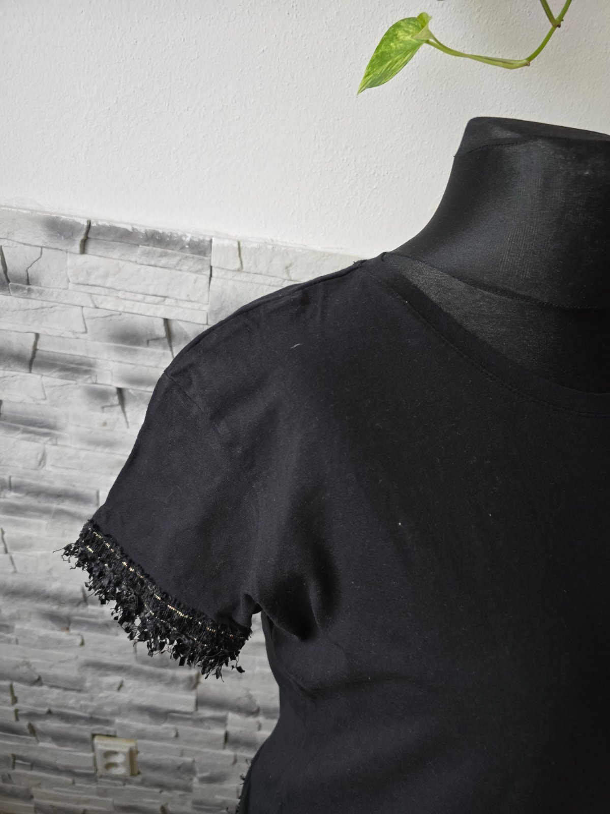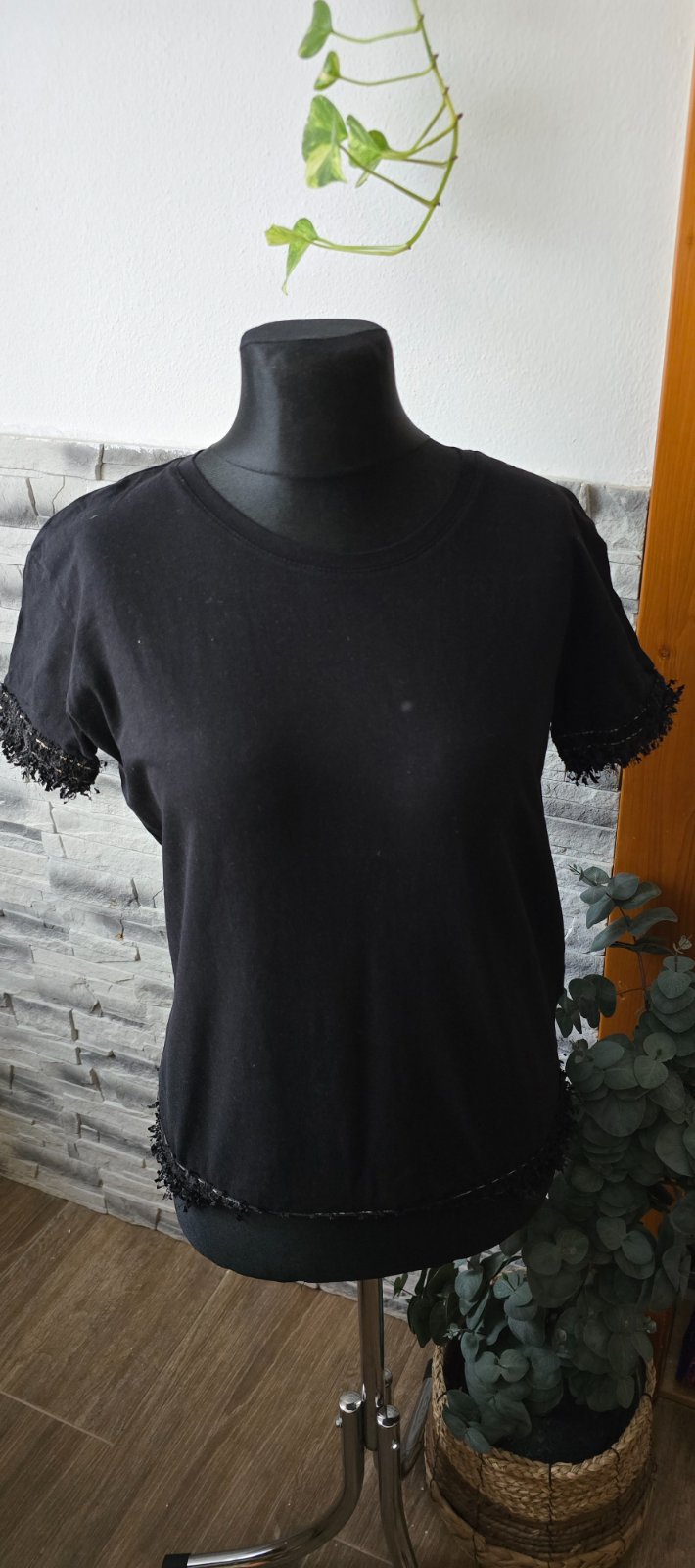 Čierne krátkorukávové tričko s ligotavým motívom, bez chýb a poškodení. Rozmery: dĺžka- 60 cm obvod pŕs- 42 cm obvod ramena- 40 cm