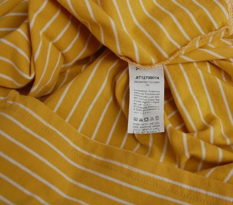 Dámske žlté tričko s krátkym rukávom, bielymi horizontálnymi pásikmi a malou vyšívanou aplikáciou ananásu na hrudi.