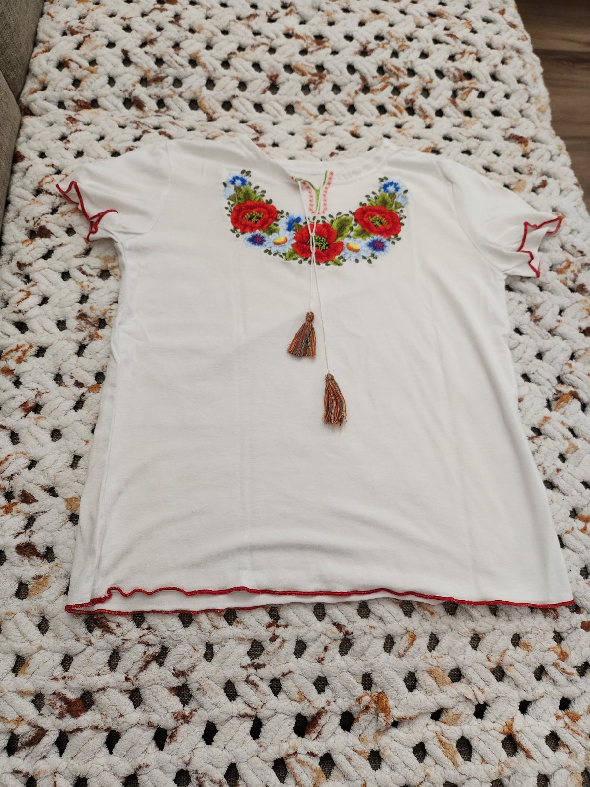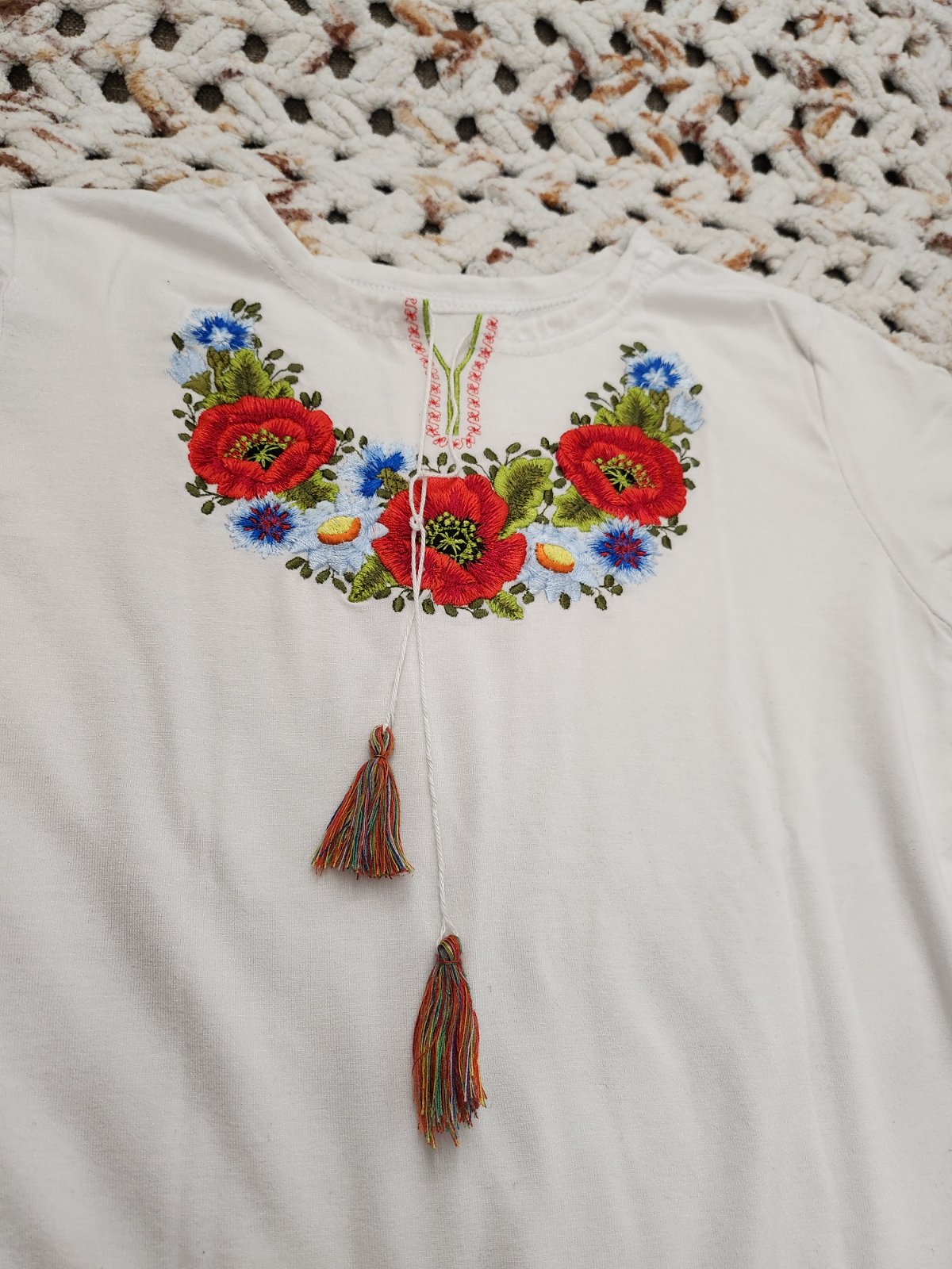 Biele tričko s ľudovým motívom.
