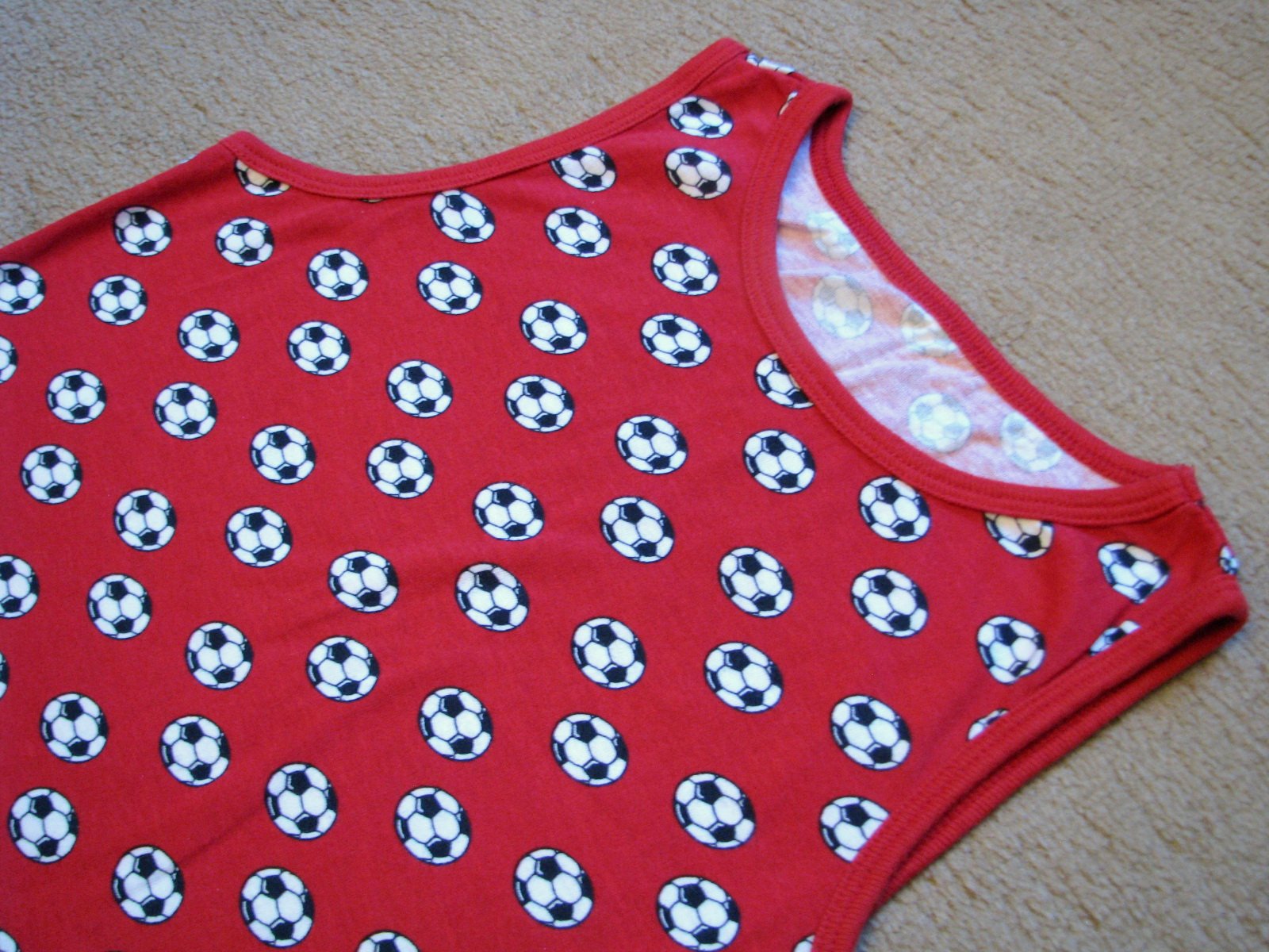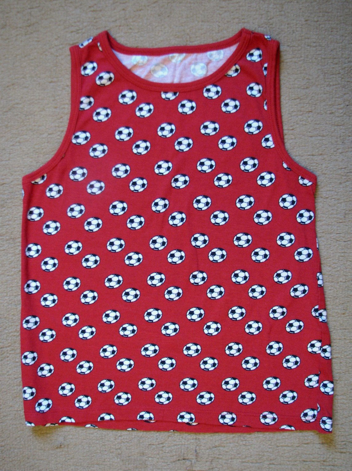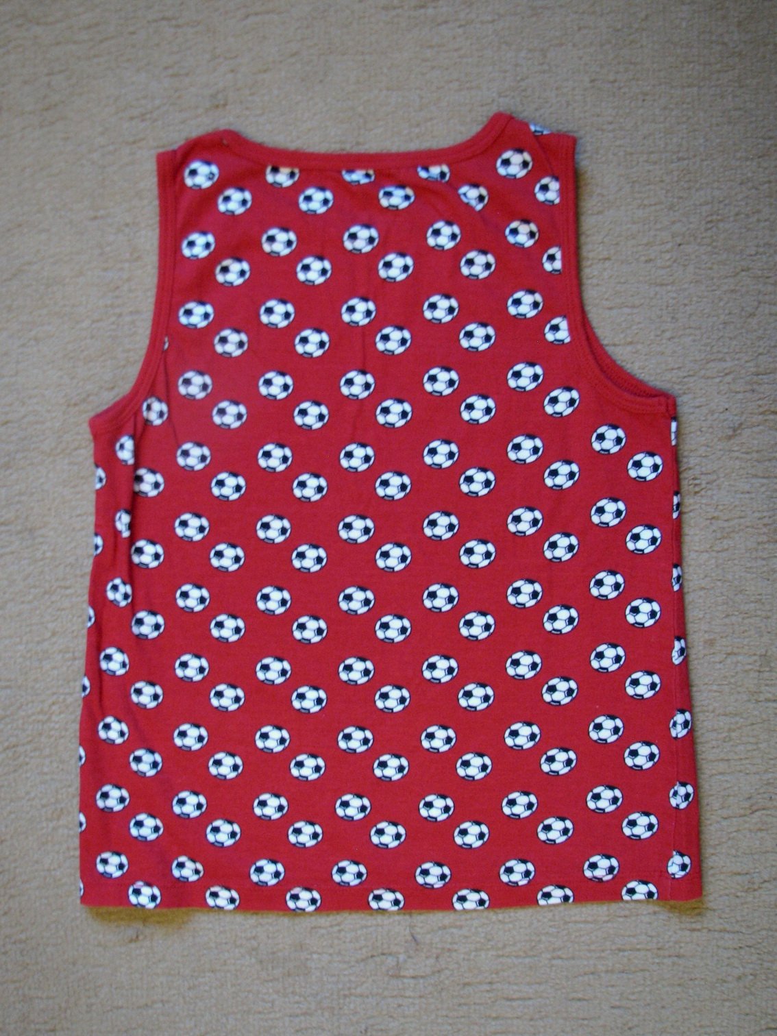Bavlnené tmavšie červené tielko s futbalovými loptami, unisex. Výborne zachovalé, bez poškodení. Veľkosť len veľmi nahrubo odhadujem tak na cca 3 - 4 ročné dieťa (možno som odhadla zle, radšej si prosím v prípade záujmu vypýtajte rozmery).