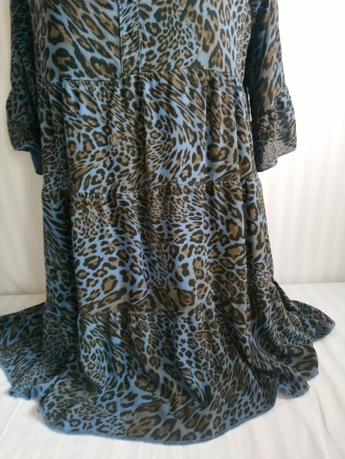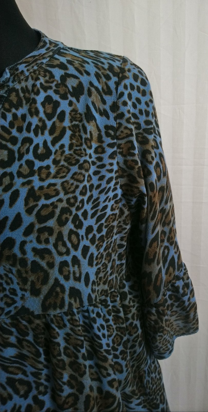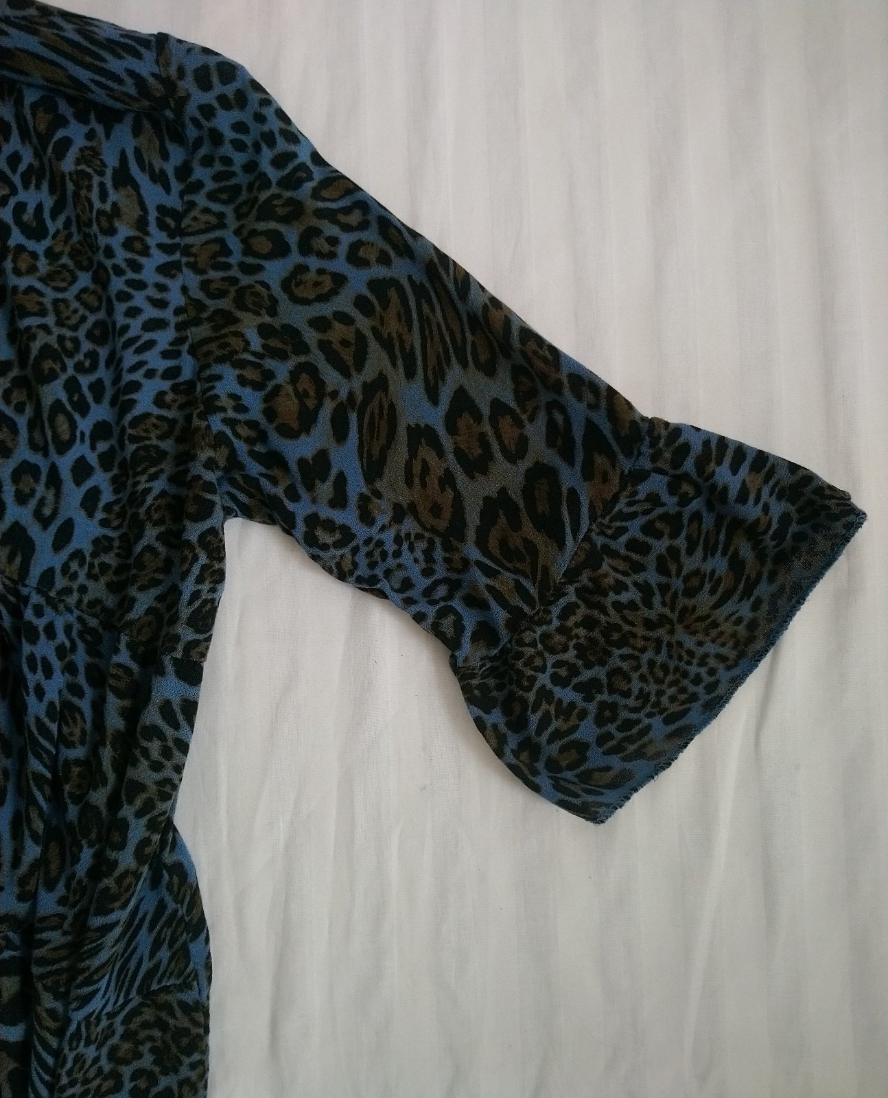 dámsky predĺžený modrý top s hnedo čiernym vzorom, 3/4 rukáv, rozšírený strih,