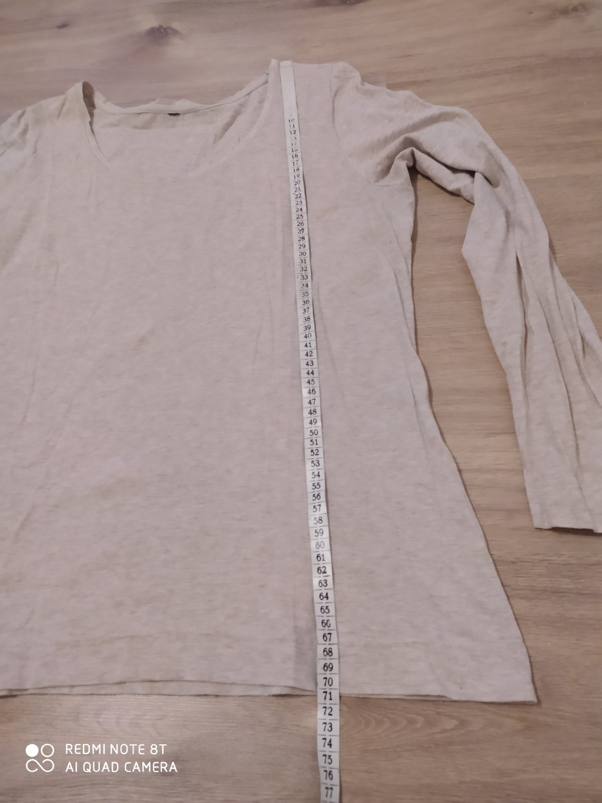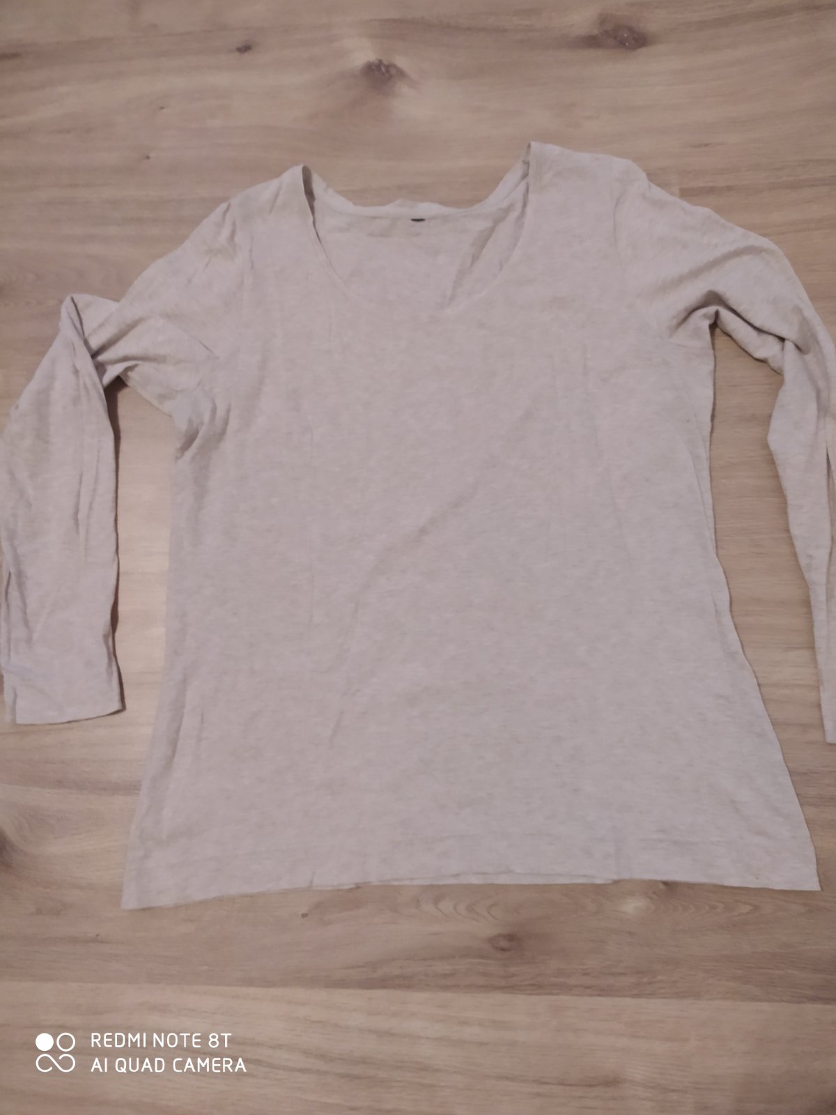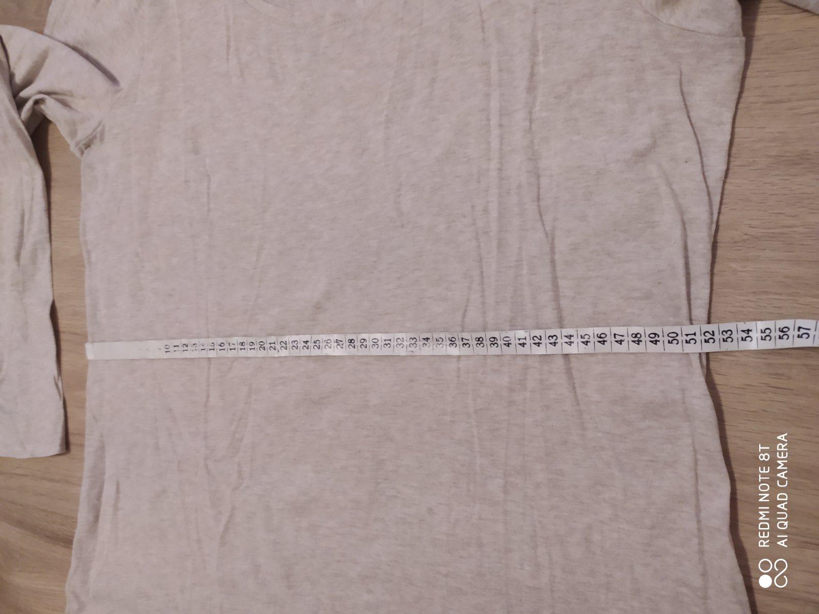 Veľ.: XL Farba: krémová, takmer nenos., skoro nové. Miery: prsia 48/53, d-63 cm Vpredu okrúhly výstrih, vzadu do V. Rukávy dlhé, rovný dolný okraj. Vzadu s modernou čiernou potlačou. Jemný, mäkk...