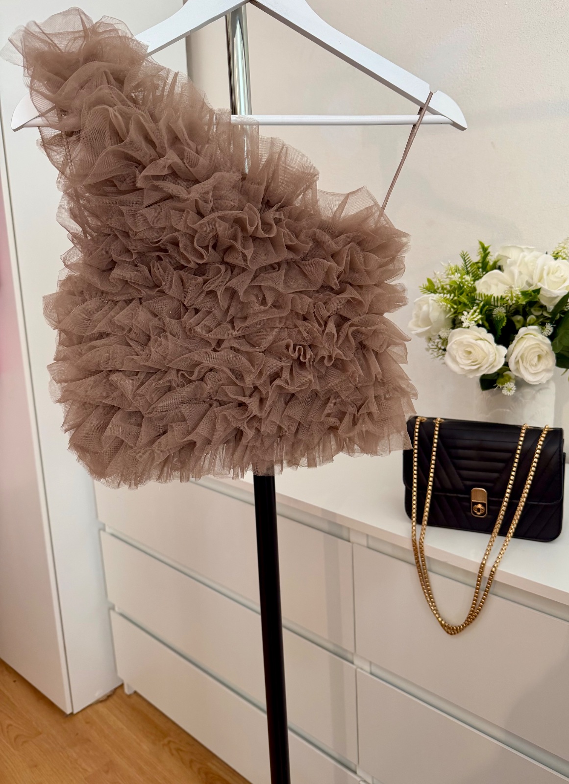Luxusný ZARA top na jedno rameno s bohatými tylovými volánmi v elegantnej nude / champagne farbe.