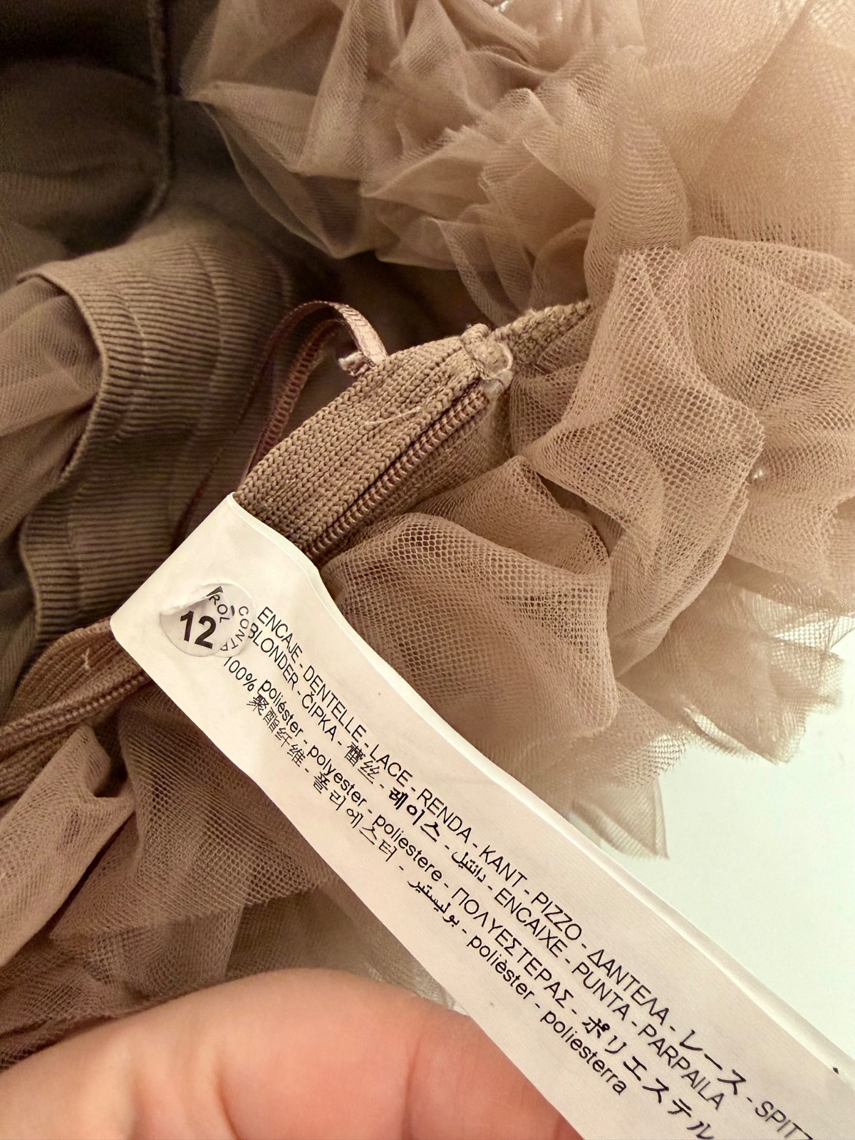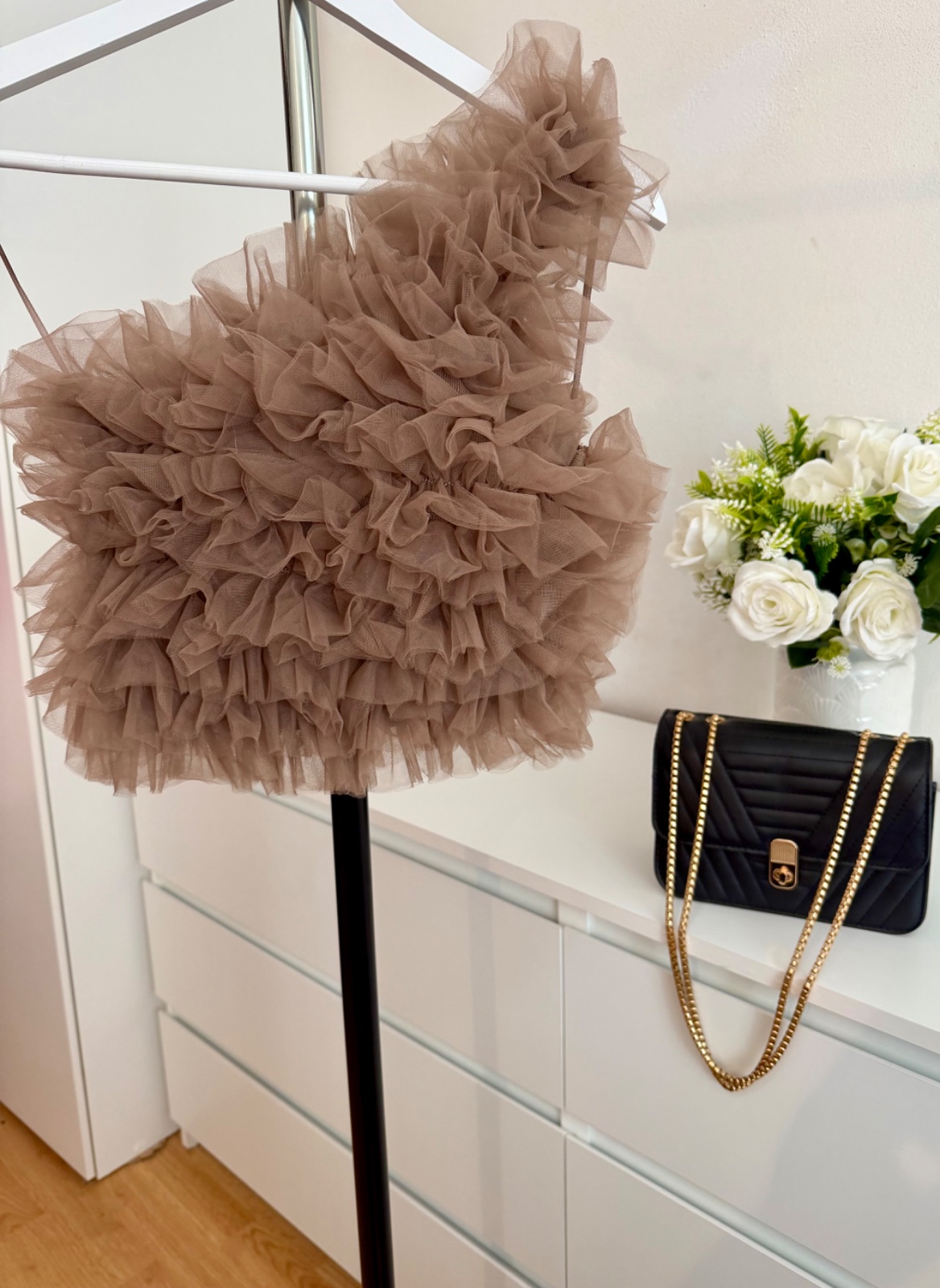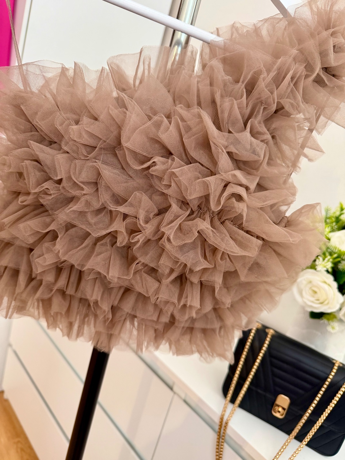 Veľmi efektný statement fashion kúsok, ktorý pôsobí ako couture dizajnérsky top. Vrstvený tyl vytvára nádherný objem a dramatický look.