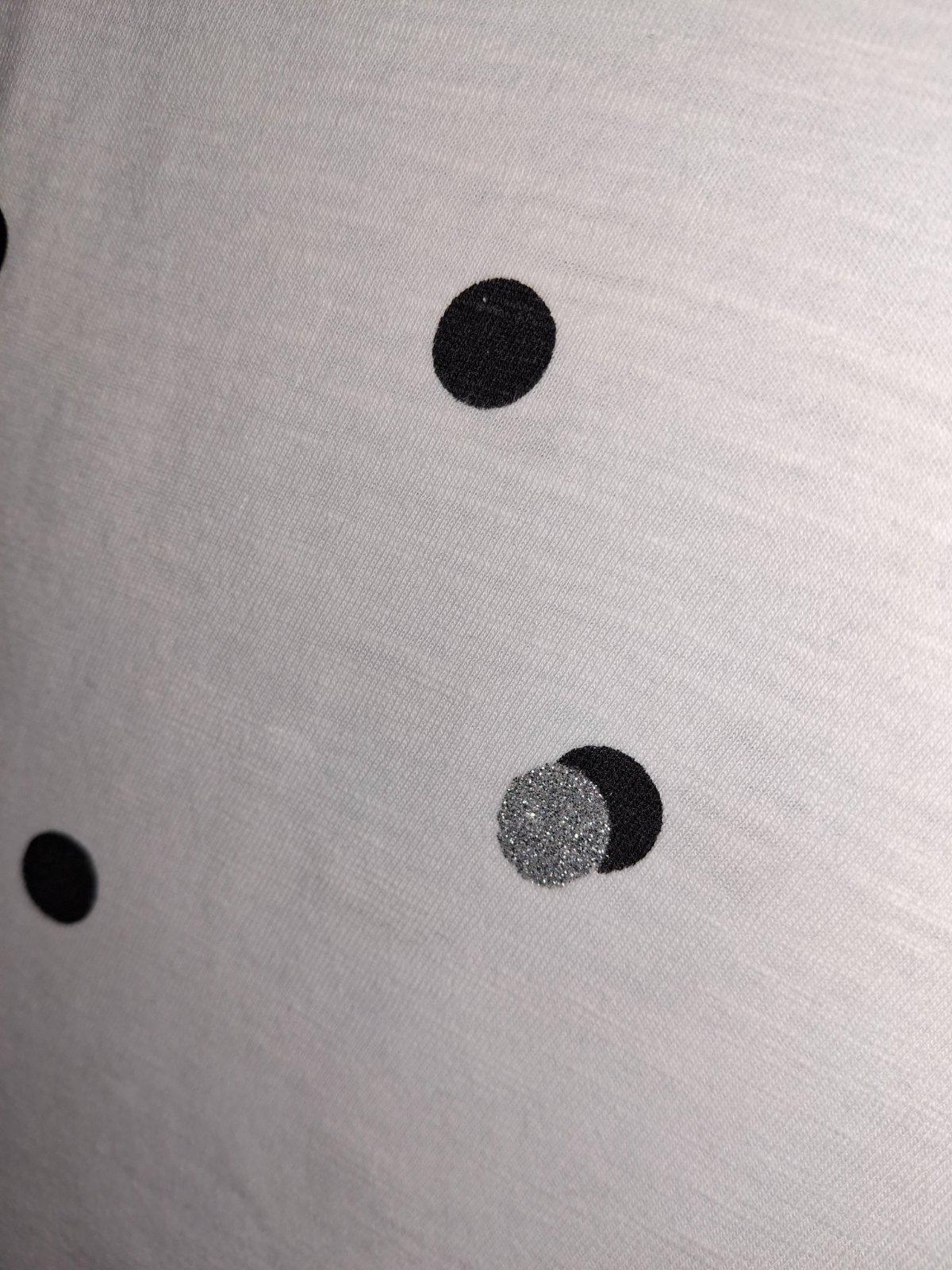 Dvojvelkost 158-164. Krásne biele nezadubene. Rozmerydodam. Kruhy sú čierne a strieborne. Dĺžka 56-58cm (zadný diel je o 2 cm dlhsi od predneho), šírka 42cm,rukáv 60/49cm, rameno 7cm