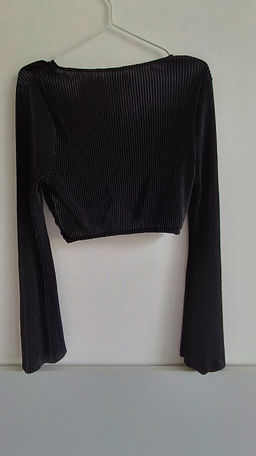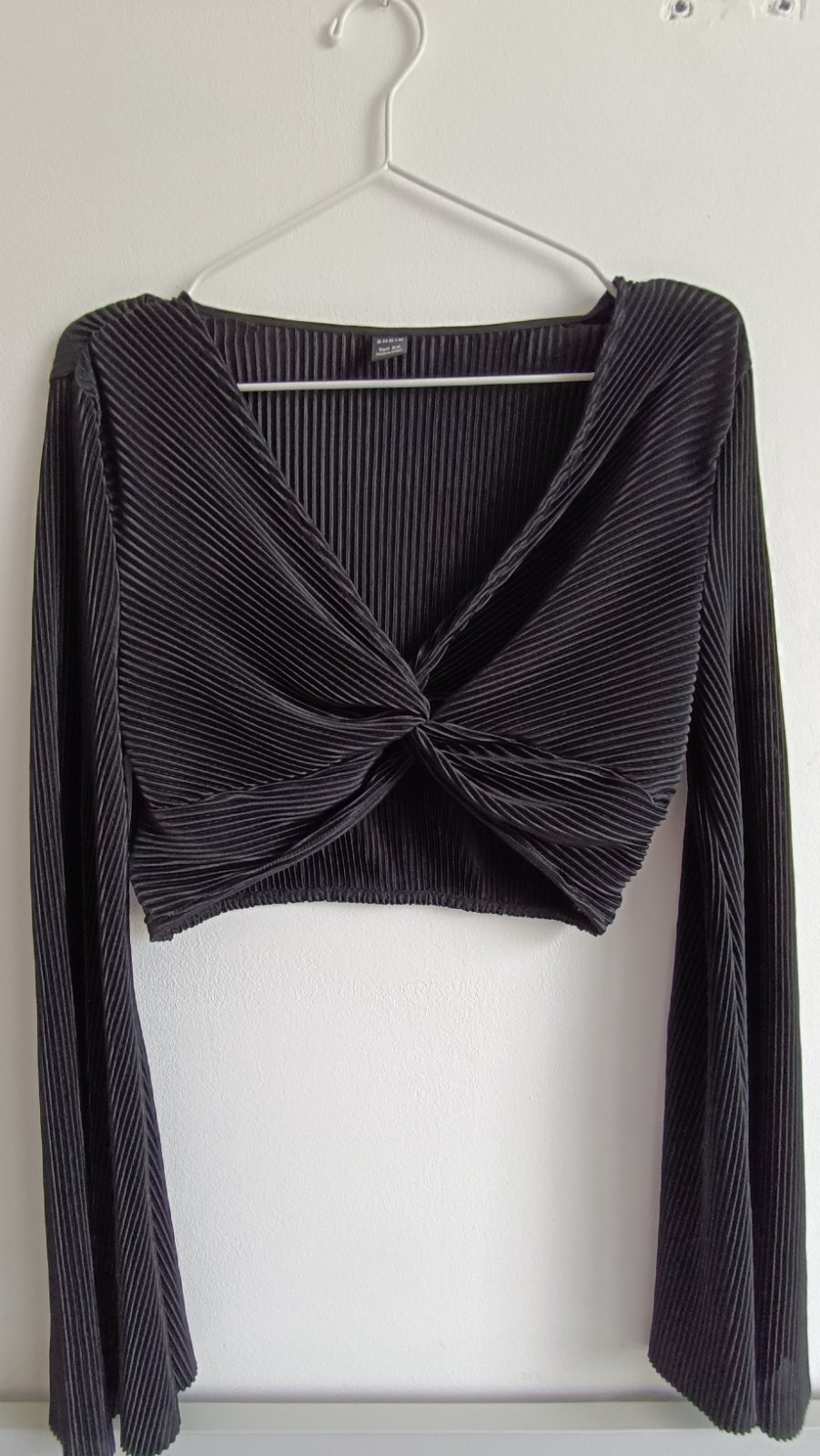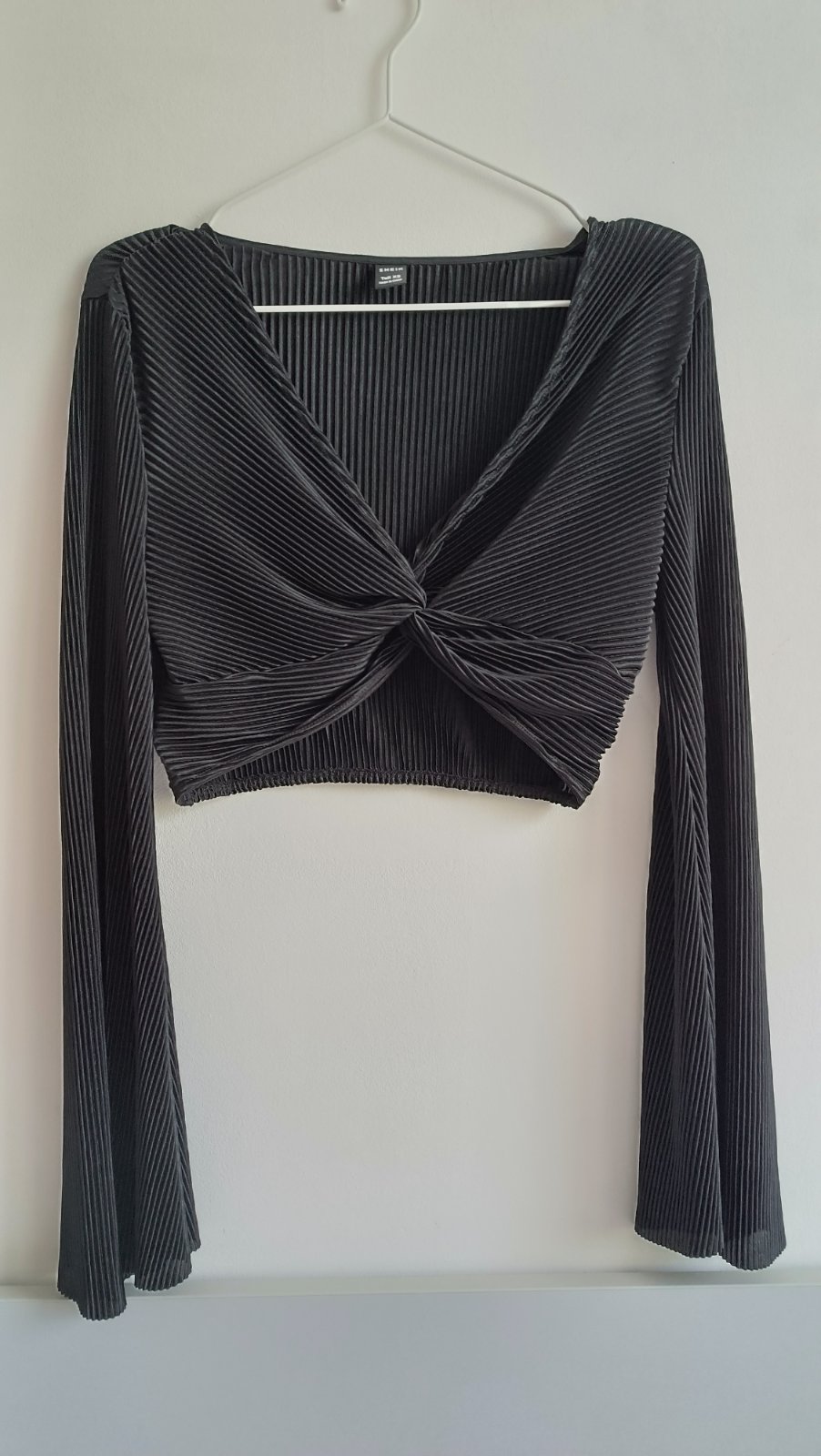 Vpredu zaujímavo riešený top, rukávy sa rozširujú, vhodné na leto, dĺžka 37 cm, na spodu všitá gumička, šírka 36cm, rukáv od pleca 64cm, 100% polyester