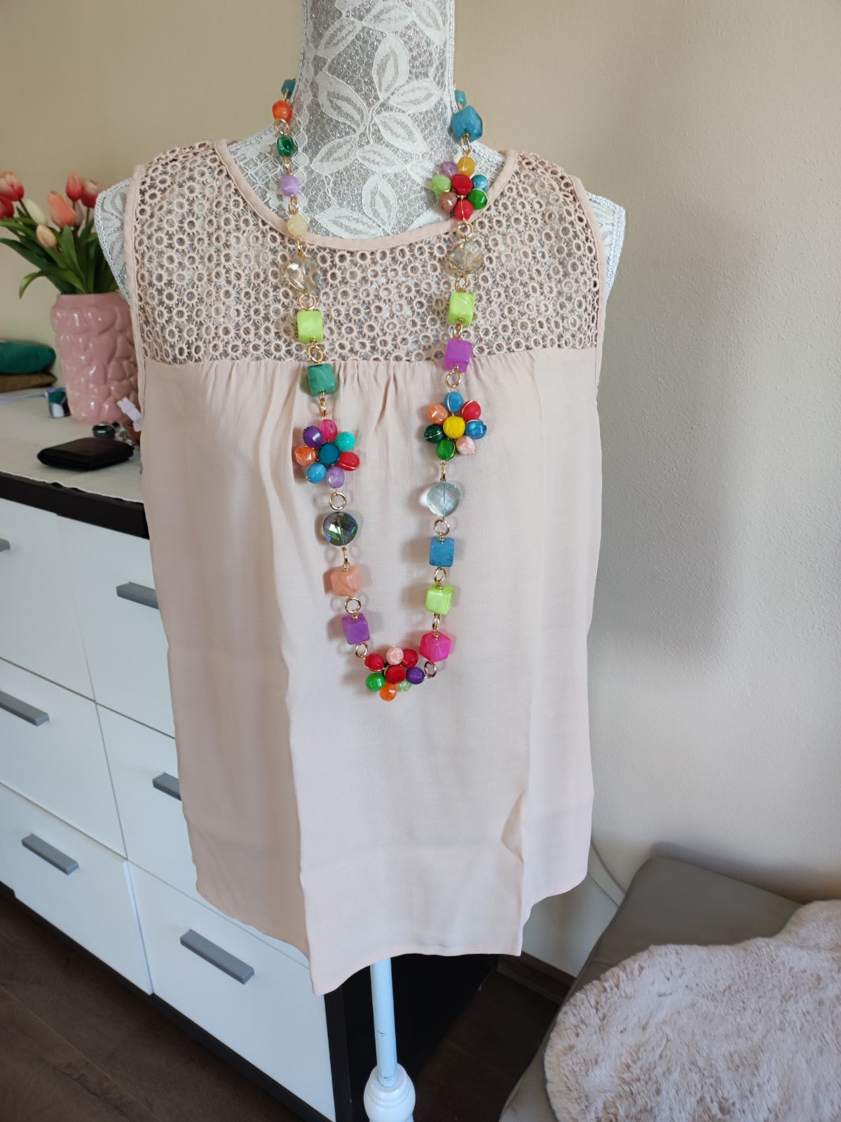 Len 1x oblecene..vzadu sa stahuje snurkami takze sa prisposobi roznej velkosti obvodu cez chrbat.. cez chrbat pod prsiami 51cm max.. 42cm.dlzka 62cm