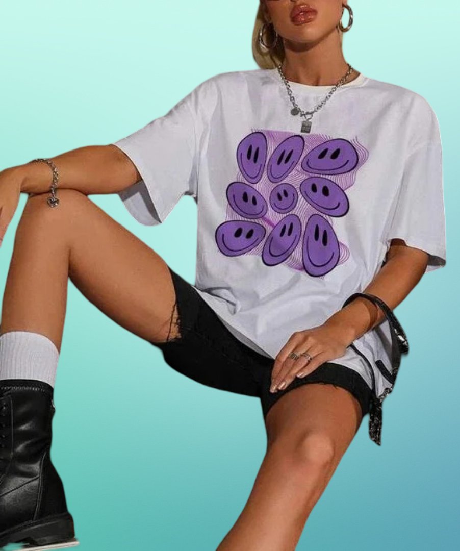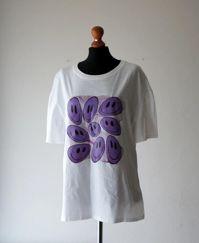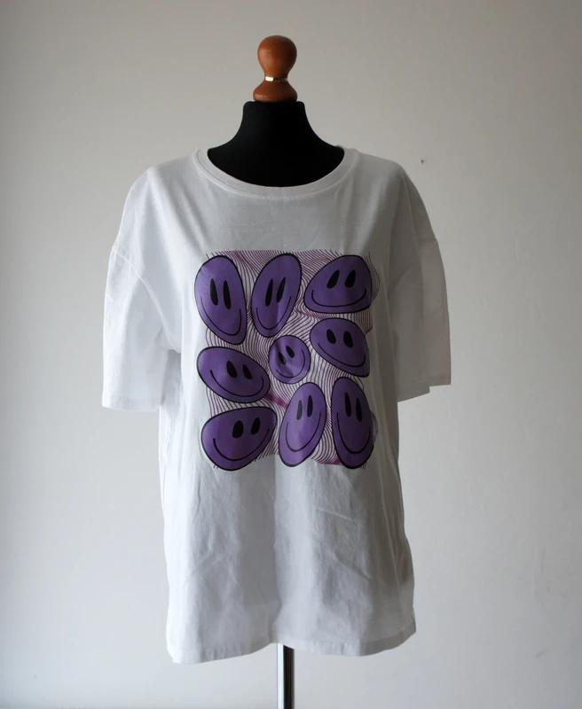 Trendové tričko oversize s hravou a pútavou potlačou fialových usmievavých tvárí. Je to perfektný kúsok pre ležérny, no zároveň štýlový vzhľad.