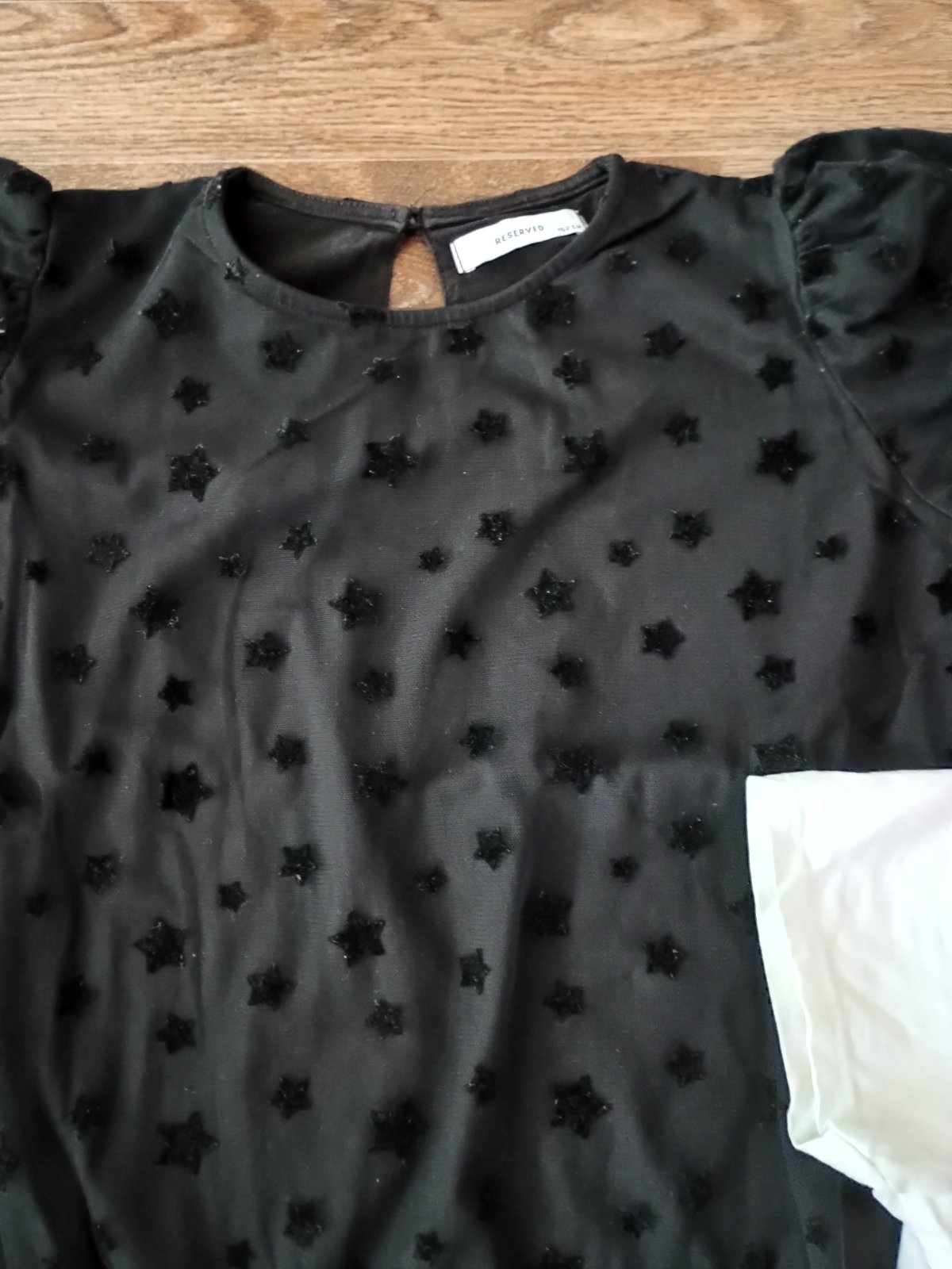 Dievčenské tričko Reserved veľ. 152, čierne s obojstrannými flitrami - nie je vypraté, zle mi odfotilo, motýlie rukávy, dĺžka vpredu 52 cm, vzadu 58 cm, vynikajúci stav