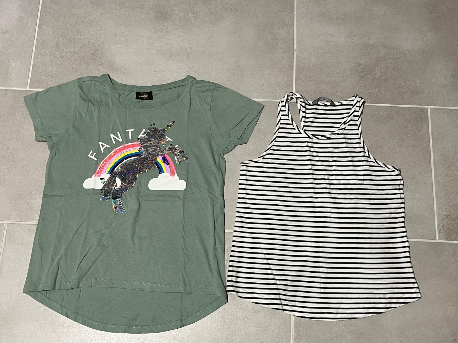 top stav, nosené, bez poškodenia, bavlnené, nosili sme pri veľ. 146/152, veľ. uvedená 158/164, zadný poloblúkový diel 50% bavlna, 50% polyester dĺžka-64 cm, šírka-2x41 cm, krk-rukáv-17 cm cena+p...