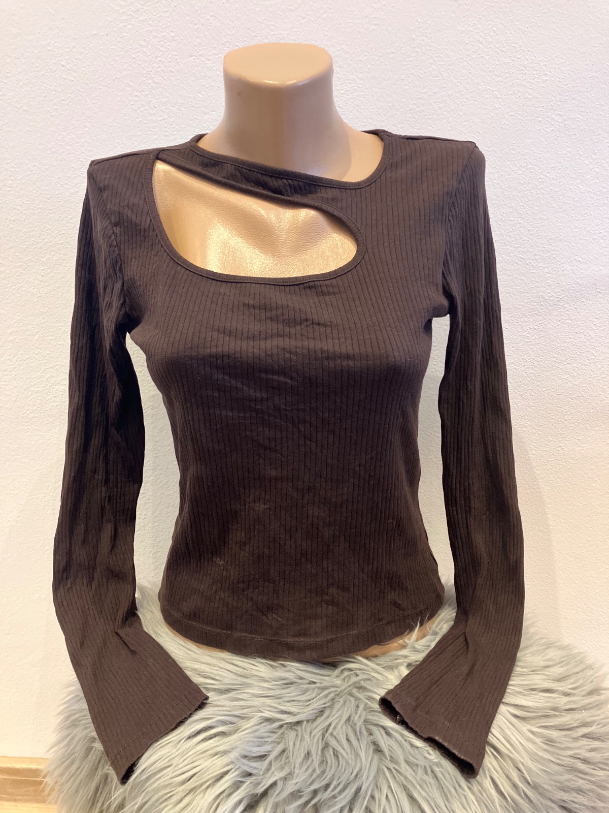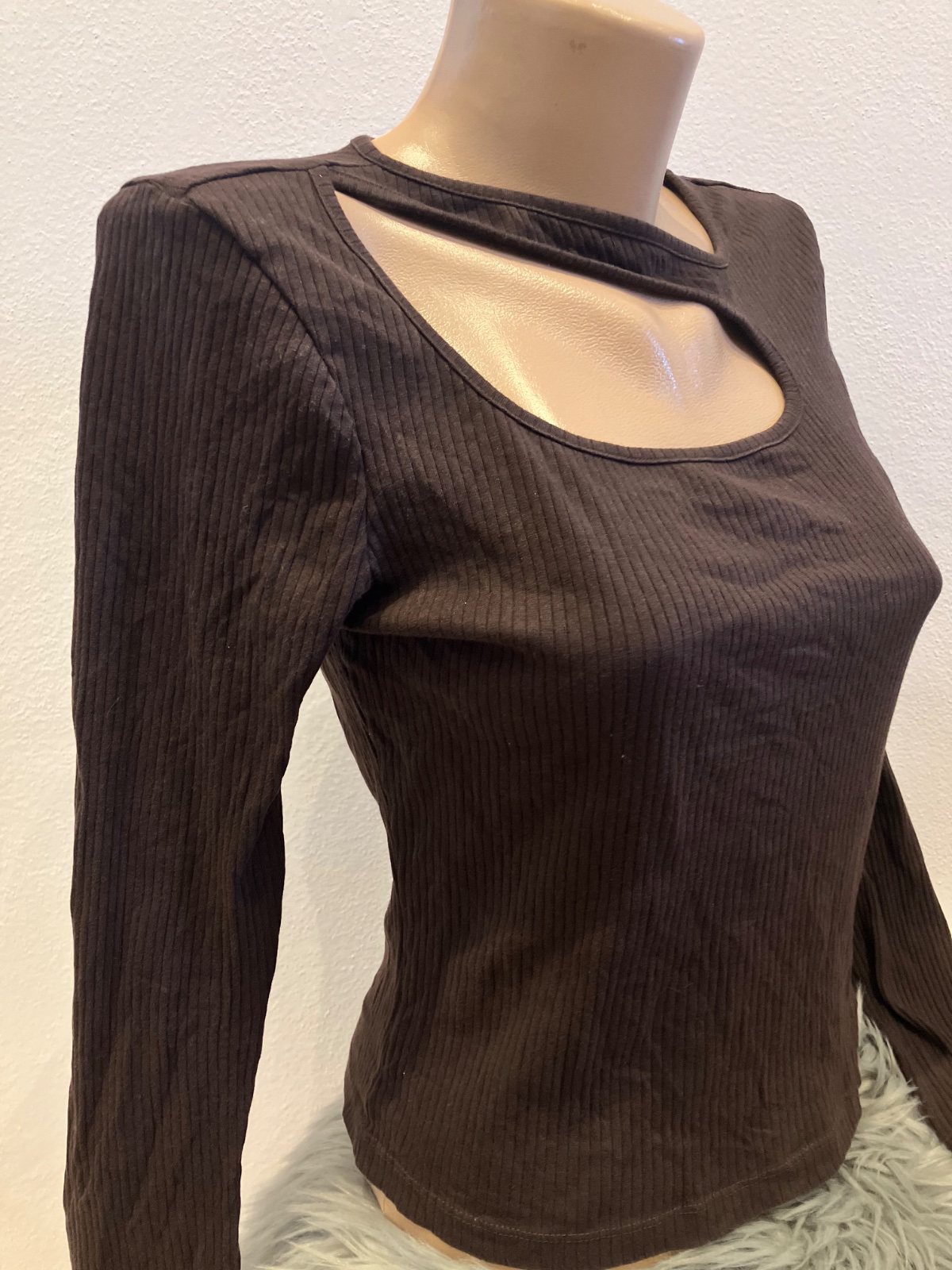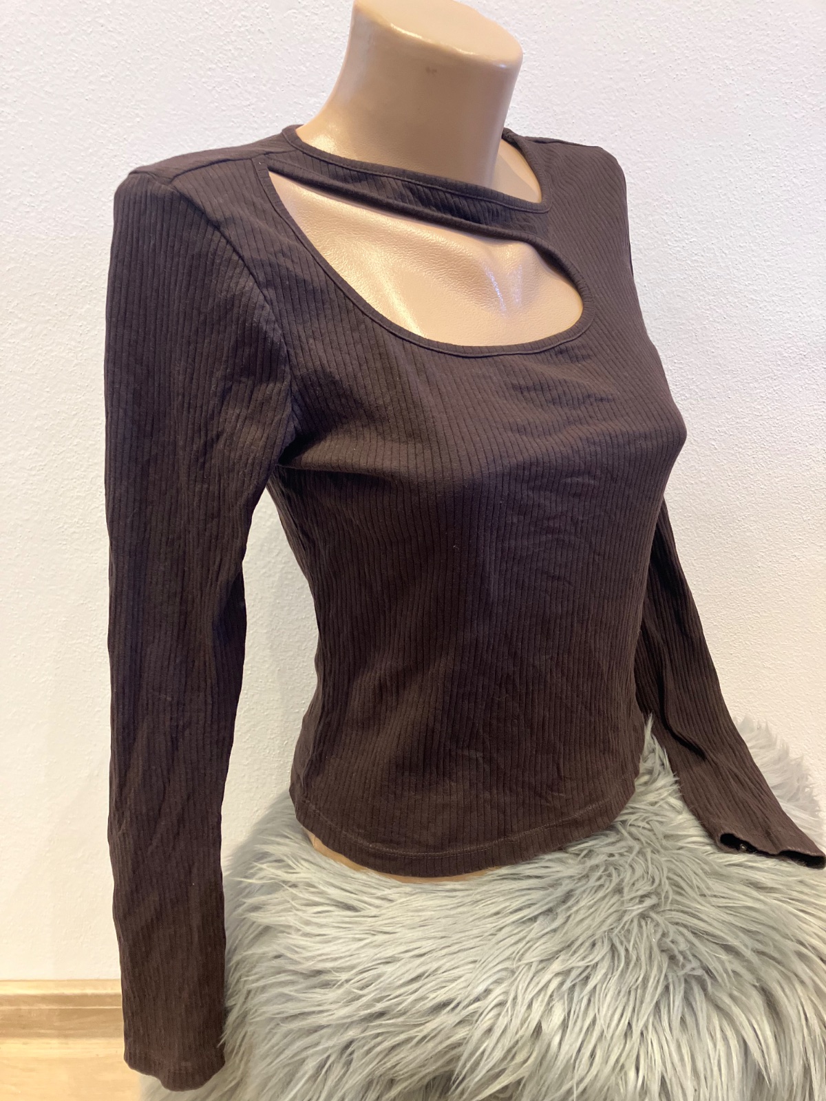 Dámske tmavomodré tričko s dlhým rukávom, okrúhly výstrih, jedinečný strih, výrez na hrudi, rebrovaný štýl, tenké, elastické, materiál 95%bavlna 5%elastan.
