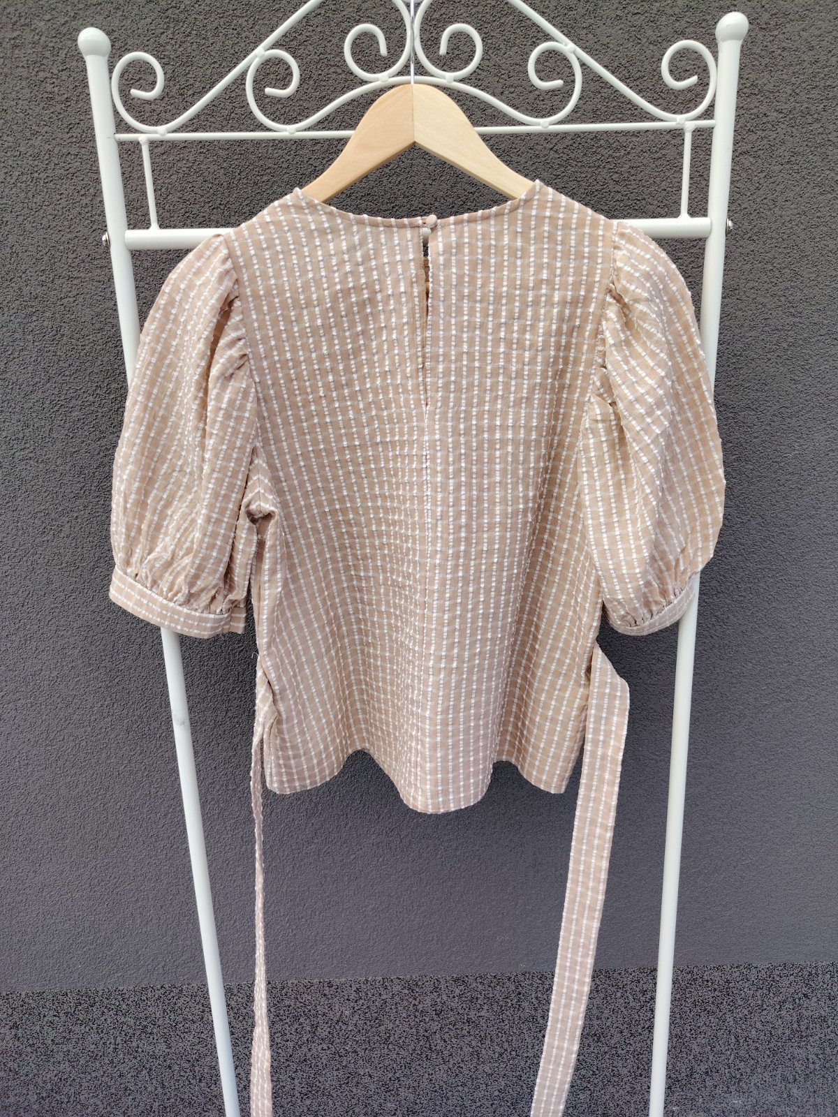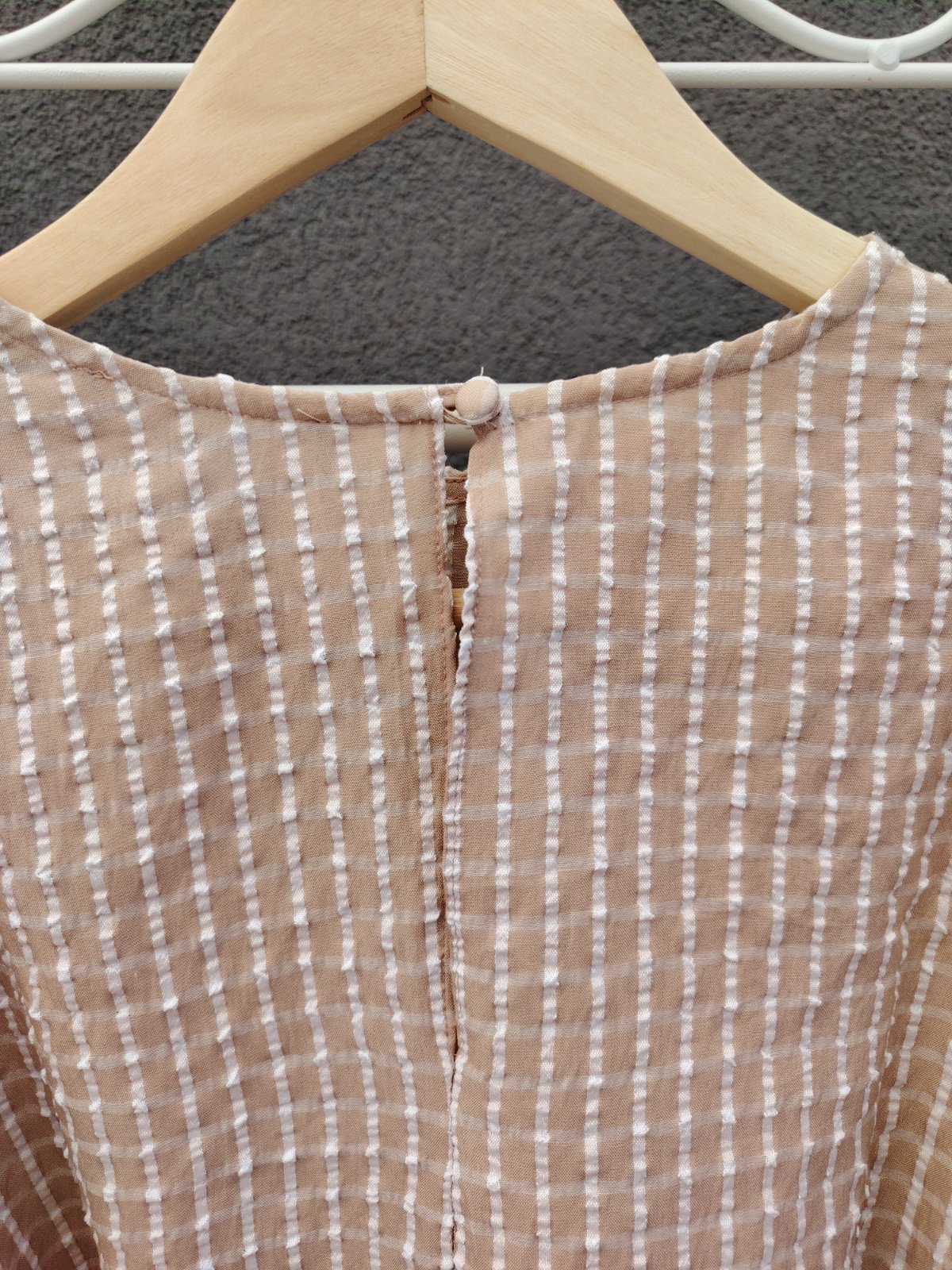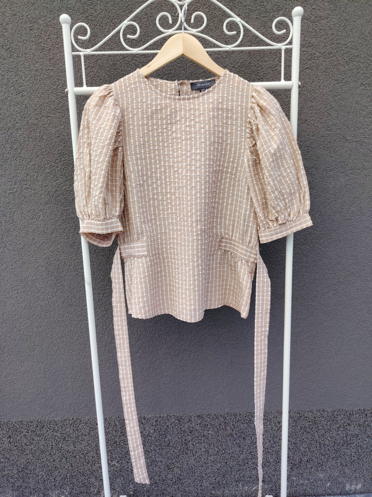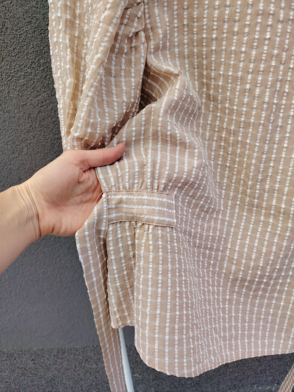 - béžový základ s jemnými bielymi pásikmi po celej blúzke