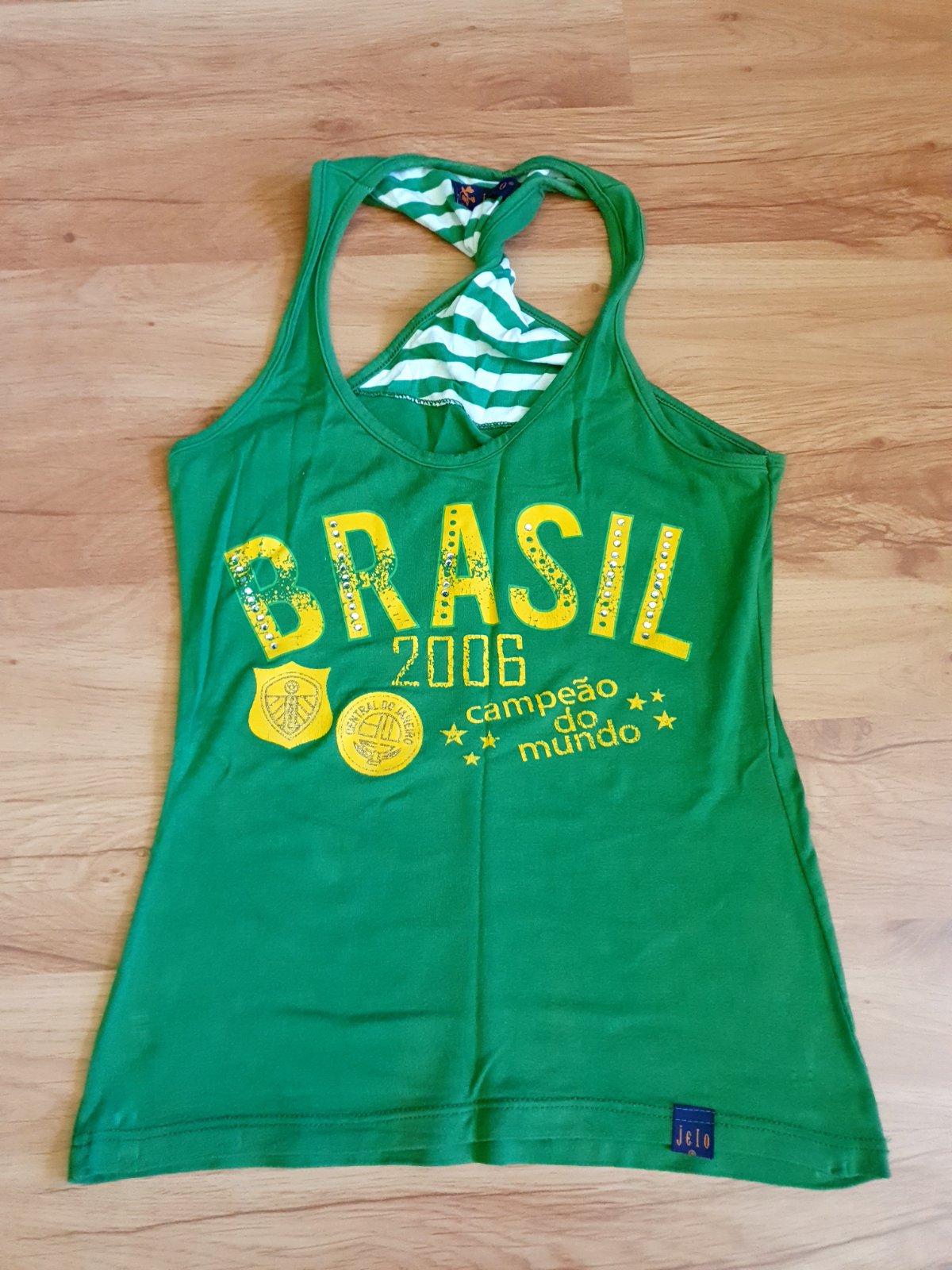Je raz oblečený. Myslím, že oblečie aj menšie M. Pre väčšie prsia. Krásne sedí na postave, keďže je elastický a nariasený. Je sýto zelenej farby, viaže sa okolo krku a na výstrihu má ozdobné kamien...
