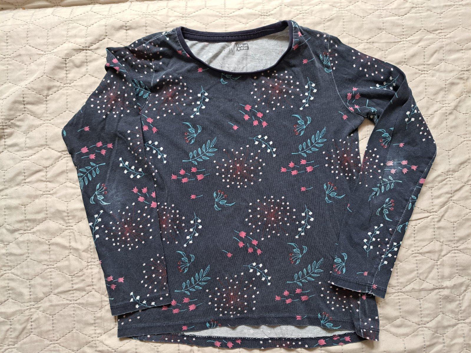 Veľkosť 134/140 Vpredu dole malý fliacik, dĺžka 48 cm, šírka pod pazuchami 34 cm, rukáv od krku 51 cm