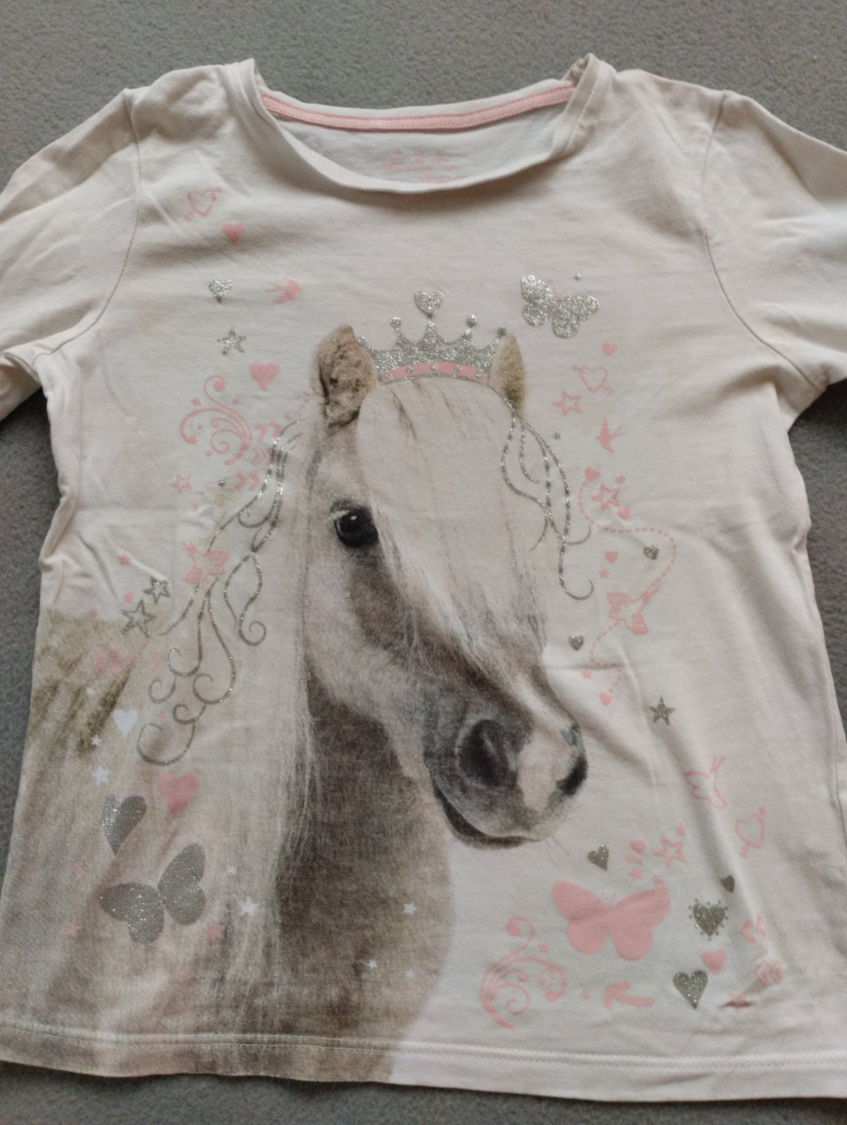 Krásne tričko posiate motýľmi a srdiečkami. Málo nosené, zachovalé. Farba maslovo-biela. Veľkosť na 6-7 r.