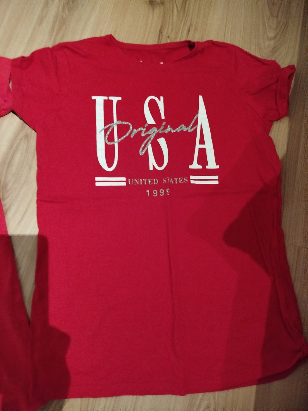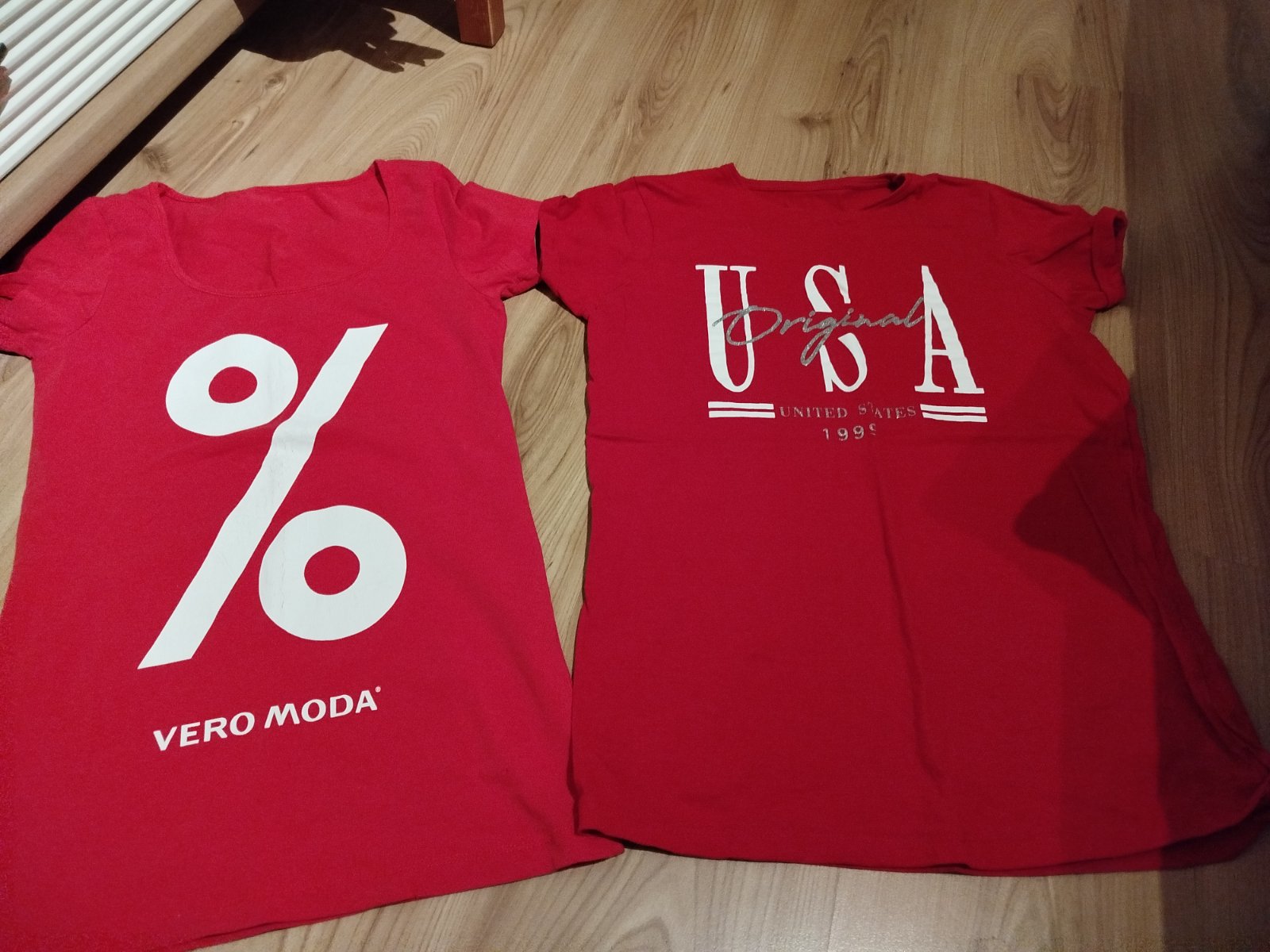 Predám 1x tričko Vero Móda, má oblukovy výstrih, biely pás je kúsok popraskaný ako bolo tričko zložené cez stred a druhé USA. Pre ženu dievča čo má rada červenú farbu.
