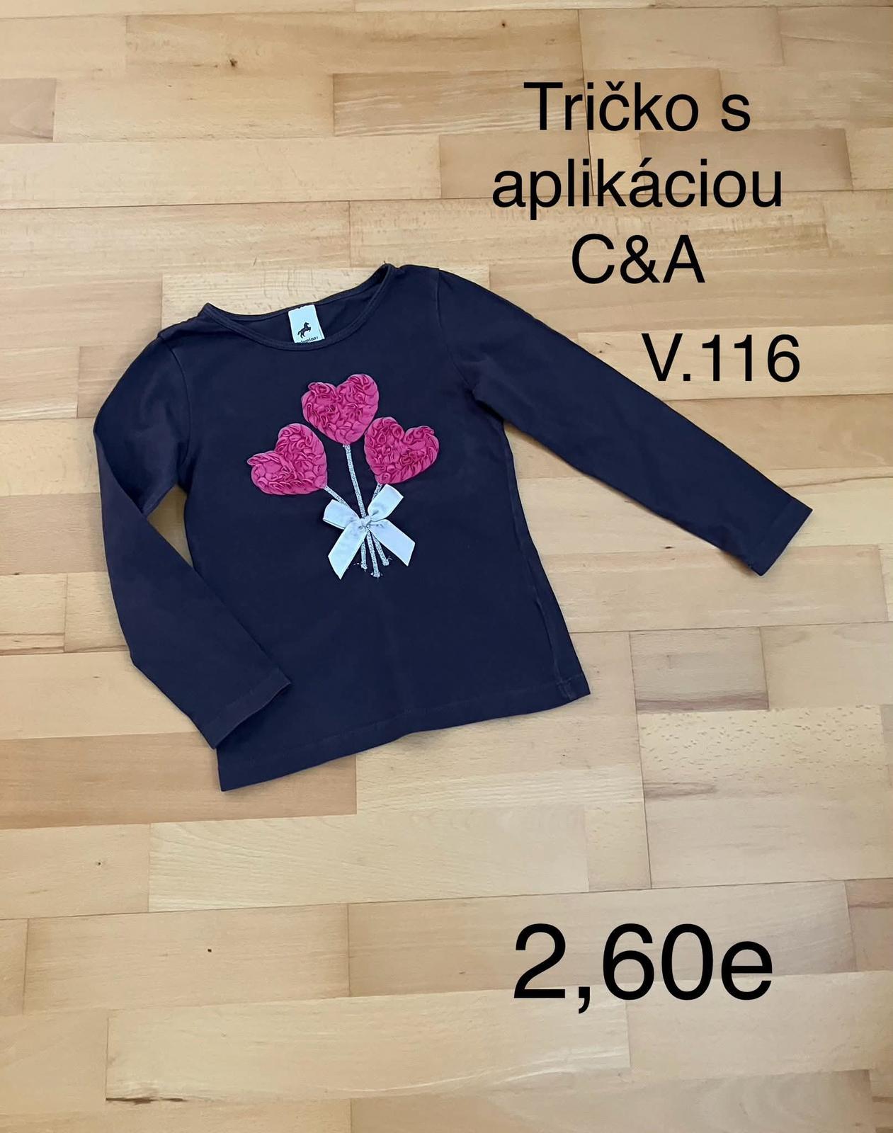 Predam tricko zn. C&A, velkost 116, top stav. Cena 4.00 € + postovne podla tarif Slovenskej posty. Zasielam doporucene, alebo na Vase vlastne riziko aj obycajne, alebo osobny odber v BA-Petrzalka....