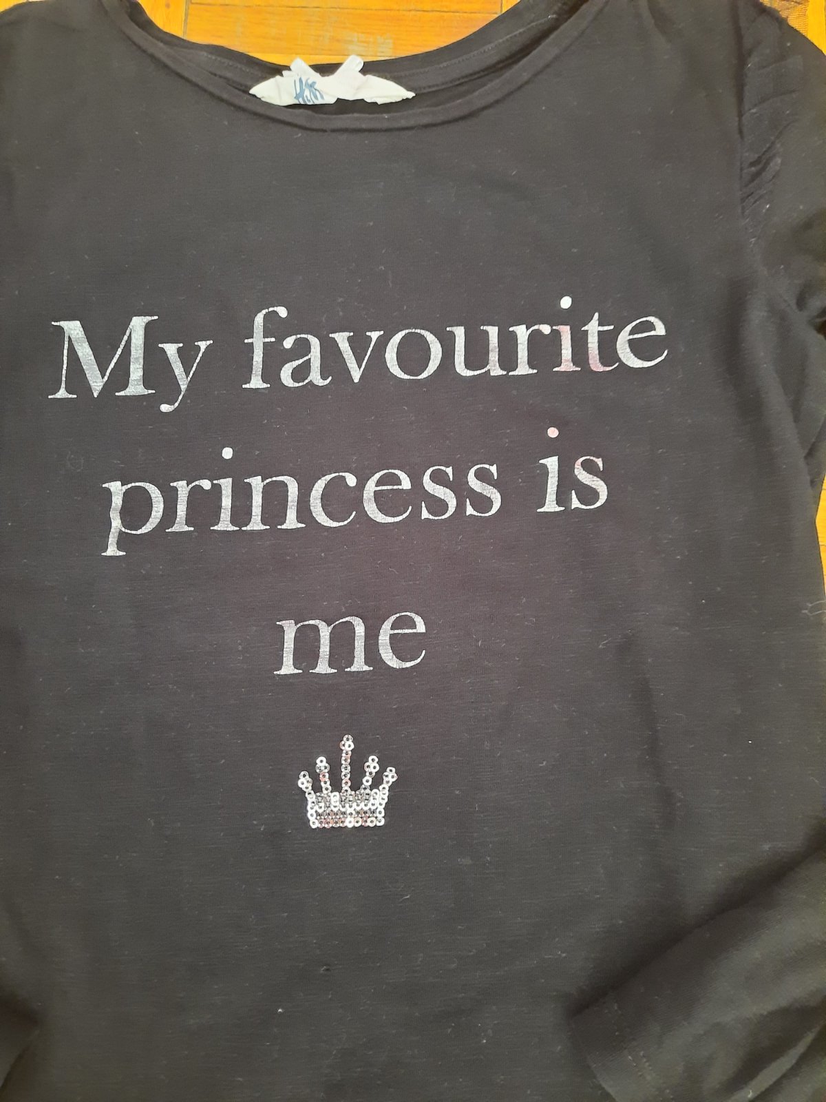 Bavlnené tričko so strieborným nápisom vpredu. Pri ramenách je malý tylový volánik. Veľmi pekný stav.