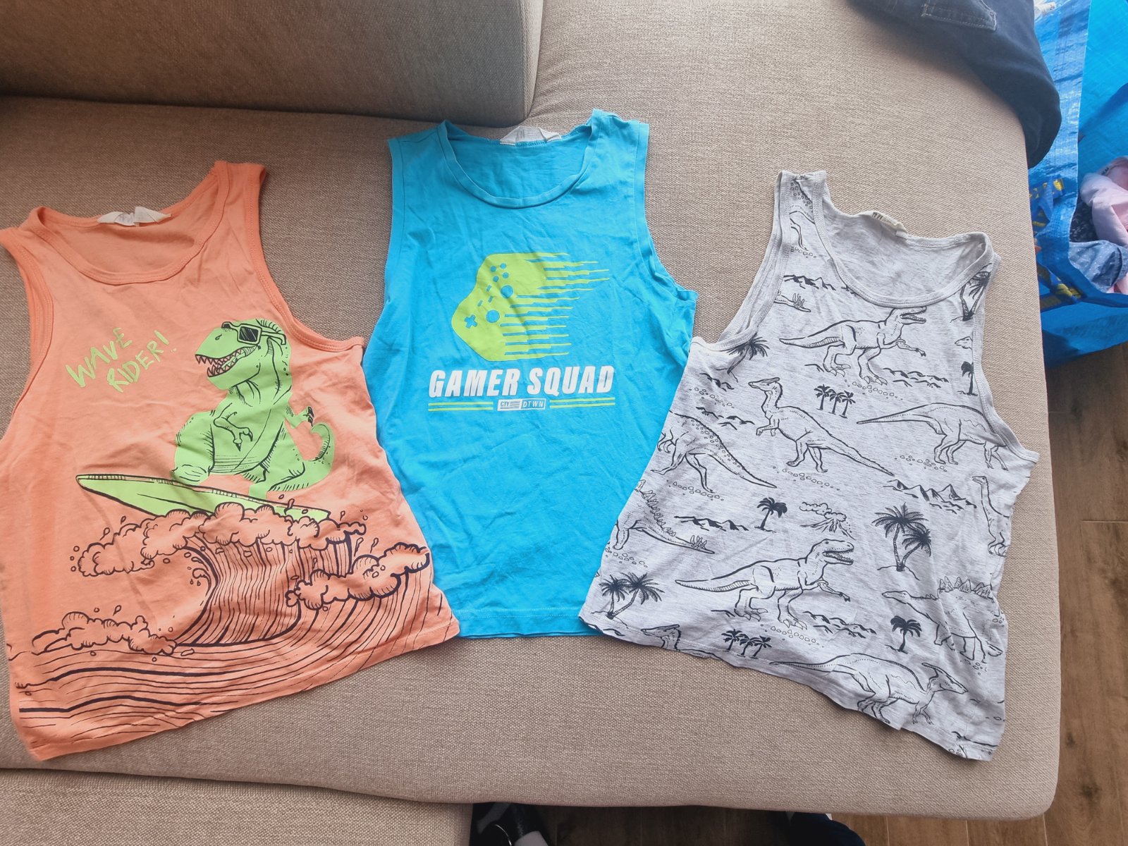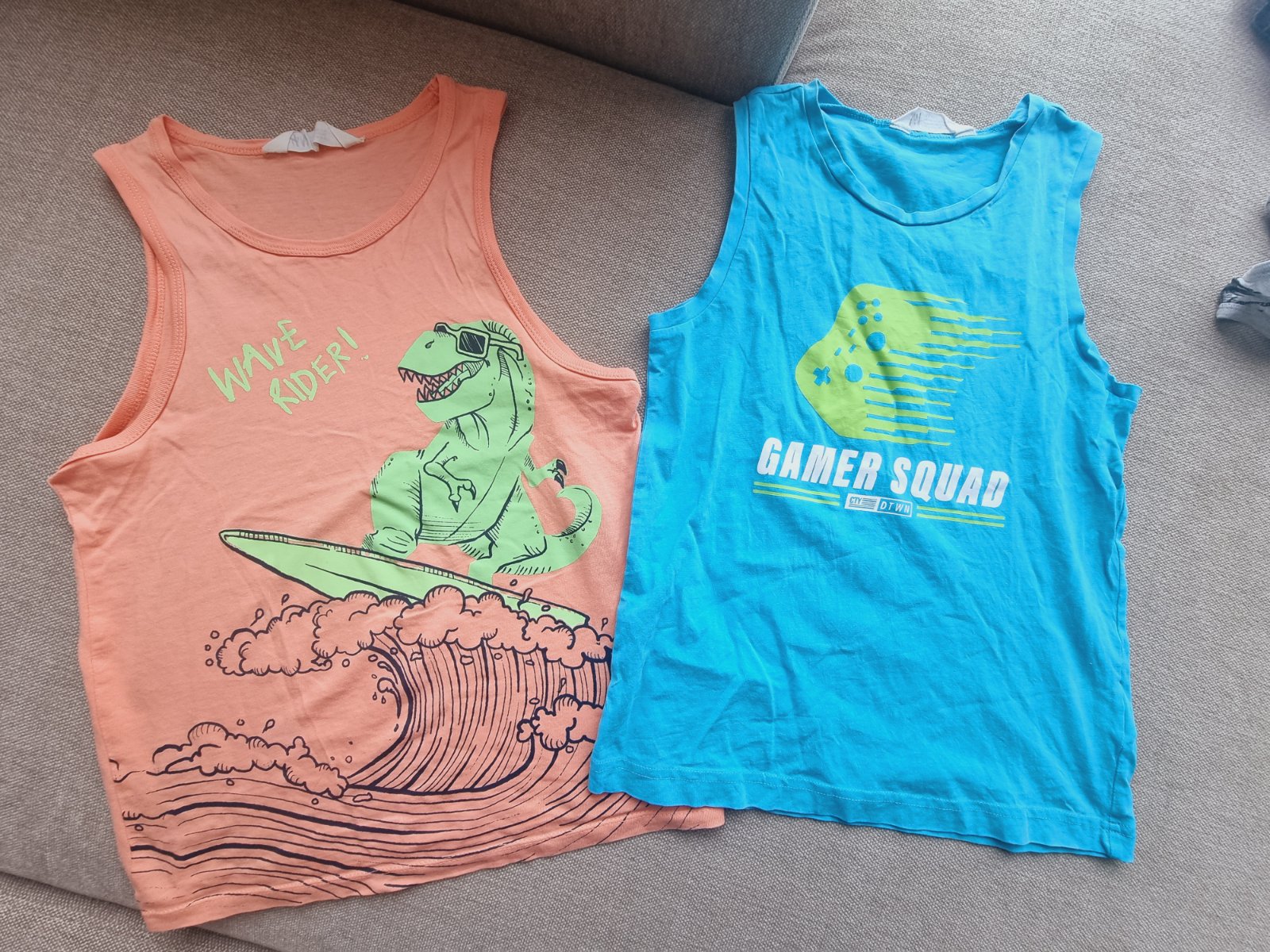Tielka po synovi na leto. Na lososovom som zasivala dierku, inak dobry noseny stav