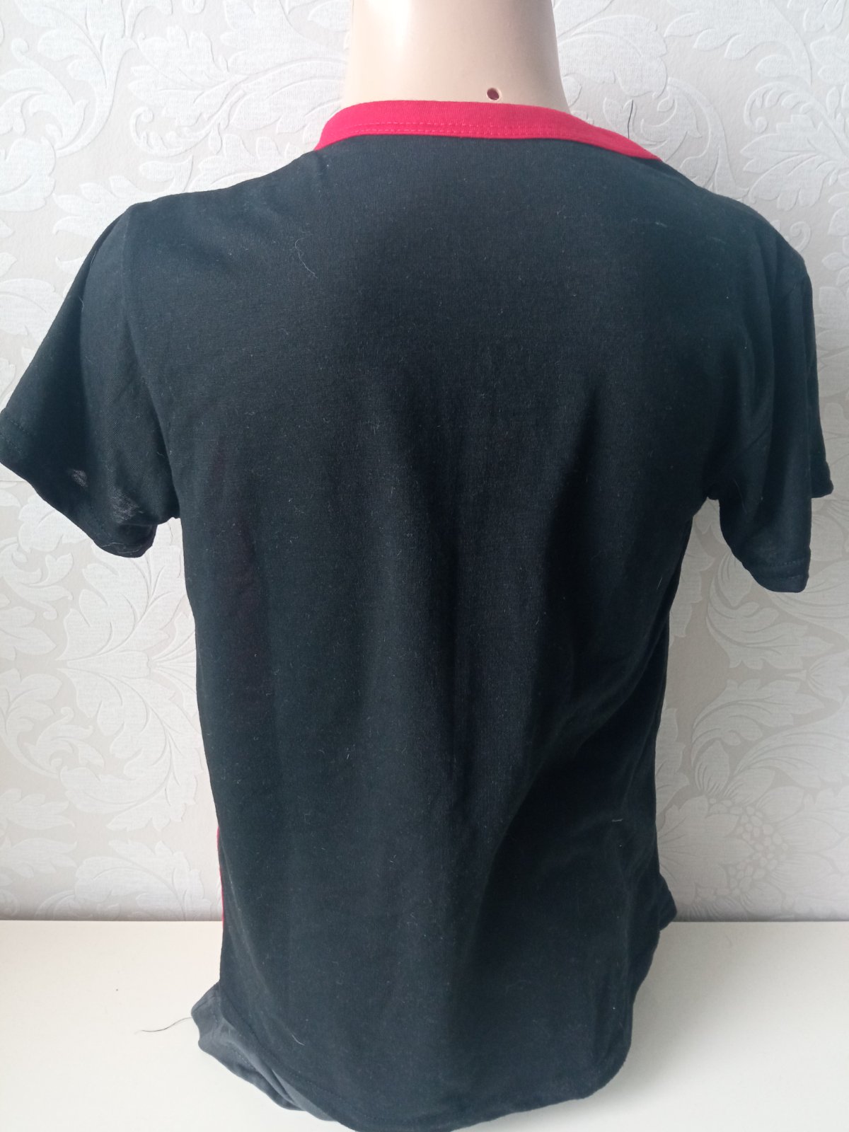 Chlapčenské tričko s krátkym rukávom červeno-čierno-biele, elastické, veľkosť cca 116, materiál 85%bavlna,10%spandex,5%elastan.