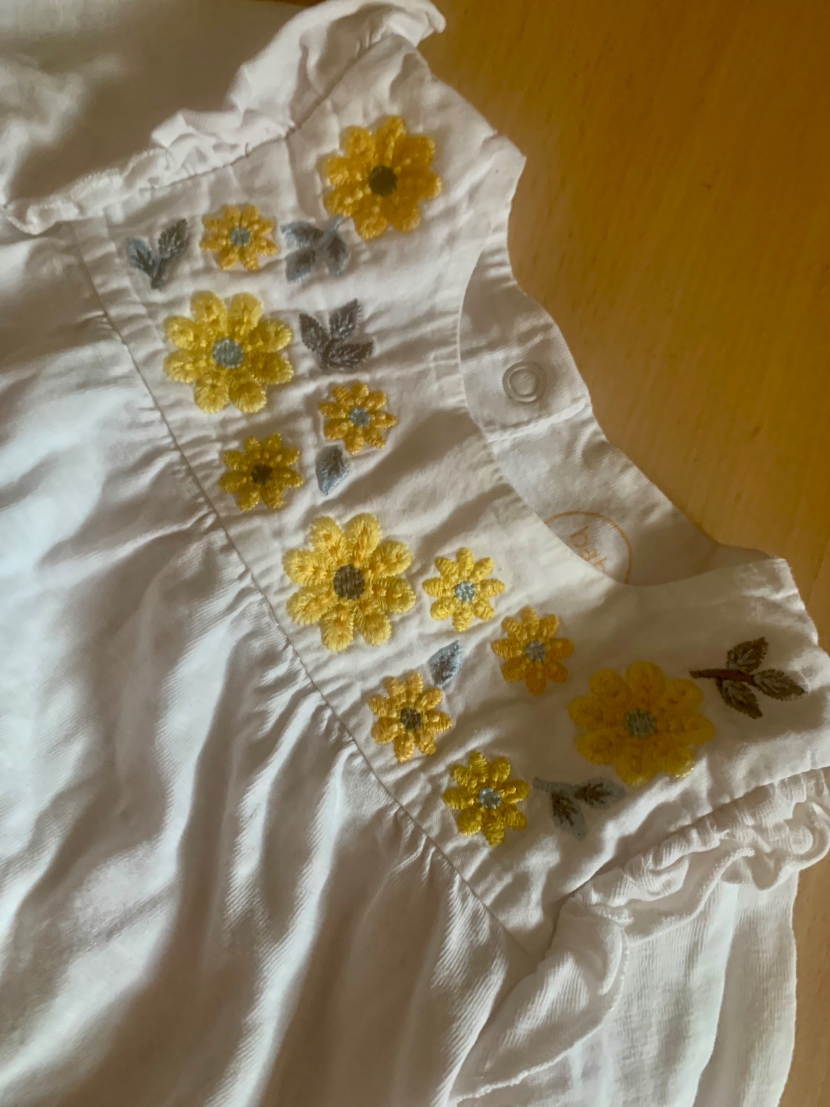 Biela s krásnou výšivkou - ma na zadnej strane rukáva jemný fliacik fixkou a jedno malé zastopkanie na chrbatiku (obe nafotené), Baby Club.
