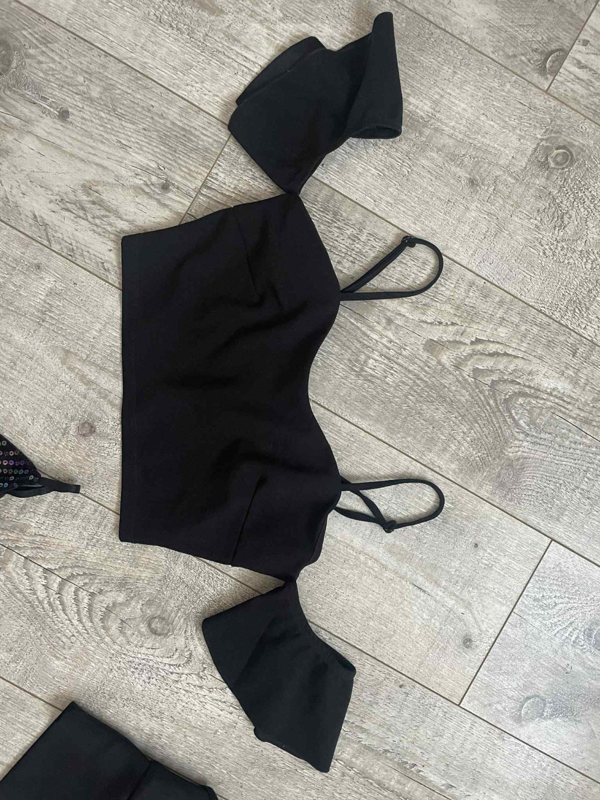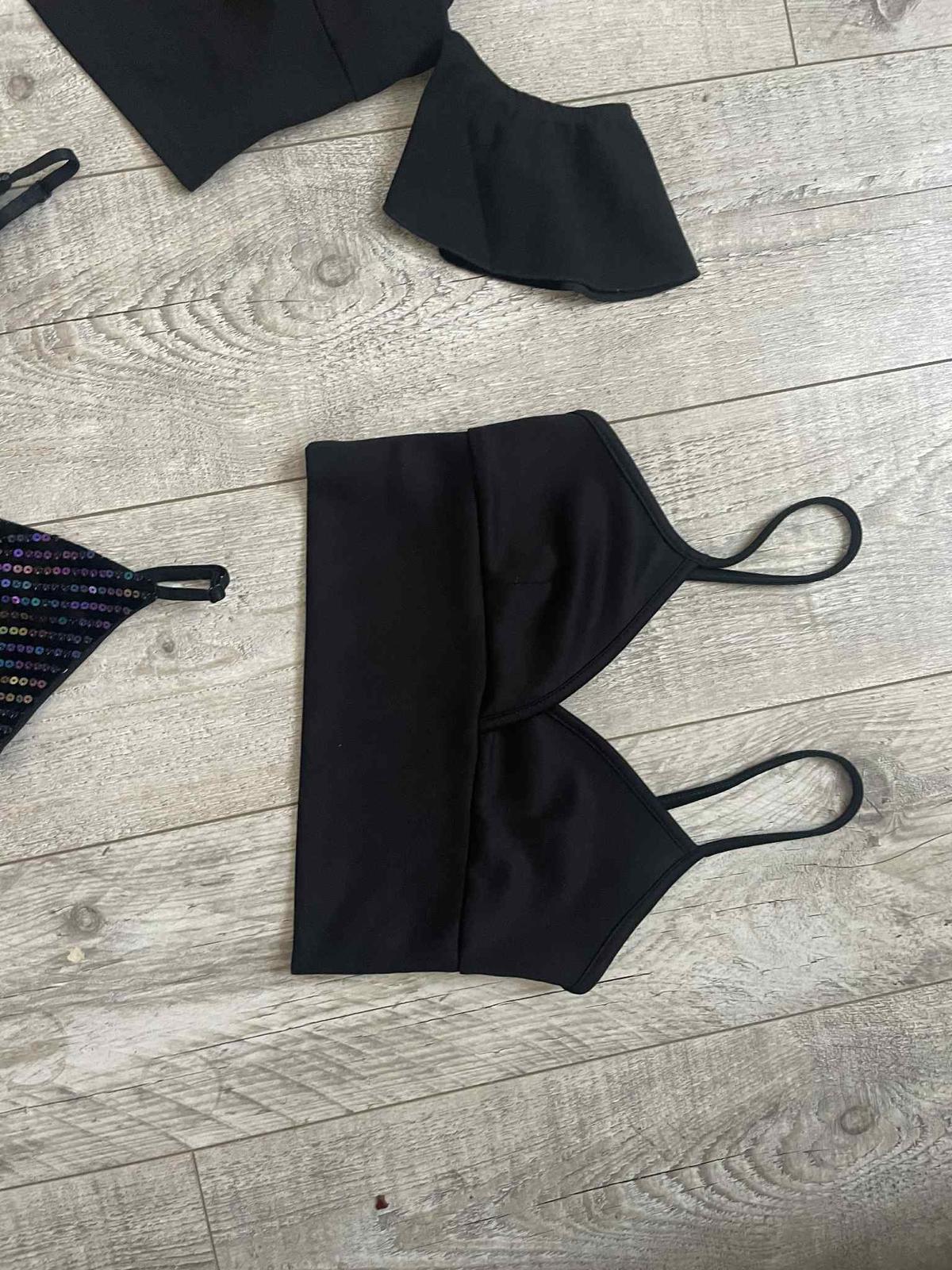 Nadherne cierne sexy body - top bez rukavikov s vyraznym velkym pevnym dvojradovym volanom - jeden okolo dekoltu a pod vrchnym dalsi okolo jedneho ramena,volan oziveny bielym pasom,zvlastny akoby d...