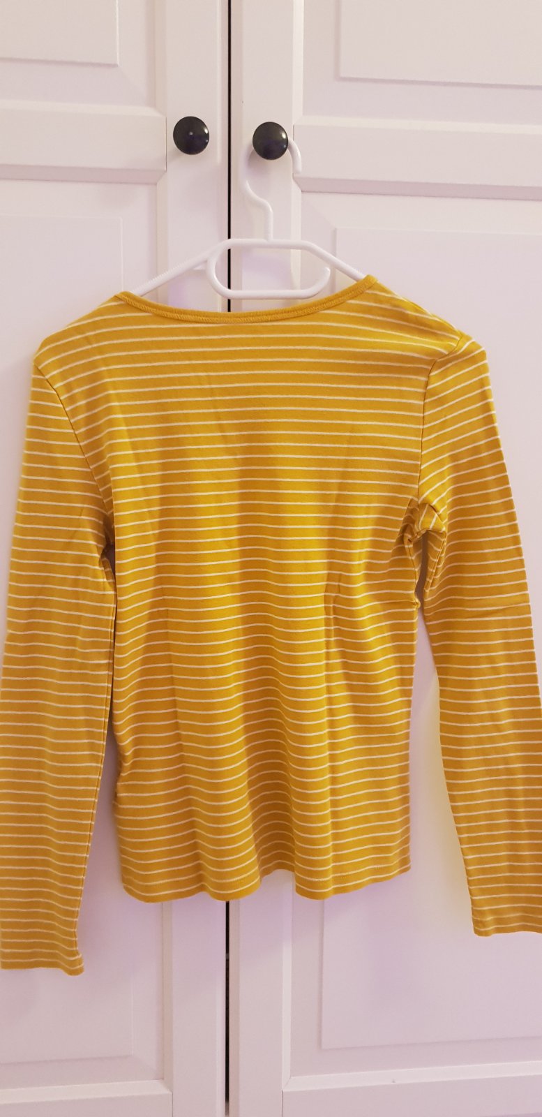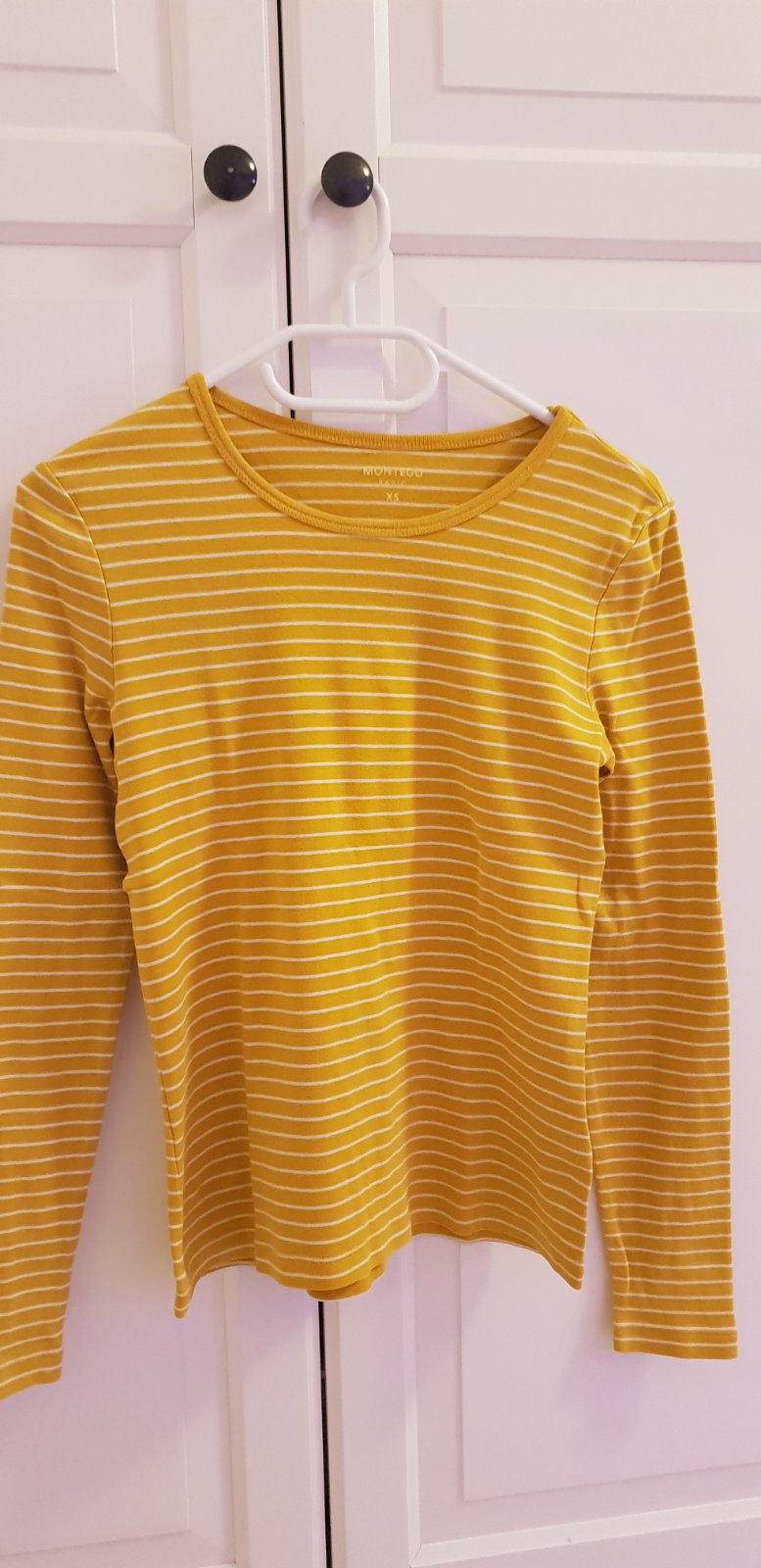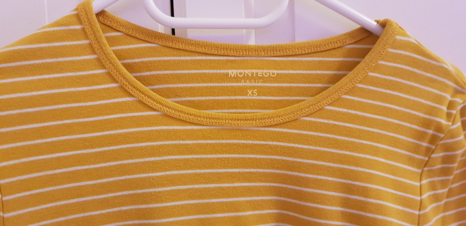 Pružné bavlnené tričko žltohorčicovej farby. Dobrý stav. Veľkosť písaná XS, značka Things we love. Dlžka je 60 cm. Dobrý stav.