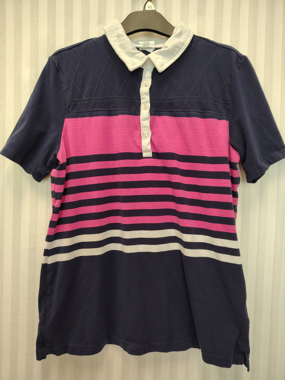dámsky elastický viacfarebný top so zapínaním na gombíky ku krku, golier, farby modrá, ružová a biela,
