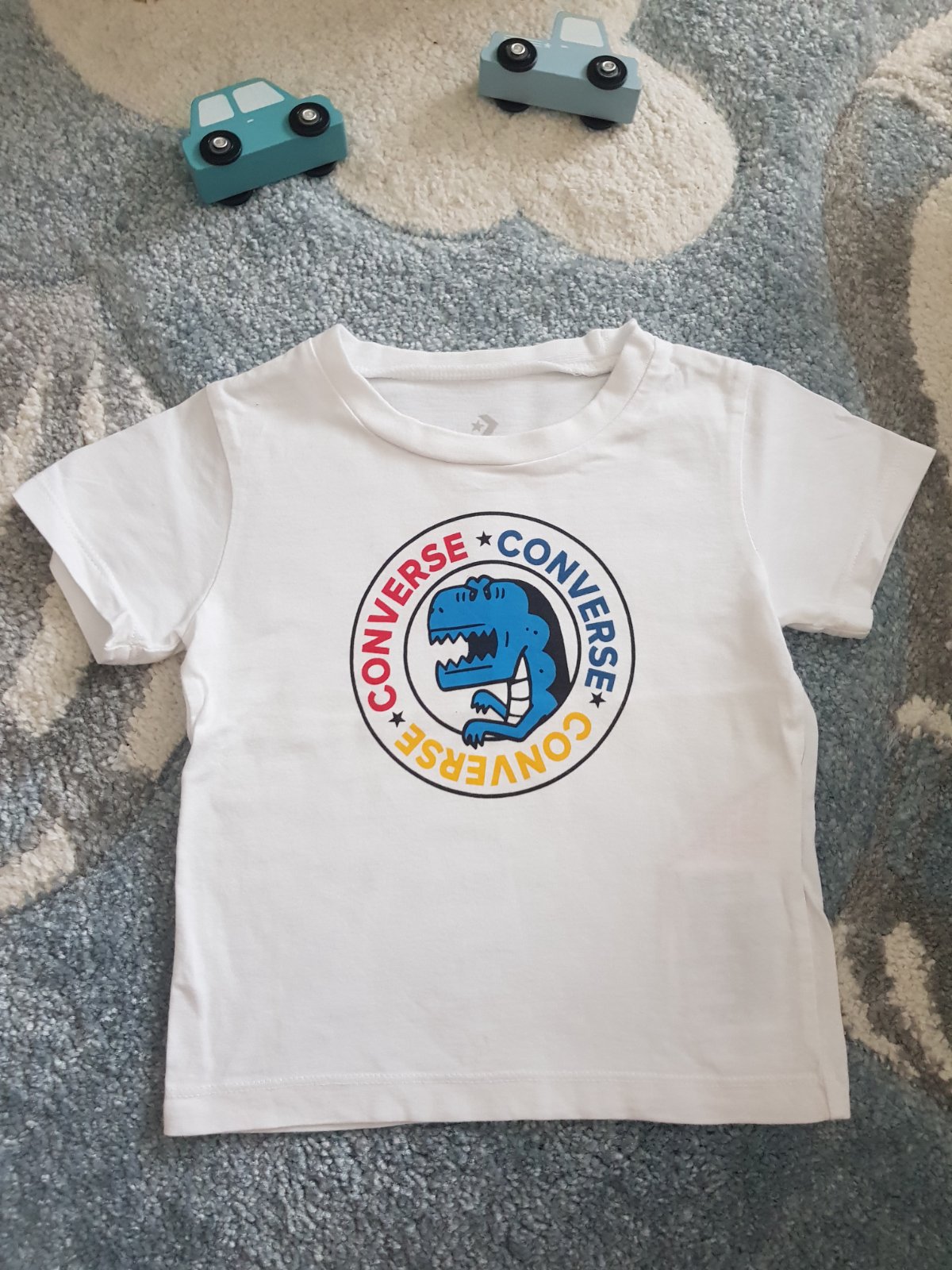 Predám tričko s dinosaurom značky converse. Veľkosť písaná 74-80, ale irčote aj 86 vydrží.