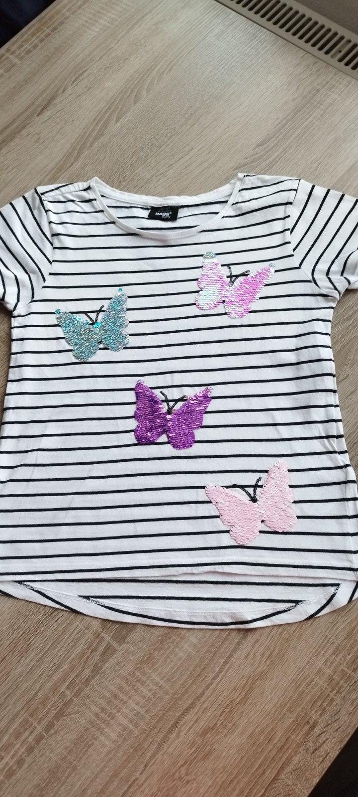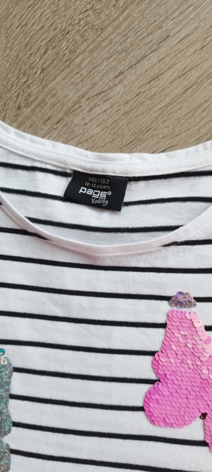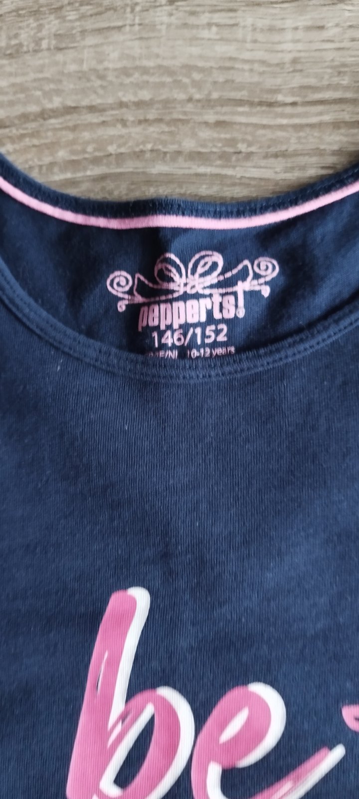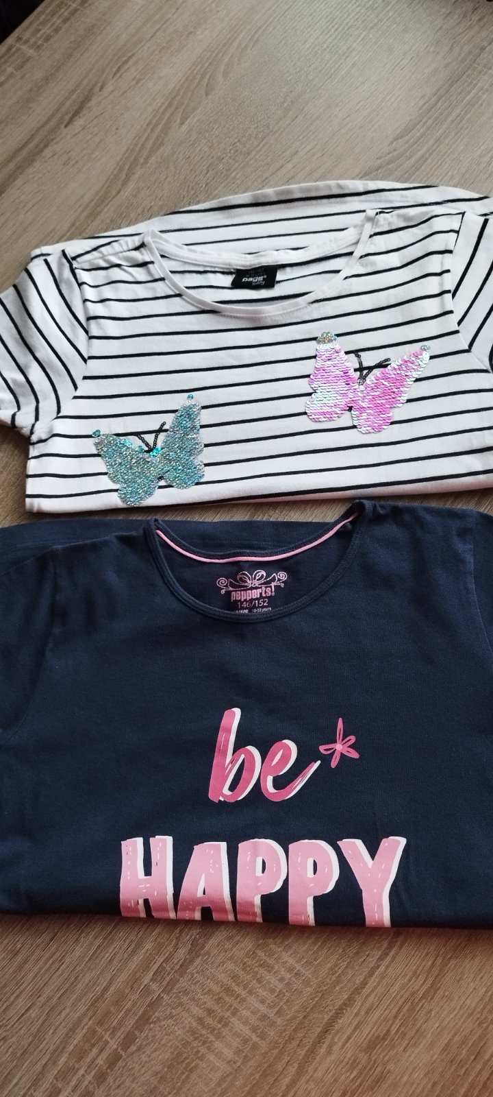 Tričko biele s čiernym pásikom, č.146/152, Zn. Young page, celková dĺžka predný diel - 50cm, zadný diel 53cm, šírka 2x39cm. Tmavomodré č.146/152, Zn. Pepperts, celková dĺžka 55cm, šírka 2x42cm. Bez poškodenia, len spolu.