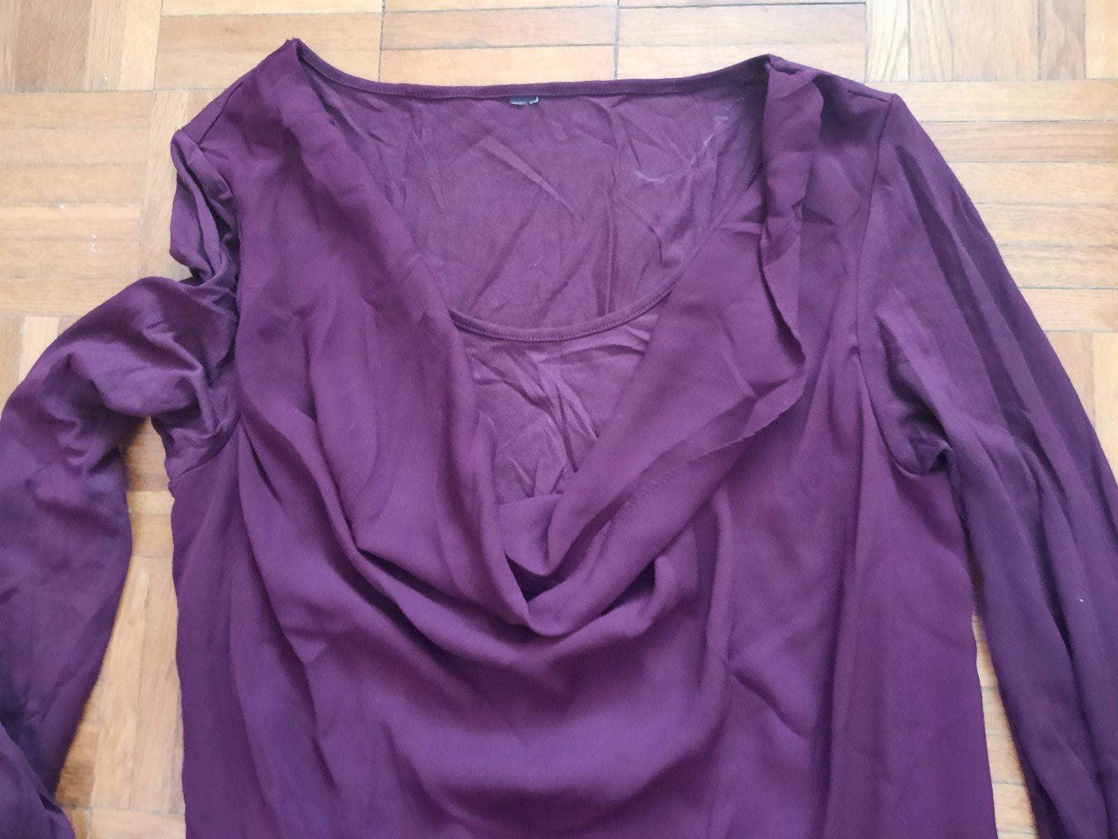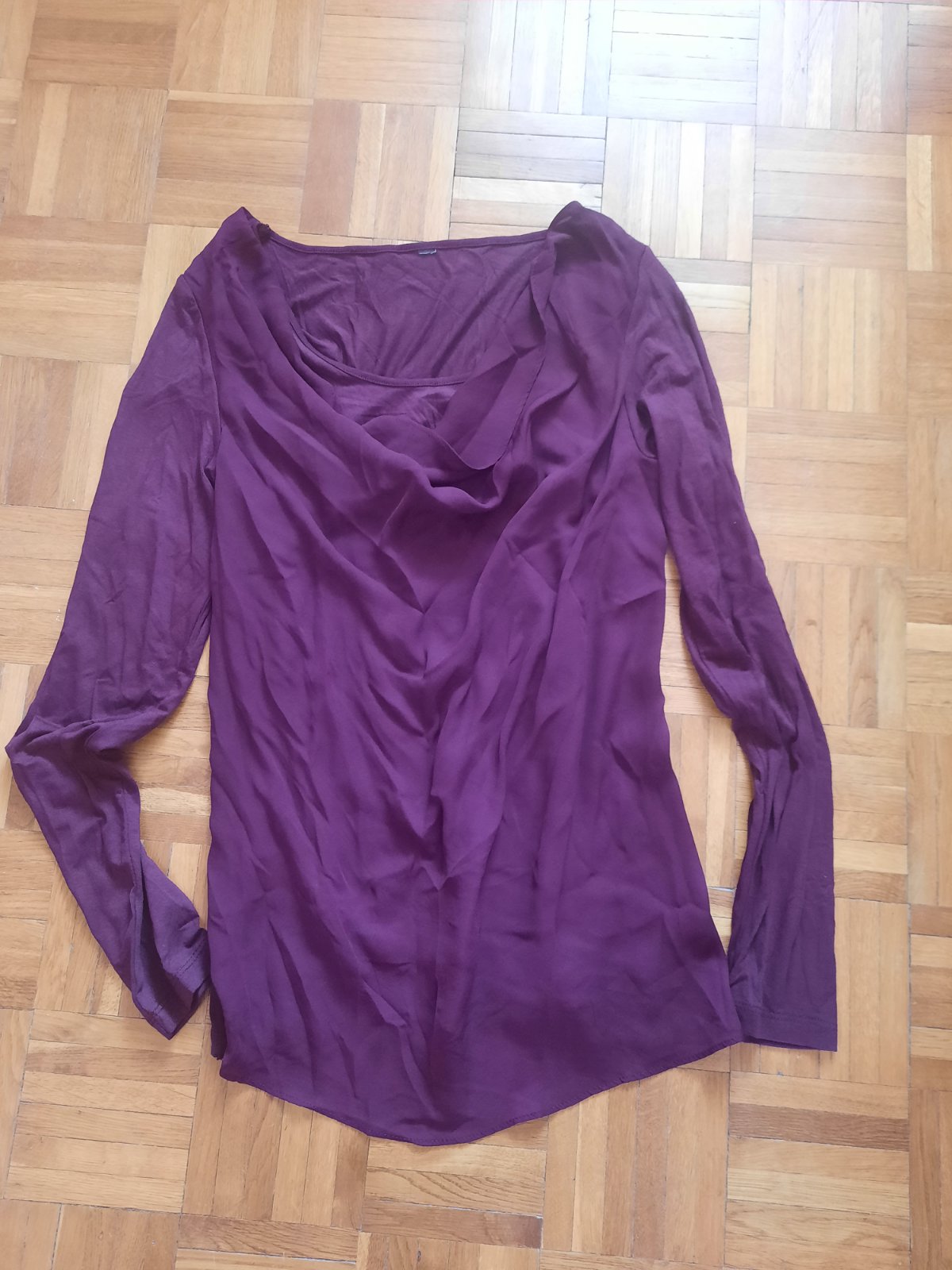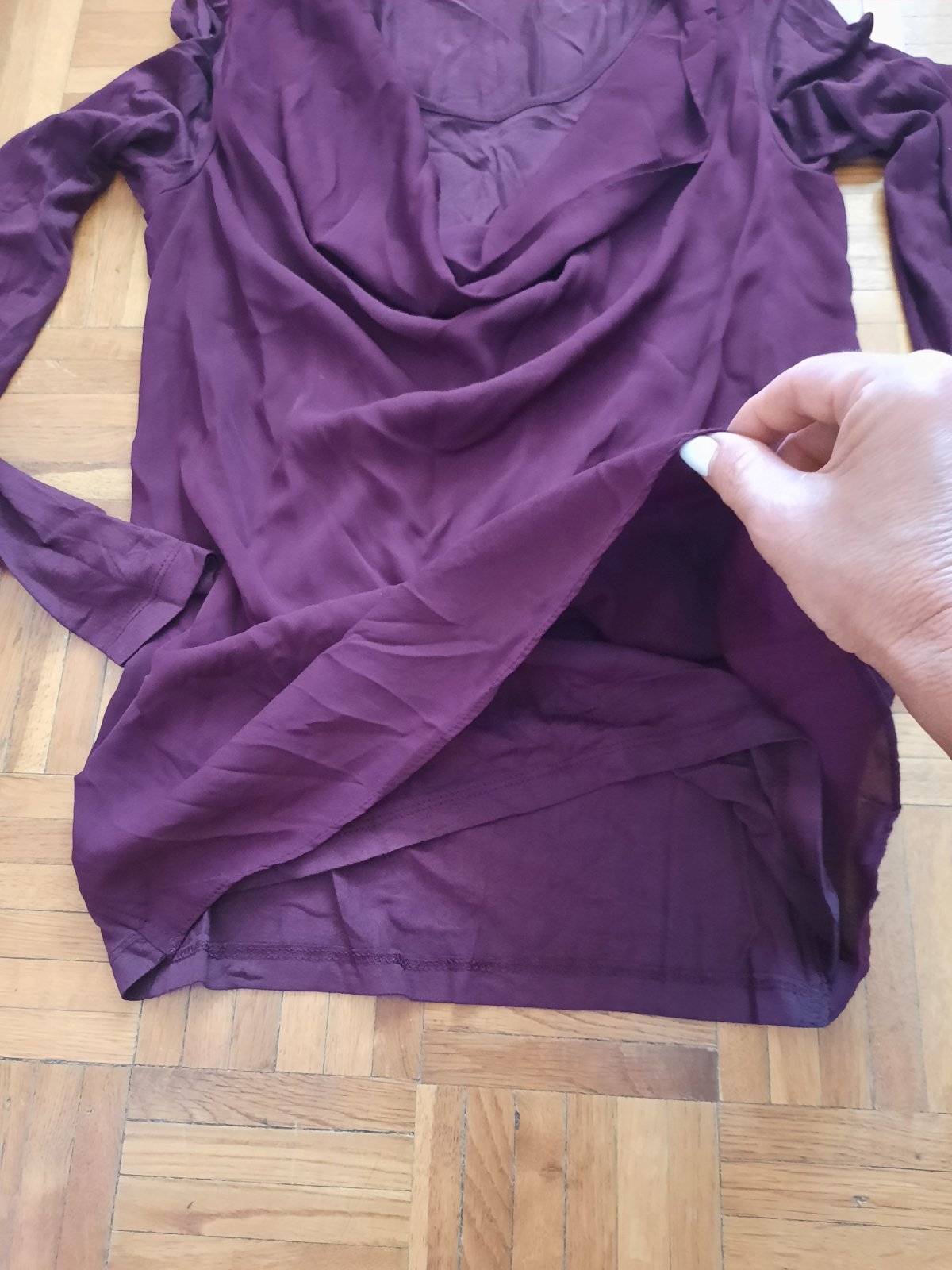 Zaujímavé fialové elastické tričko- zadná strana bavlna (úplet). Predná strana je dvojitá spodná vrstva je úplet/ bavlna a na nej je blúzkovina s "vodou" pri krku.