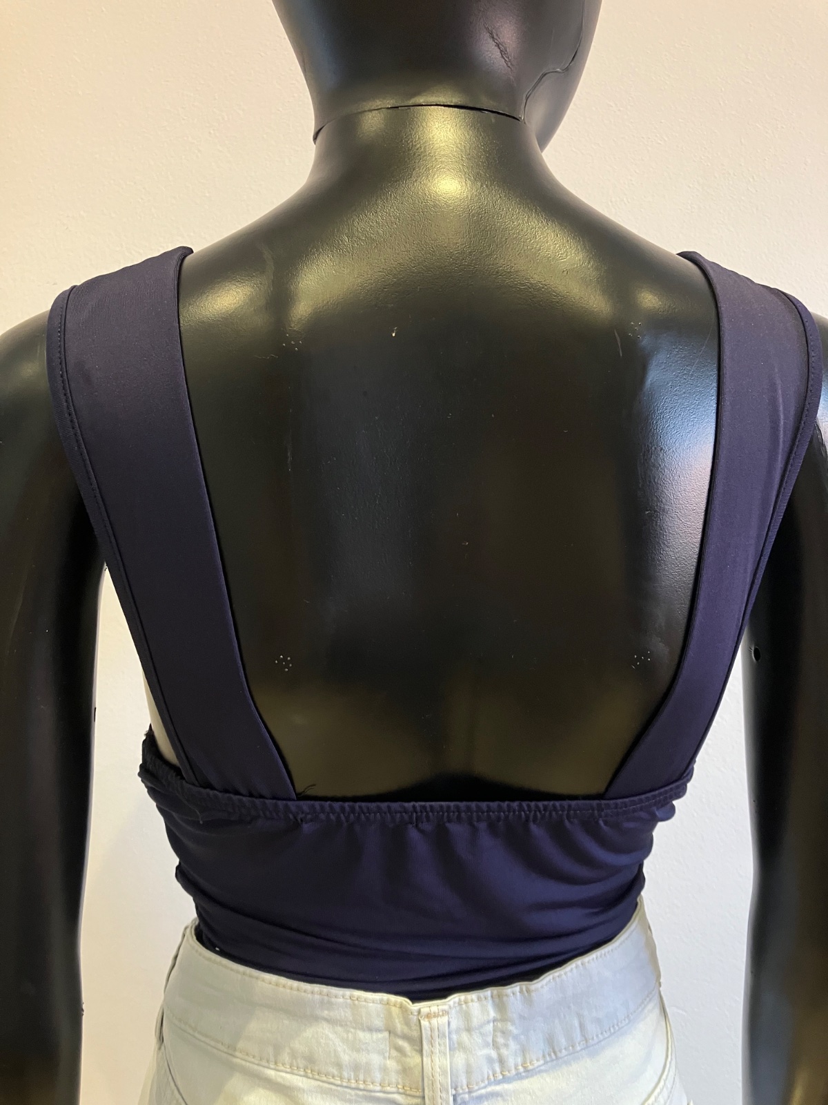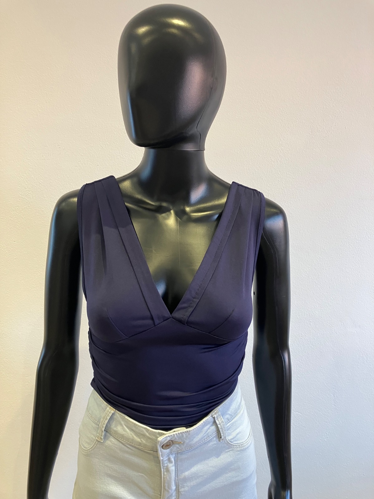 Dámske tričko na hrubé ramienka, tmavomodré, nariasené na bokoch, tenké, elastické, materiál 90%polyamid 10% elastan.