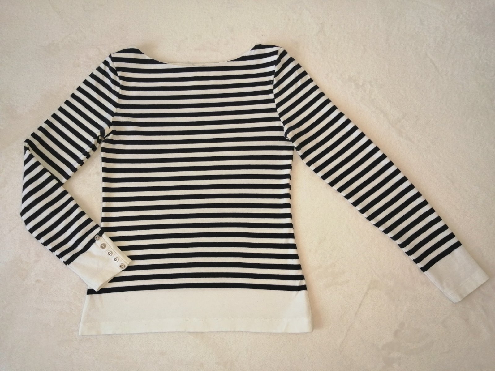 Pekné kvalitné tričko zn. H&M, Veľkosť 36 alebo S. Farba kombinácia smotanovo biela s tmavo modrou. Materiál príjemný - bavlna + elastén. Vo výbornom stave, ob 3-4 x.