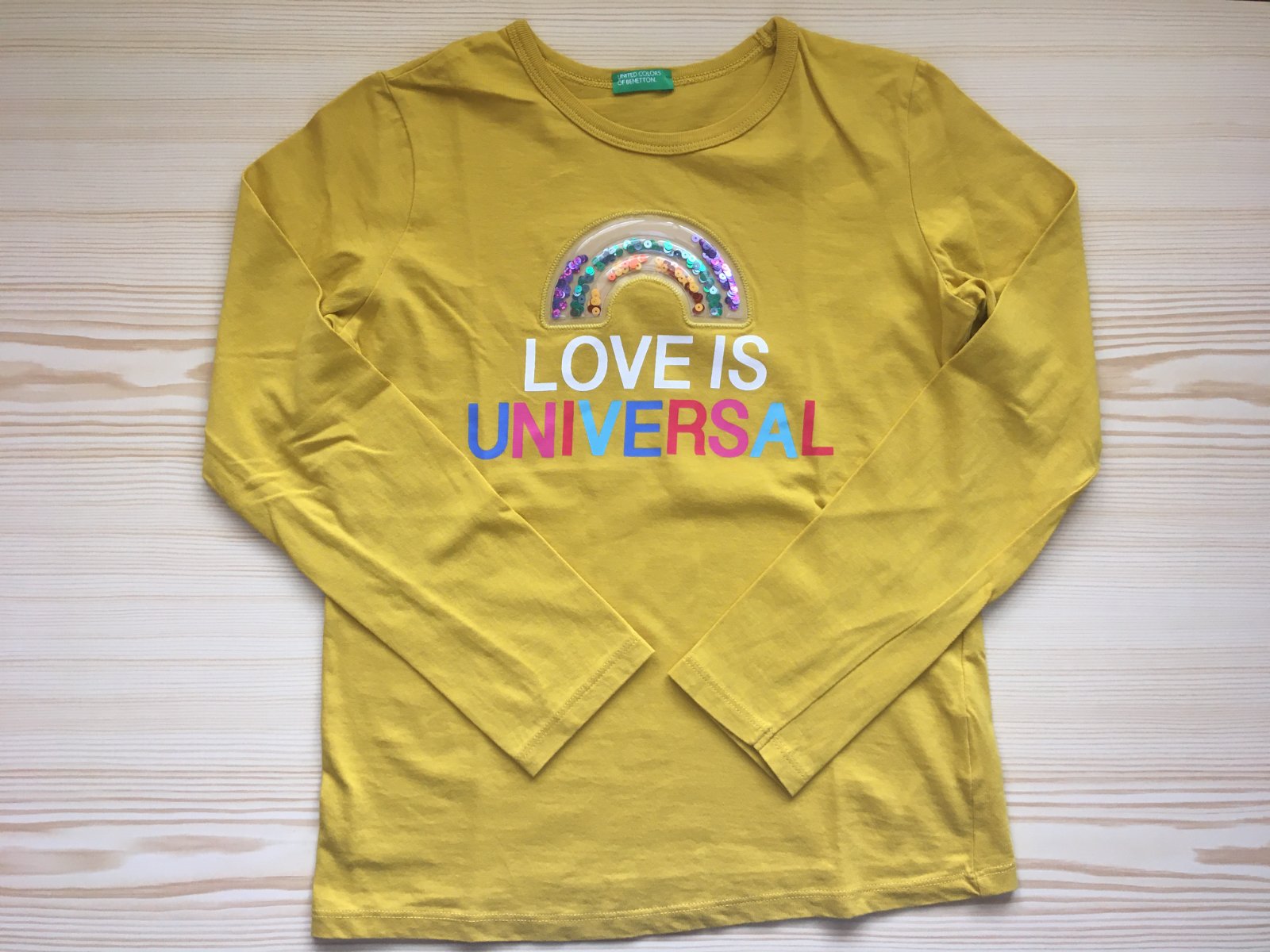 Žlté bavlnené tričko s motívom dúhy a dlhým rukávom vo výbornom nosenom stave. Uvedená veľkosť M (130), zodpovedá veľkosti 128/134.