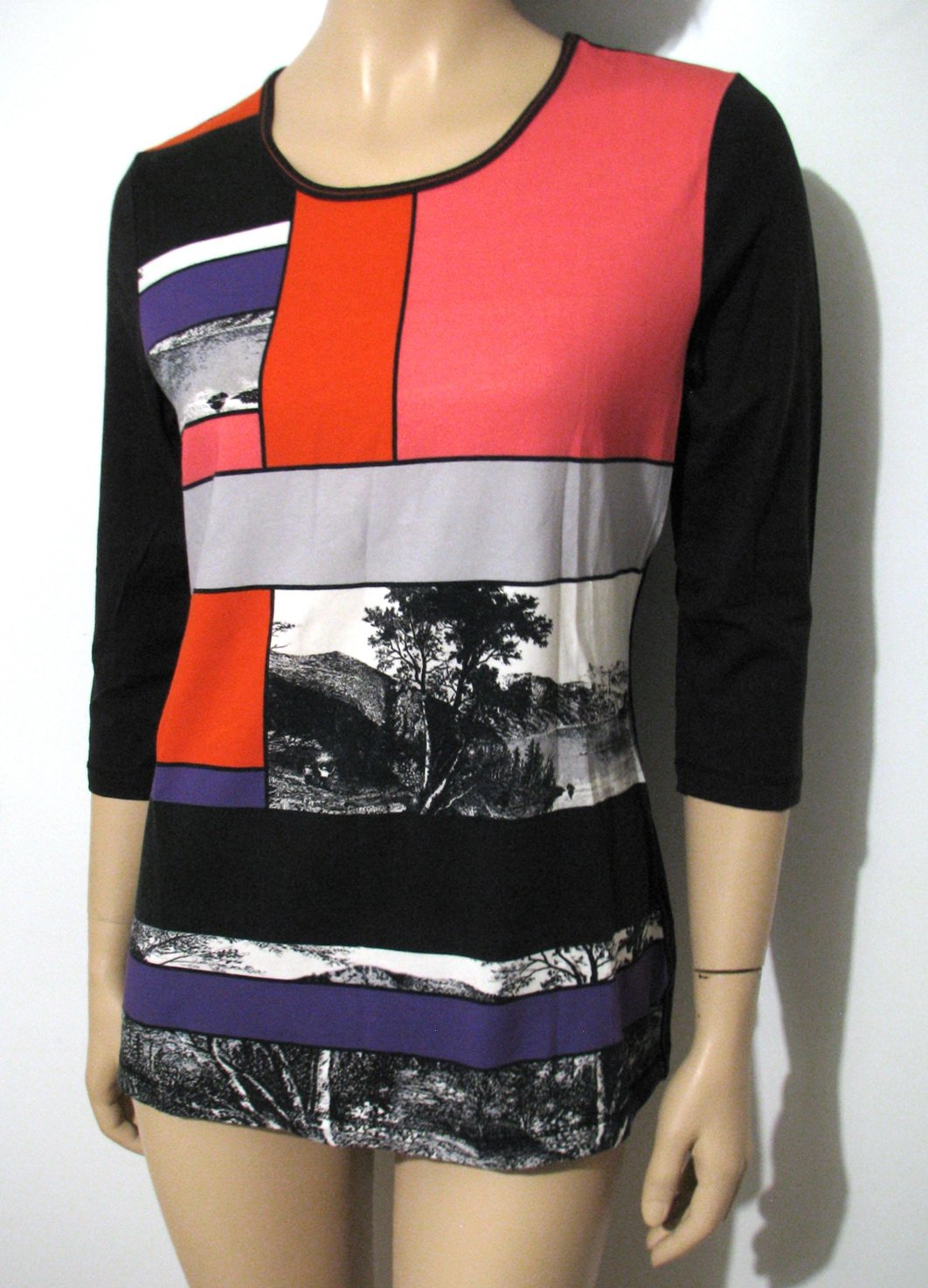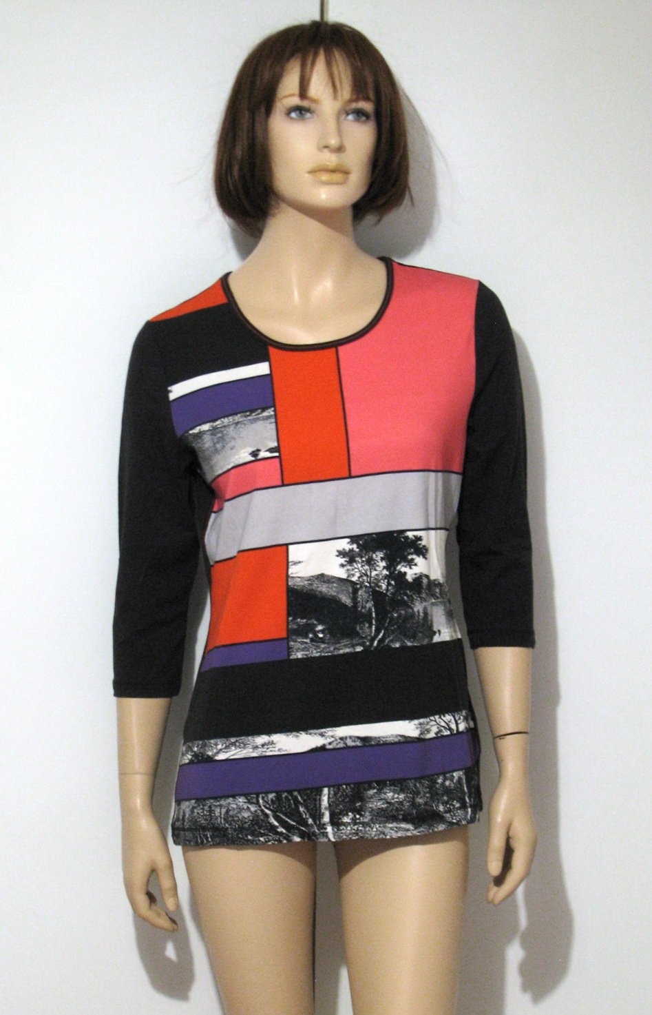 Pekné tričko s trojštvrťovými rukávmi, s farebným geometrickým vzorom, striedaným čiernobielymi obrázkami - fotkami krajiniek. Na zadnom dieli a rukávoch je takej takmer čiernej farby, no je v odtieni do hneda, nie je to sýta čierna. Nie je vyblednuté, je takej farby od výroby. Takmer nepoužité, výborne zachovalé, bez poškodení. Veľkosť píše 40 - 42, no myslím, že v pohode aj na M (figurína je S), v prípade záujmu premeriam.