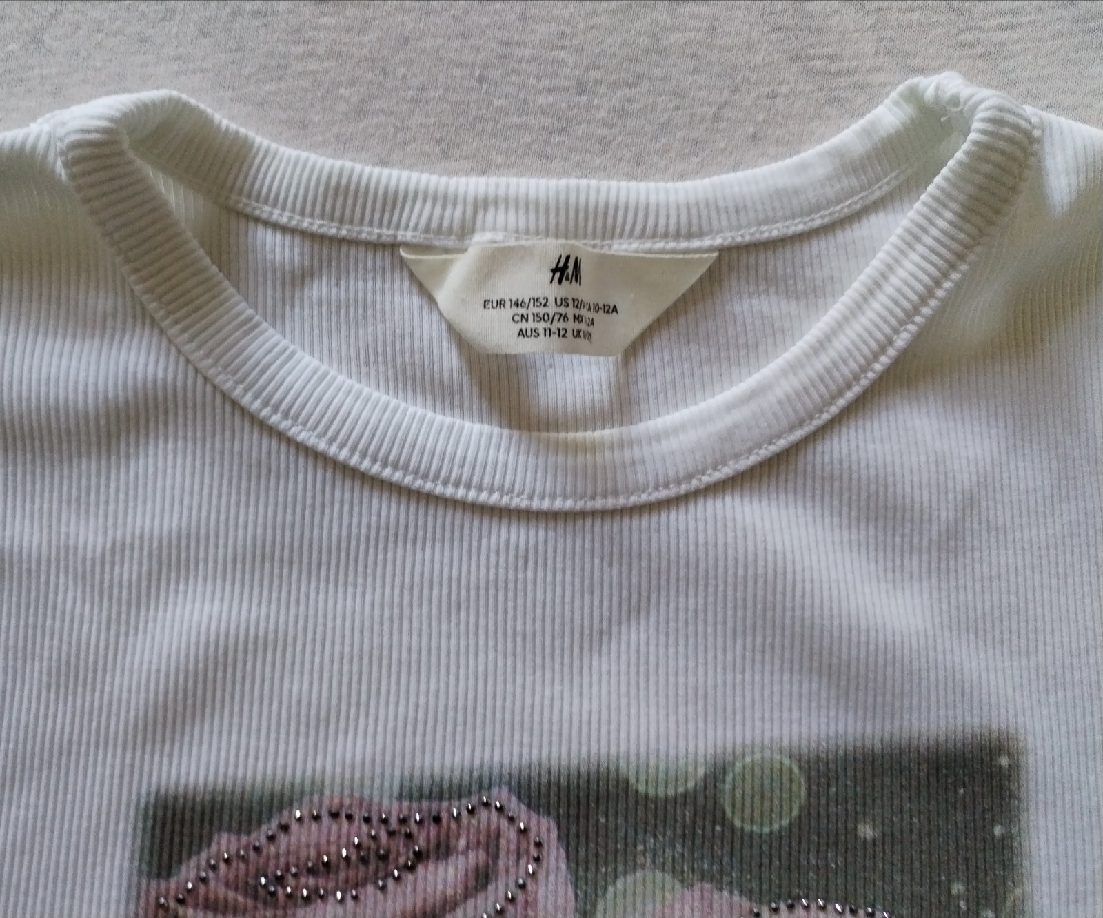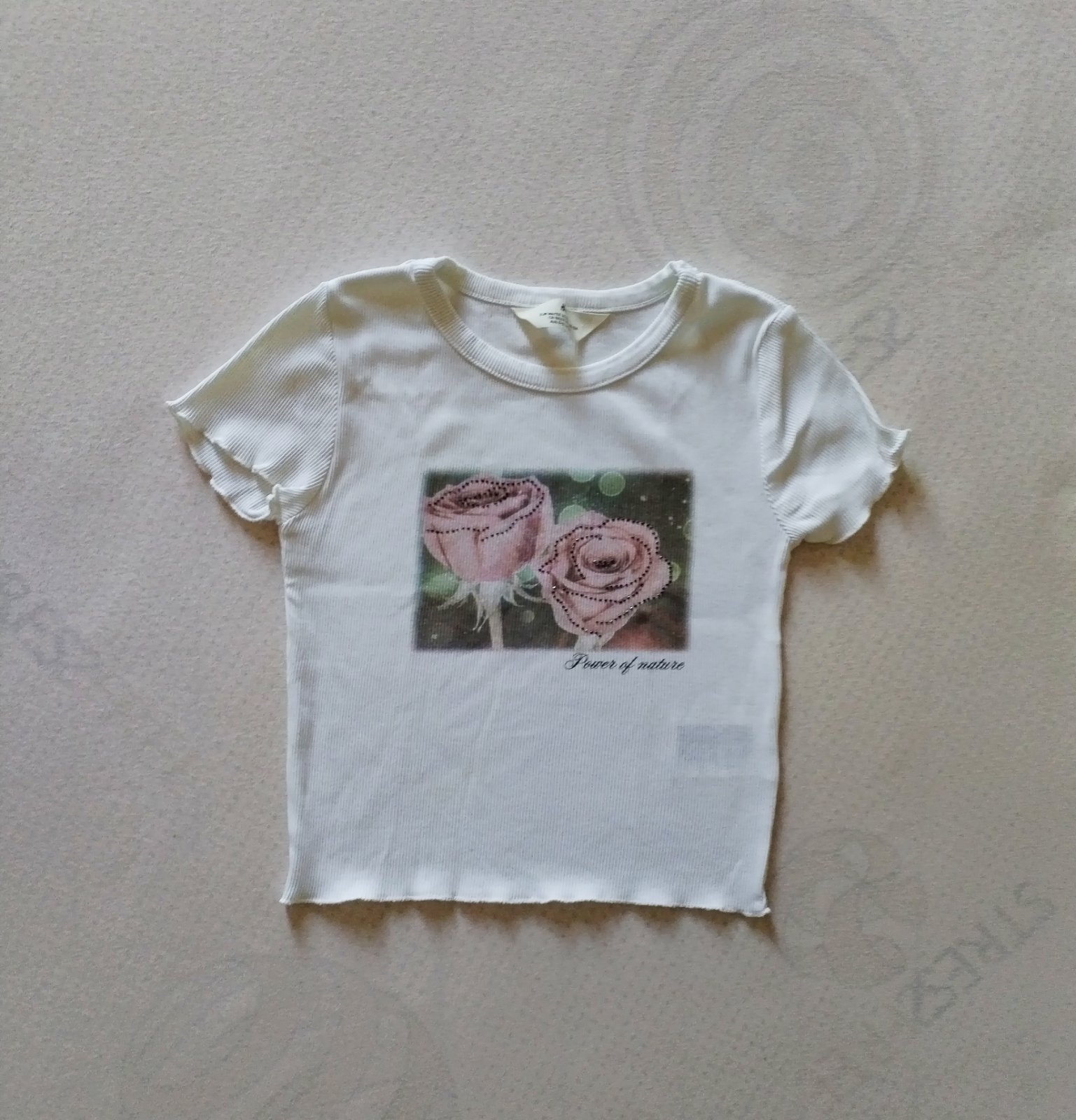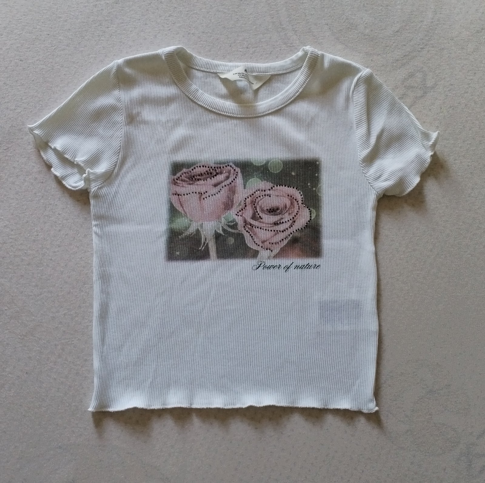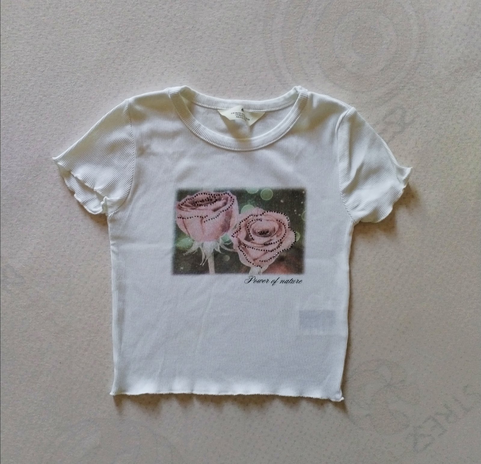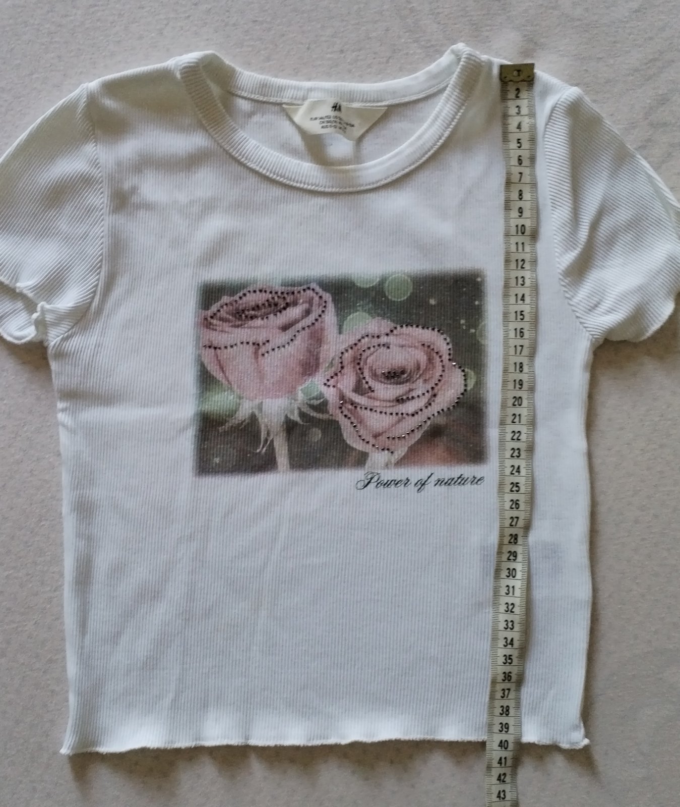 Krasne vrubkovane crop tričko s ružami, vel. uvedená 146/152, dcérka však nosila ako vel.134/140, potom boli veľmi krátke.