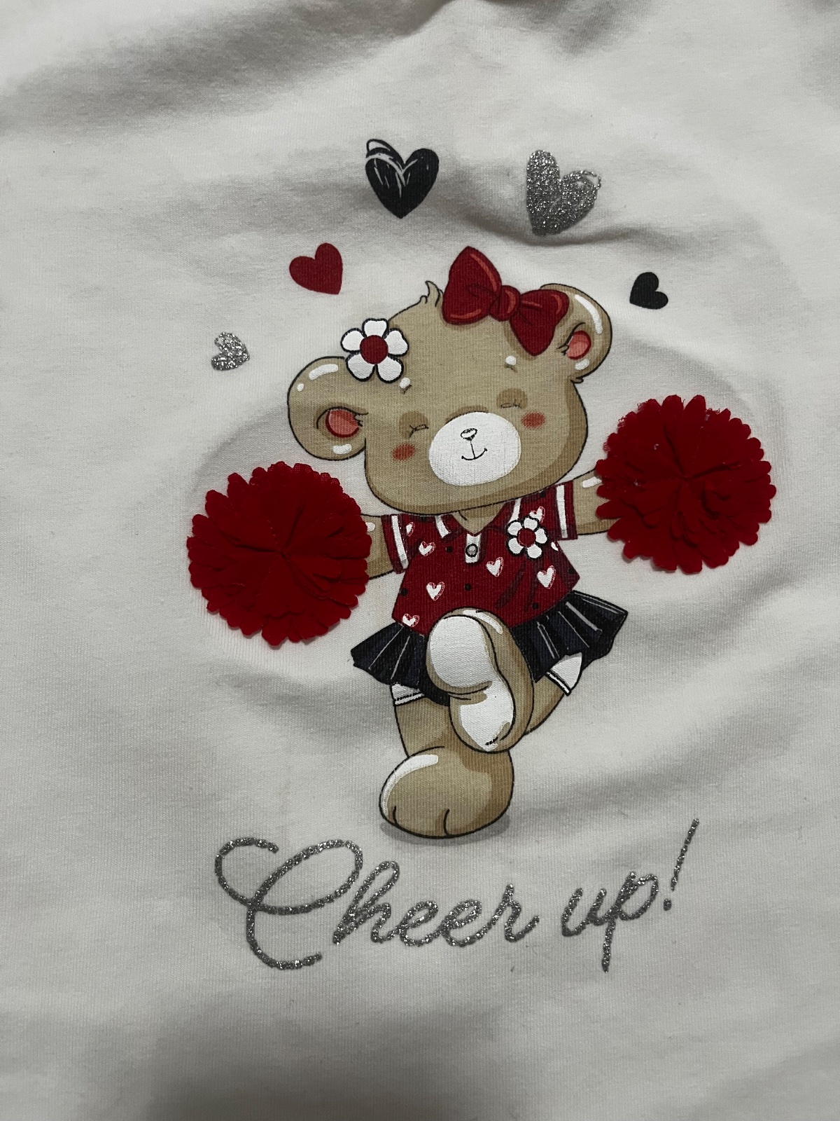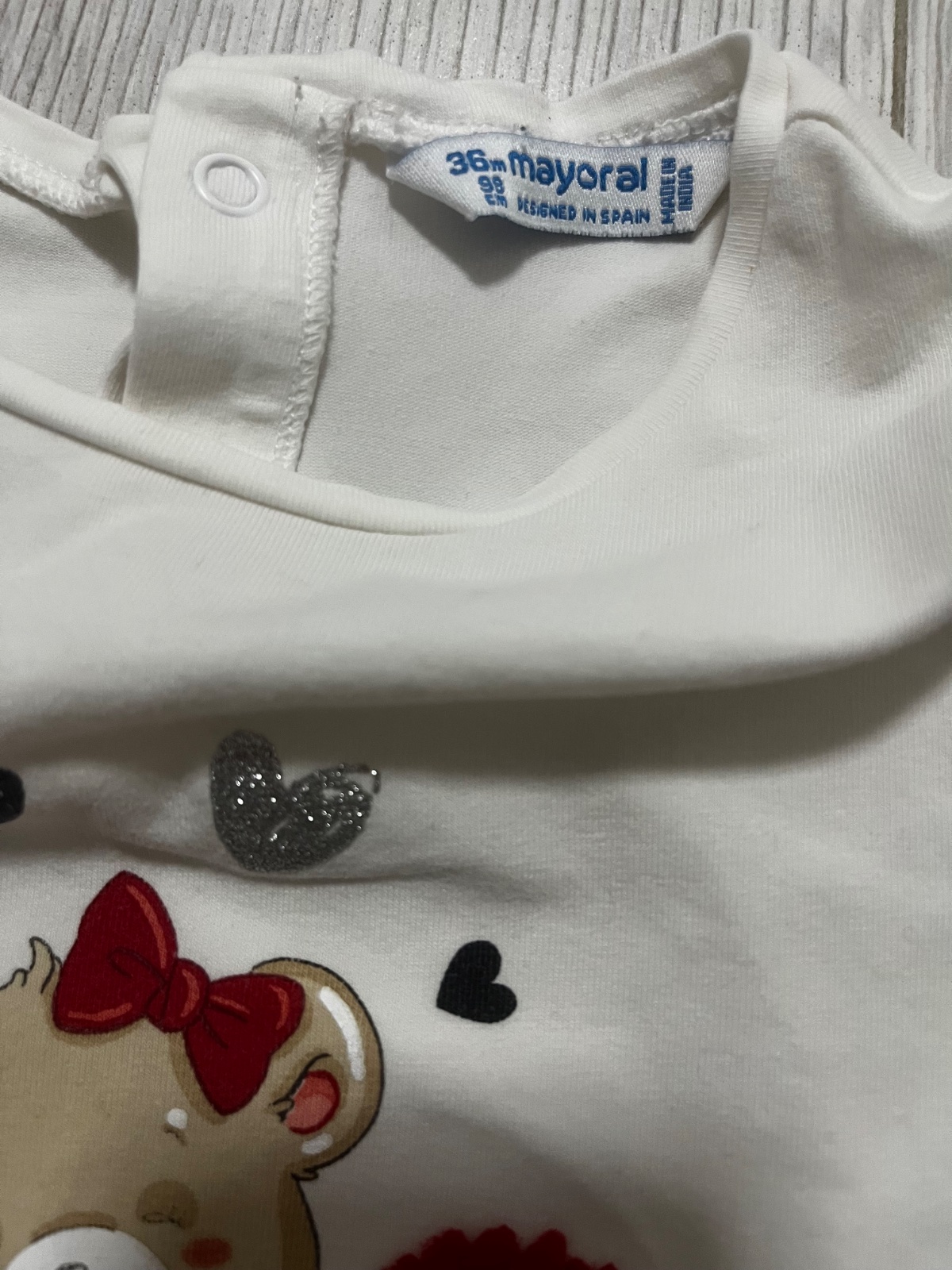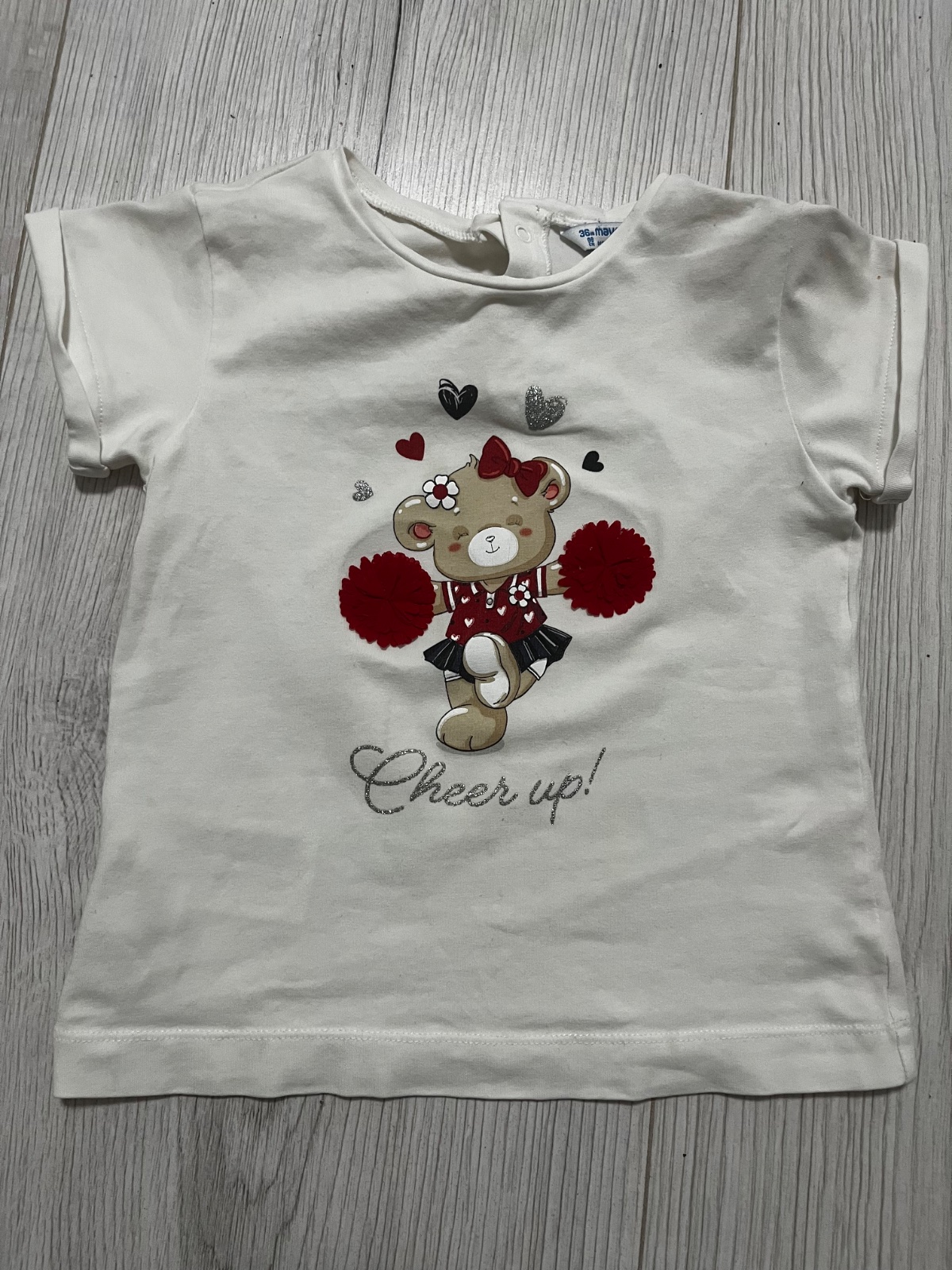 Predám biele kratkorukavove tričko s obrazkom tancujúceho medvedika. Tričko sa vzadu zapína na cvoky. Značka: Mayoral, veľkosť: 98.