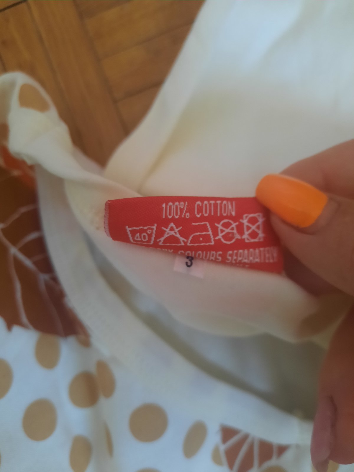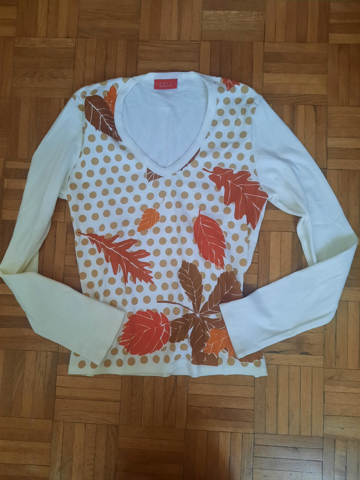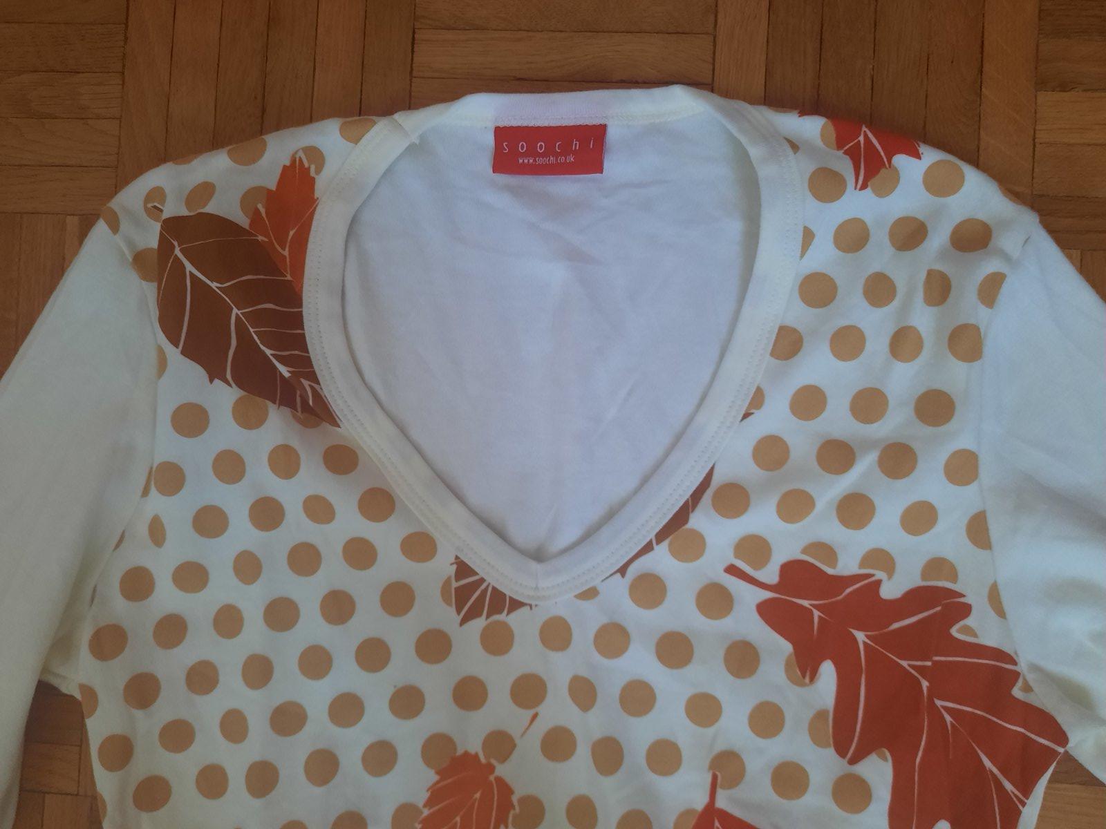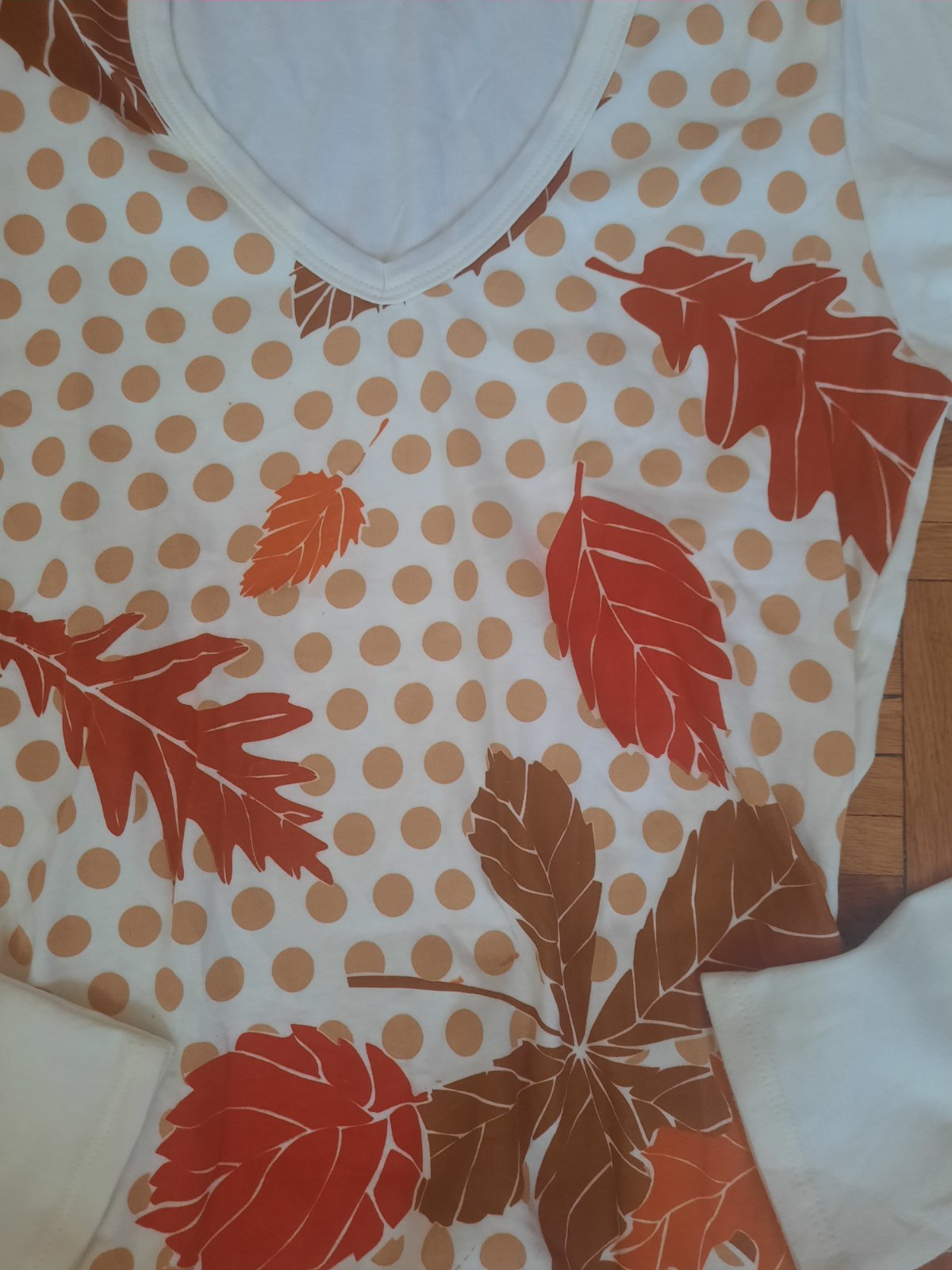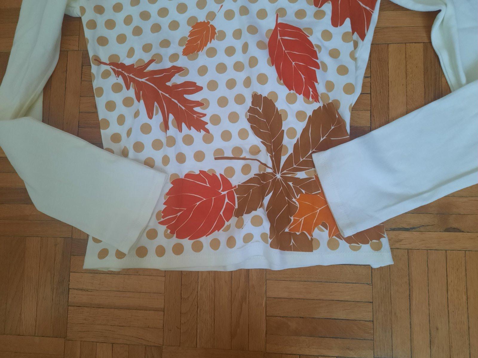 Super kvalitné bavlnené tričko s jesenným vzorom. Nebolo nosené, iba vypraté. Zadná časť je vzadu nariasená gumkou. Farba je bledunko maslová.