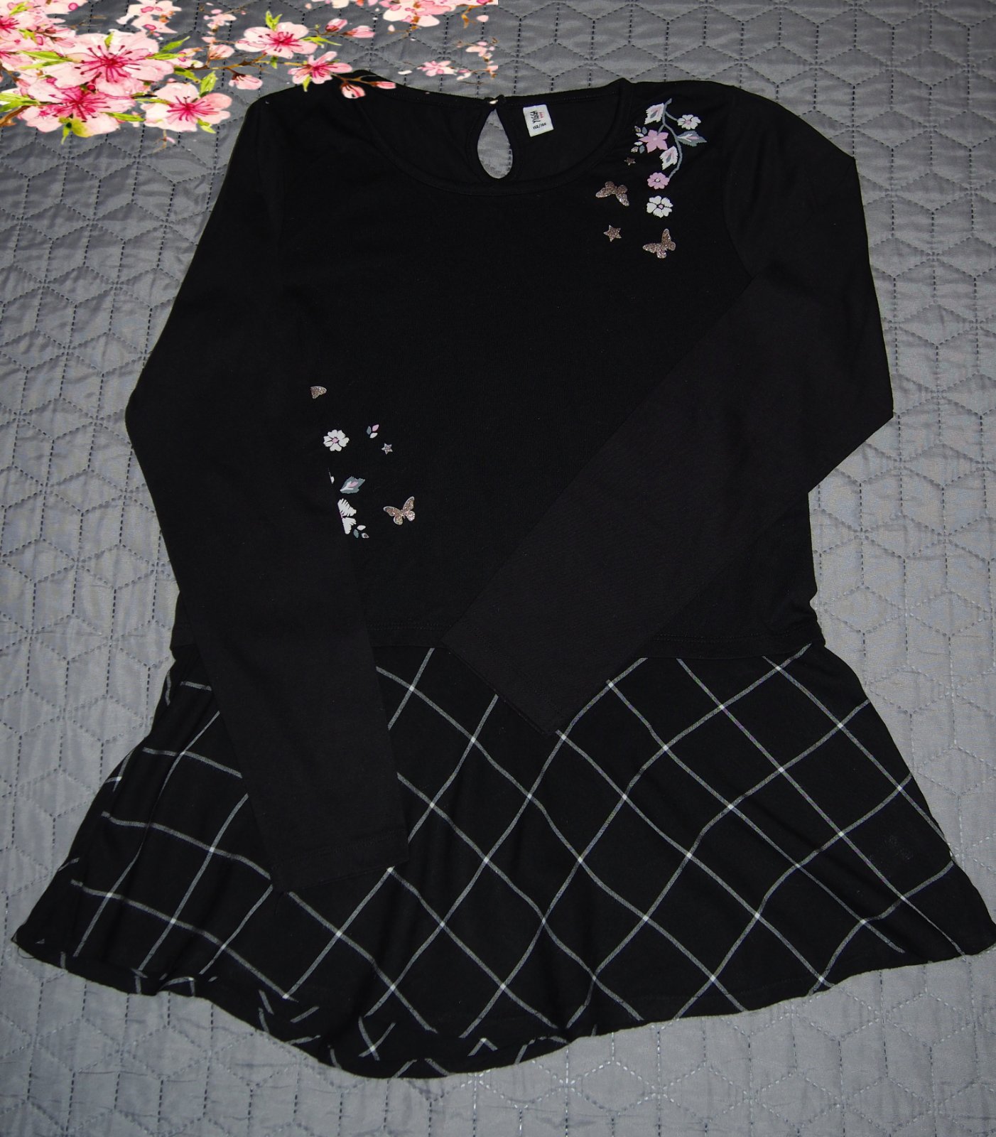 Dobrý stav (žmolky sa nájdu)! Dievčenské tričko s dlhým rukávom a vzorom a filtrami. Guma na spodku. Elastické. Materiál 57%bavlna,43%polyester. ROZMERY: dĺžka (meraná vzadu):60cm, dĺžka rukáv od ...