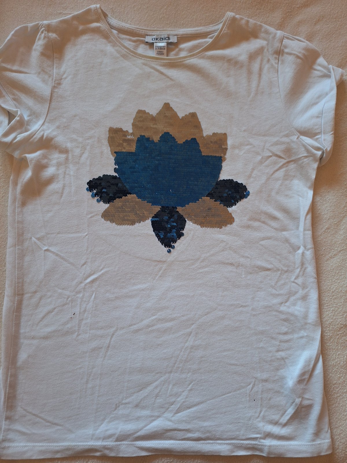Predám diev. tričko kr. rukáv bielej farby, s premieňacím motívom - kvet, strieborno modrej farby, zachovalé, bez poškodenia, veľkosť je písaná 152, ale my sme ho nosili skôr ako 146 veľ. cena 4 ,- € aj s poštovným