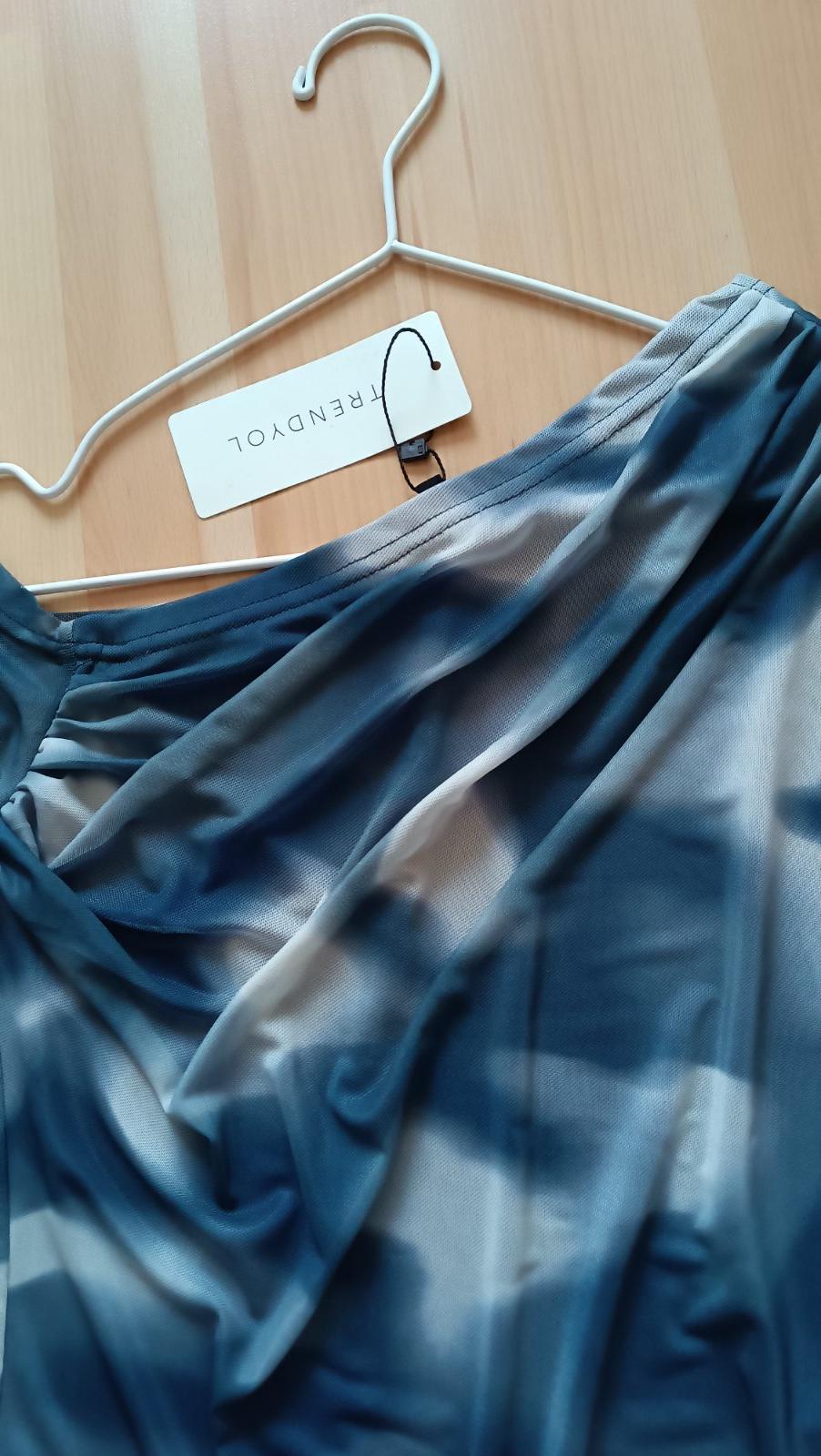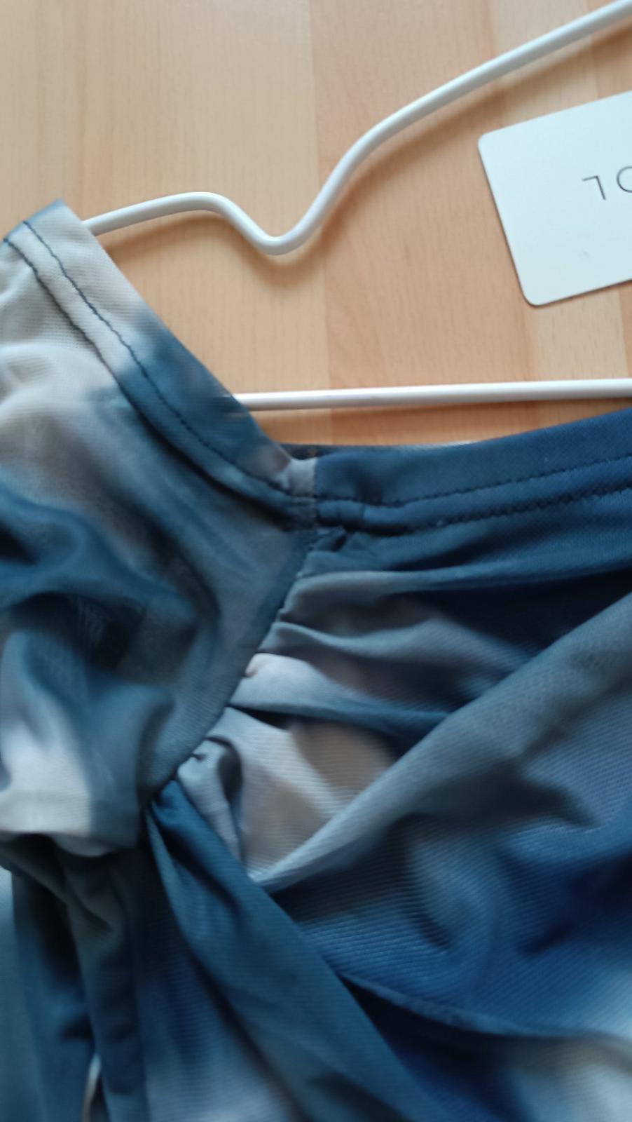 Trendyol, dĺžka 51cm, šírka 35cm, pod pazuchami 37cm, 94%polyester, 6%elastan, predná časť podšitá modrou látkou, farba modro-sivá