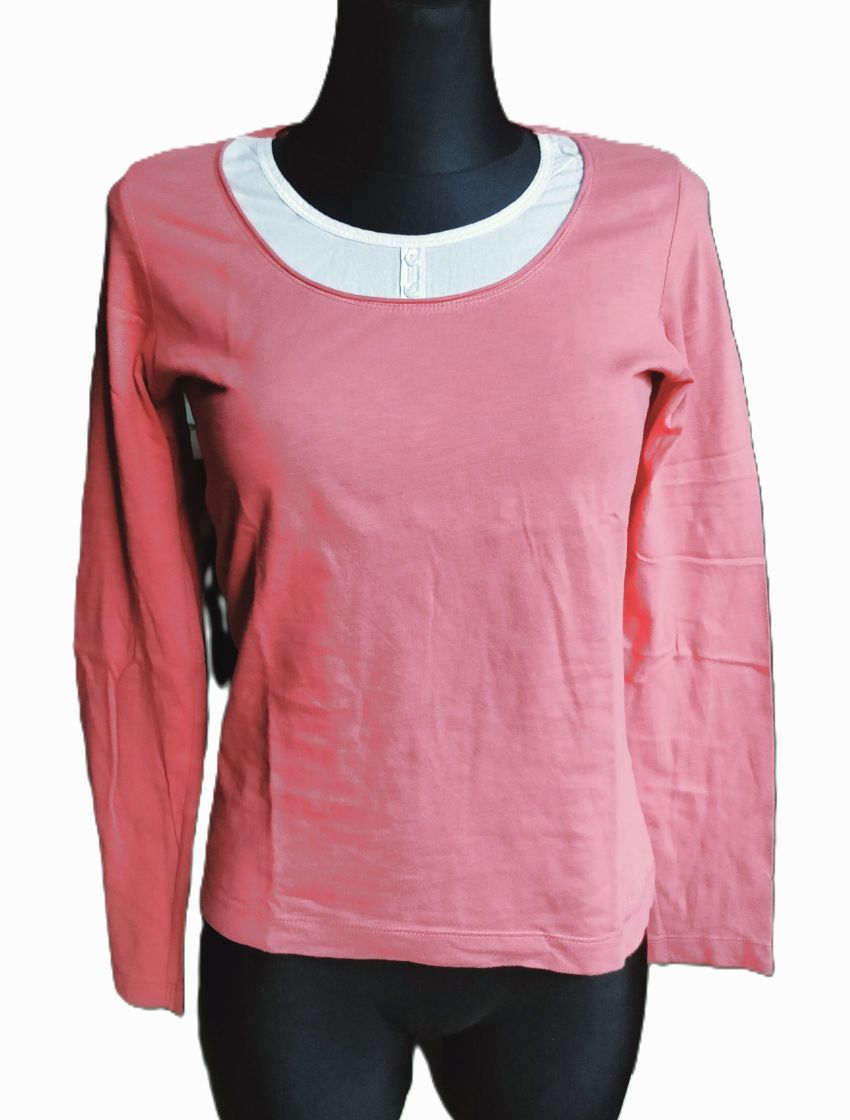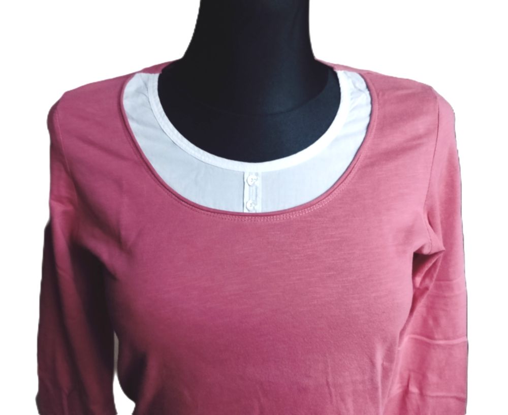 Krásne tričko zaujímavej svetlo tehlovej farby, elegantné vďaka bielej látke s gombičkami vo výstrihu. 100% bavlna, top stav, máličko nosené. Na požiadanie premeriam, ale sedí na M, menšie L.