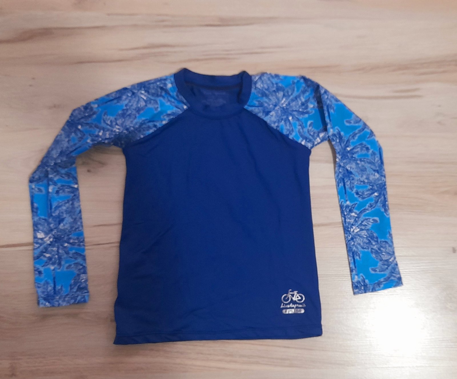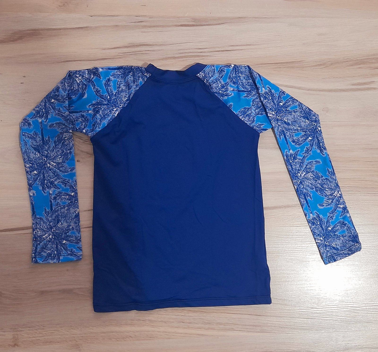 Modré športové tričko s tropickým vzorom na rukávoch.
